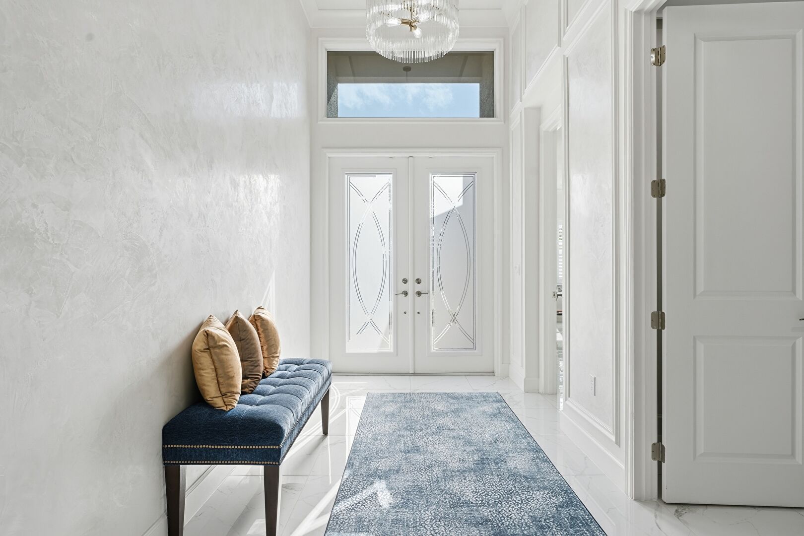 French Doors, Natural Light, Notable Chandelier, Textured Wall, Marble Finish Floor
