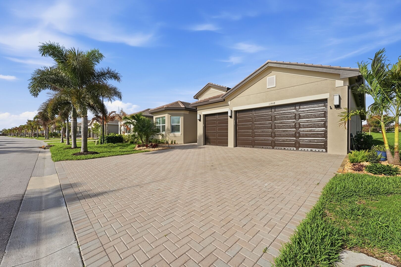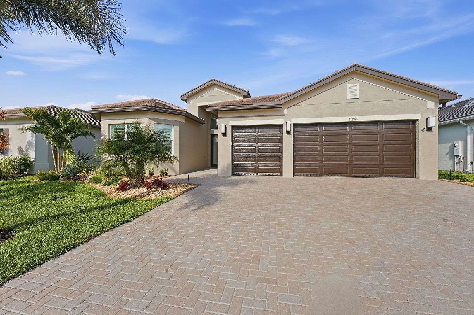 Downspout, Driveway, French Doors, Lawn, Pad Mount Transformer, Stucco Siding, Tile Roof, Driveway, Gutters, Tile Roof, Water Meter