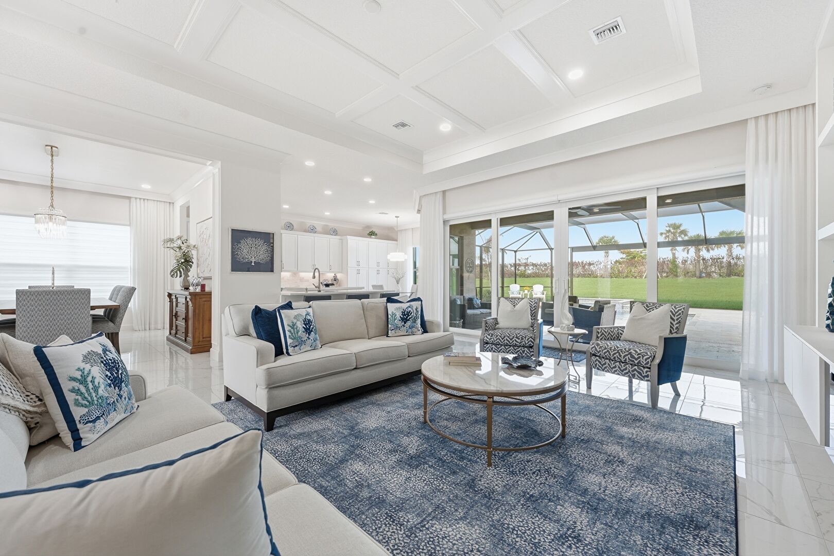 Baseboards Wall, Beamed Ceiling, Built In Shelves, Coffered Ceiling, Crown Molding, Drywall, Fireplace, French Doors, High Ceiling, Marble Finish Floor, Natural Light, Recessed Lighting, Sunroom, Vent, Coffered Ceiling, Crown Molding, Natural Light, Vent