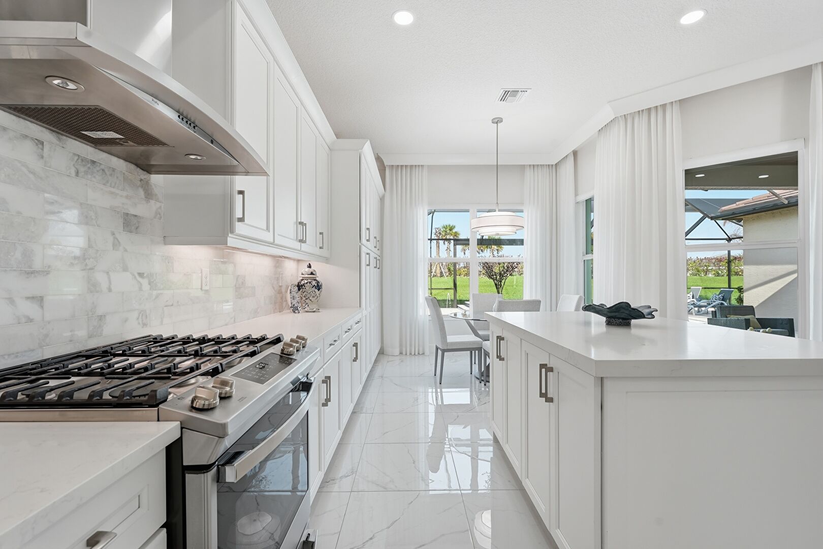 Beamed Ceiling, Coffered Ceiling, Crown Molding, Crown Molding Cabinets, Drywall, Grill, Kitchen Bar, Kitchen Island, Kitchen Peninsula, L Shaped Kitchen, Marble Finish Floor, Natural Light, Opens To Living Area, Pendant Lighting, Recessed Lighting, Shaker Cabinets, Stone Countertops, U Shaped Kitchen, Vent, Crown Molding Cabinets, Natural Light, Recessed Lighting