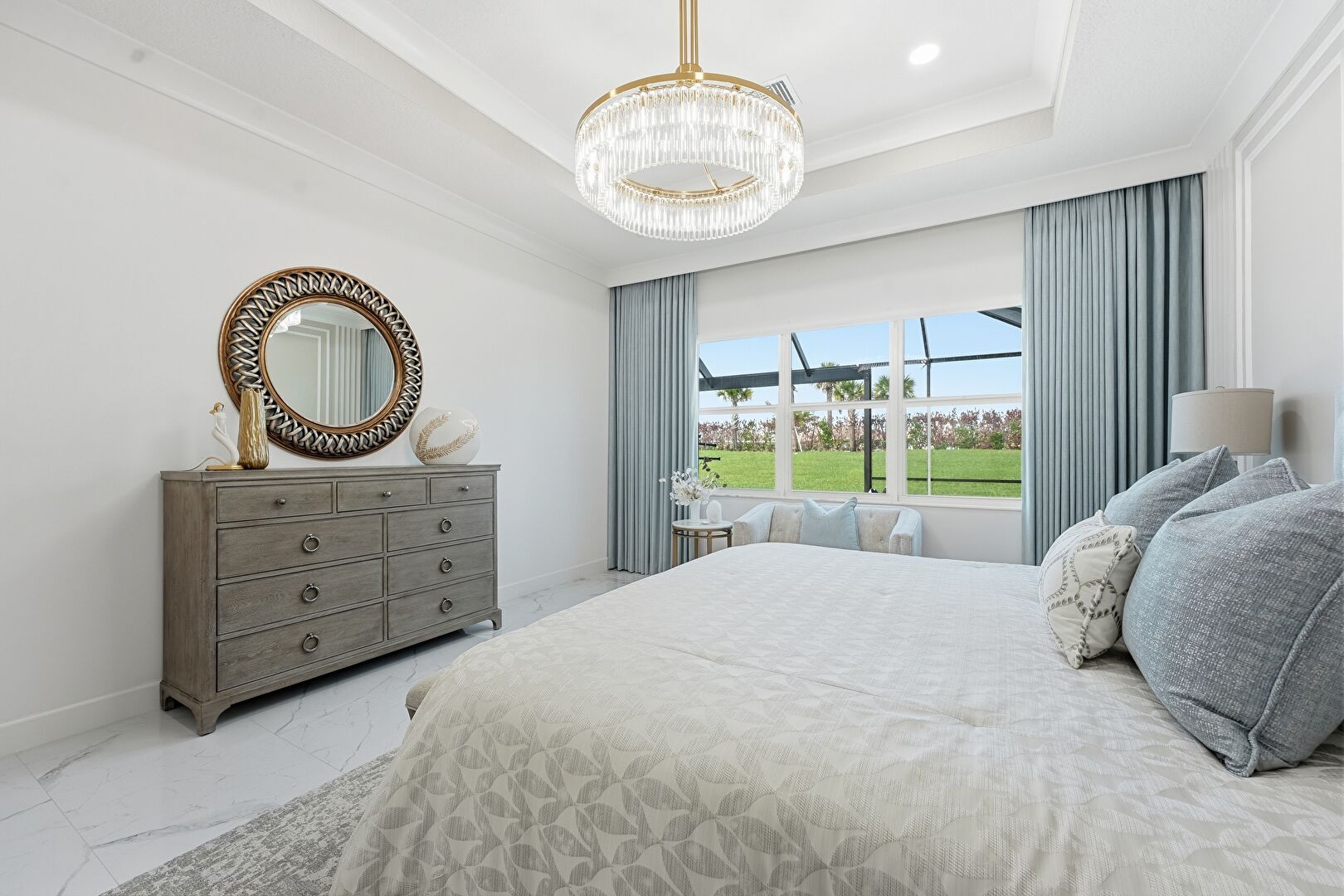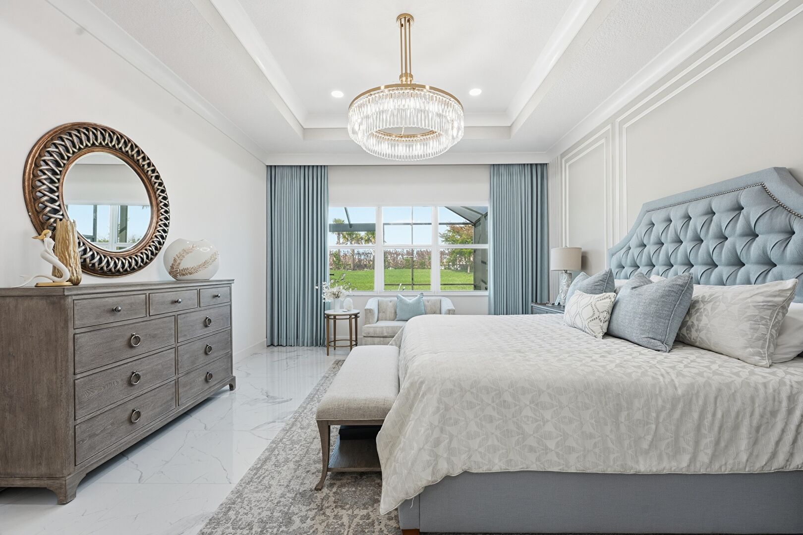 Baseboards Wall, Crown Molding, Drywall, Ensuite Bathroom, Marble Finish Floor, Natural Light, Notable Chandelier, Paneling Wall, Recessed Lighting, Tray Ceiling, Vent, Natural Light, Recessed Lighting