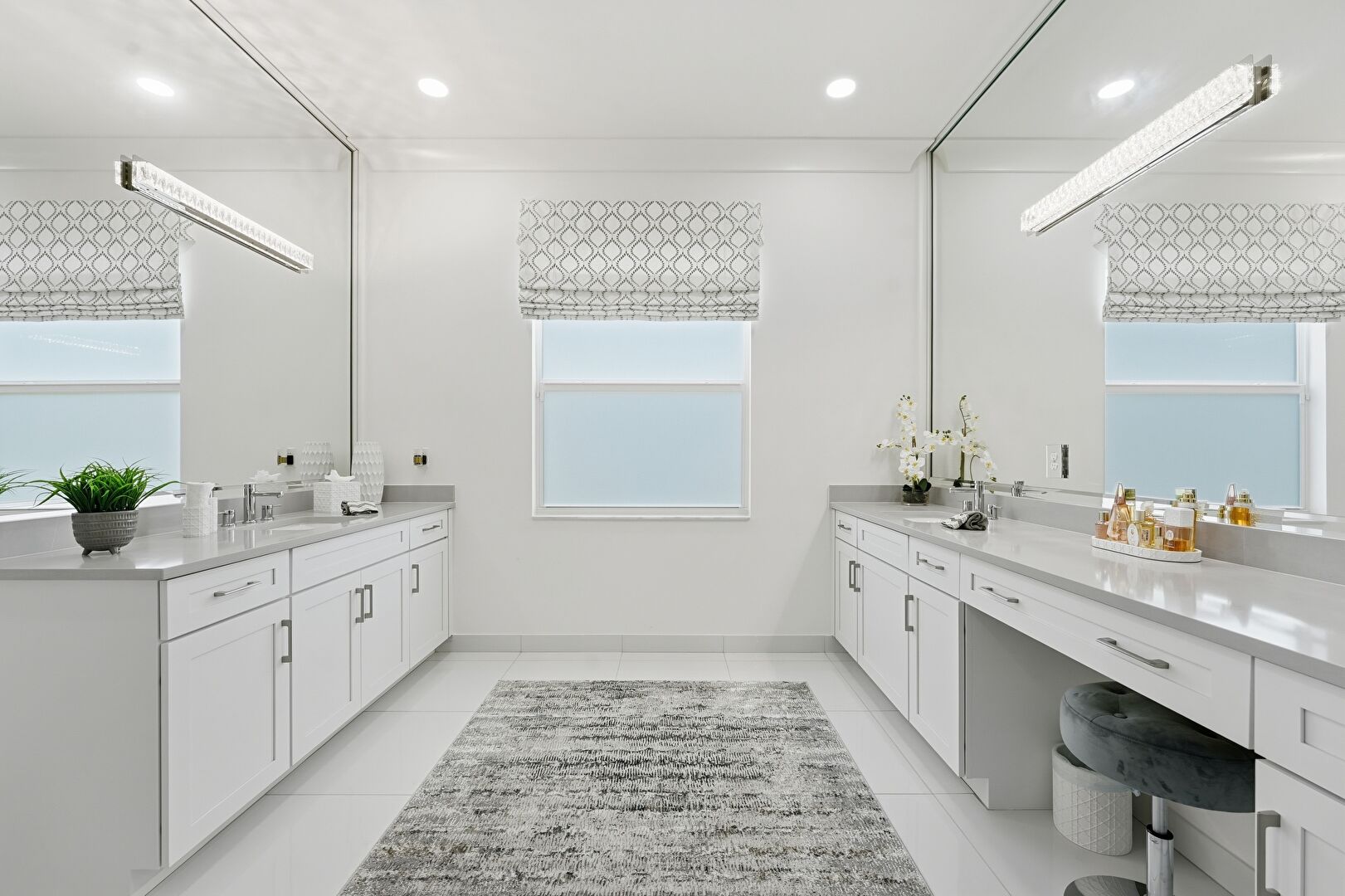 Baseboards Wall, Crown Molding, Drywall, Full Bathroom, Natural Light, Recessed Lighting, Tile Floor, Two Single Vanities, Vanity, Vent, Drywall, Tile Floor