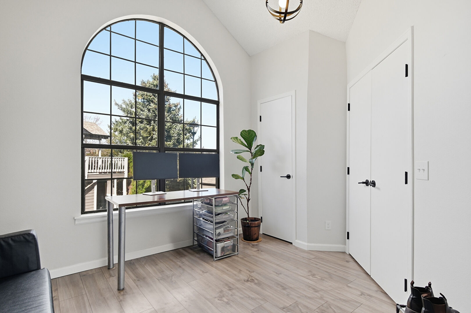 Baseboards Wall, Drywall, High Ceiling, Office Area, Vaulted Ceiling, Vent, Wood Finish Floor, Natural Light, Wood Finish Floor