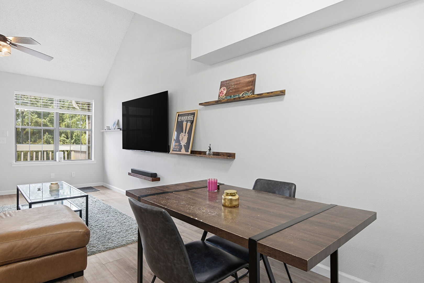 Baseboards Wall, Ceiling Fan, Drywall, Natural Light, Vent, Wood Finish Floor, Drywall, Vaulted Ceiling