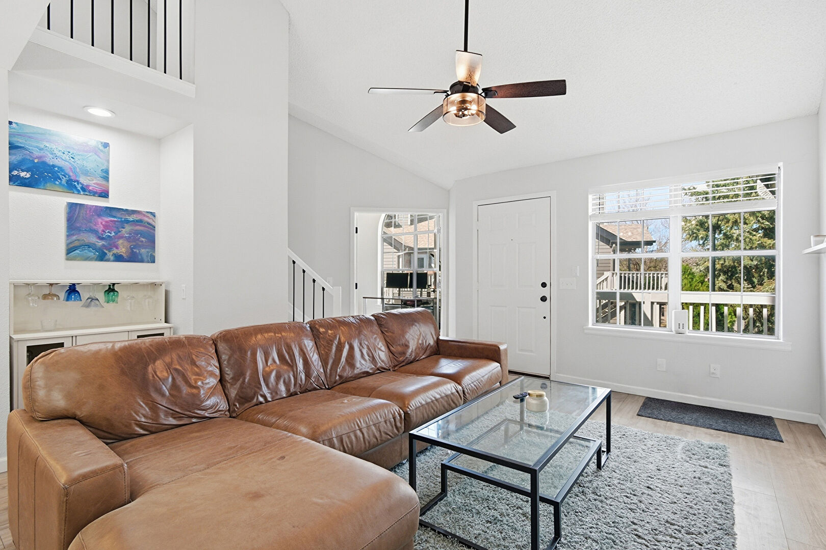Baseboards Wall, Ceiling Fan, Drywall, Galley Kitchen, High Ceiling, Natural Light, Recessed Lighting, Stairs, Vaulted Ceiling, Vent, Wood Finish Floor, Baseboards Wall, Ceiling Fan