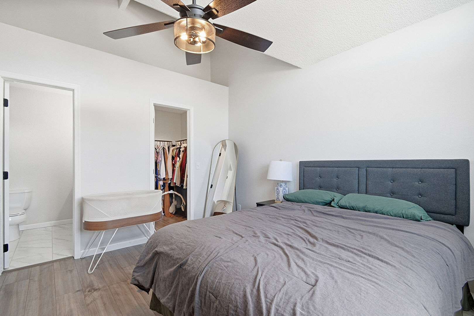 Baseboards Wall, Cathedral Ceiling, Ceiling Fan, Drywall, Ensuite Bathroom, Natural Light, Textured Ceiling, Vaulted Ceiling, Vent, Walk In Closet, Wood Finish Floor, Baseboards Wall, Walk In Closet, Wood Finish Floor