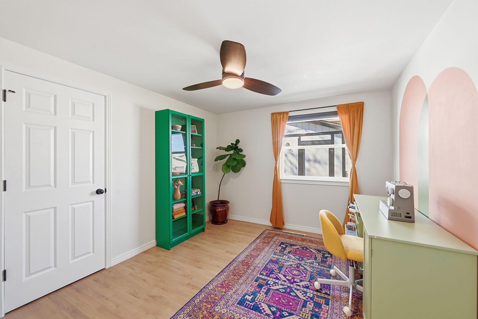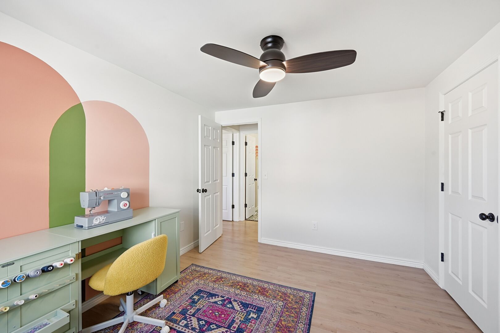 Baseboards Wall, Ceiling Fan, Drywall, Natural Light, Office Area, Wood Finish Floor, Ceiling Fan, Office Area