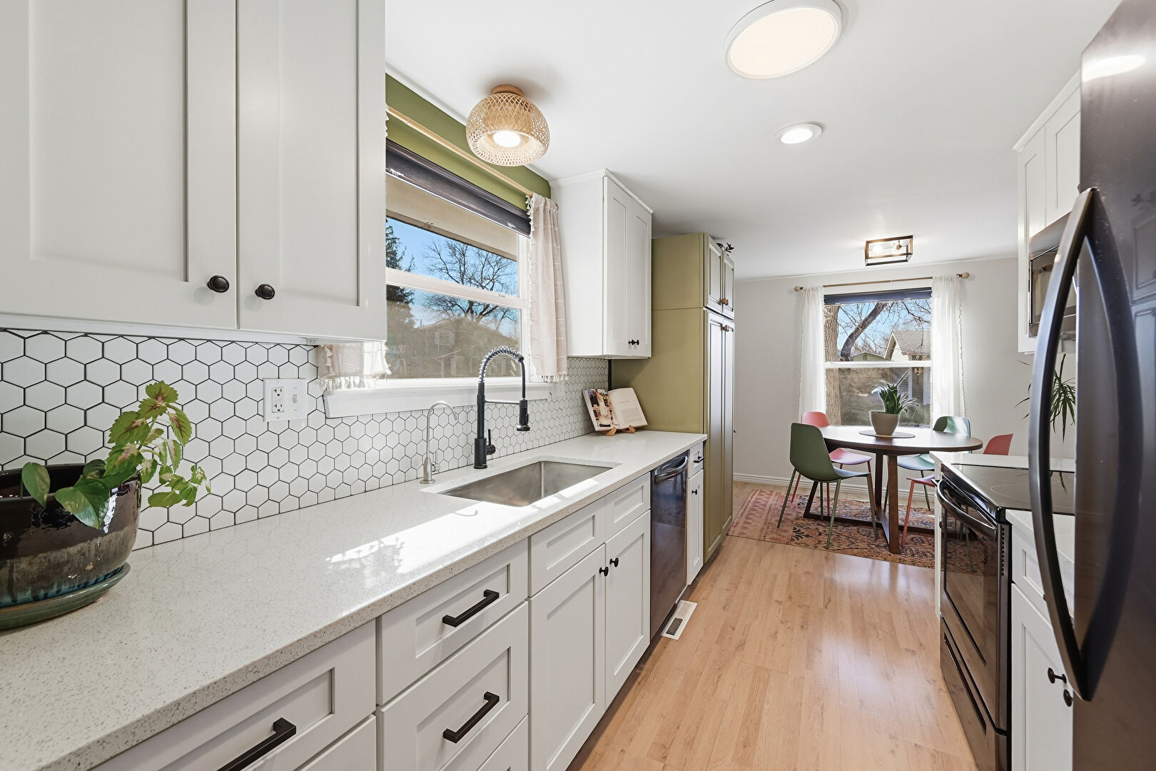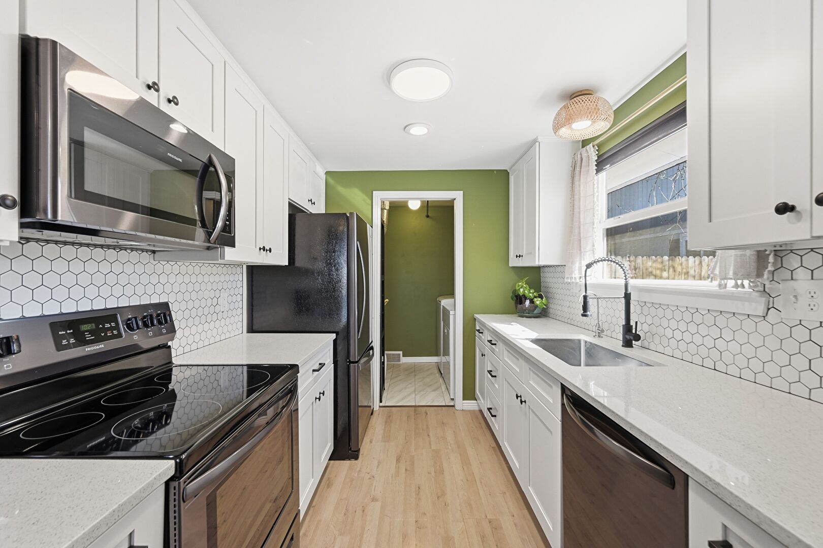 Baseboards Wall, Crown Molding Cabinets, Drywall, Galley Kitchen, Laundry, Natural Light, Recessed Lighting, Shaker Cabinets, Stone Countertops, Vent, Wood Finish Floor, Drywall, Stone Countertops, Wood Finish Floor