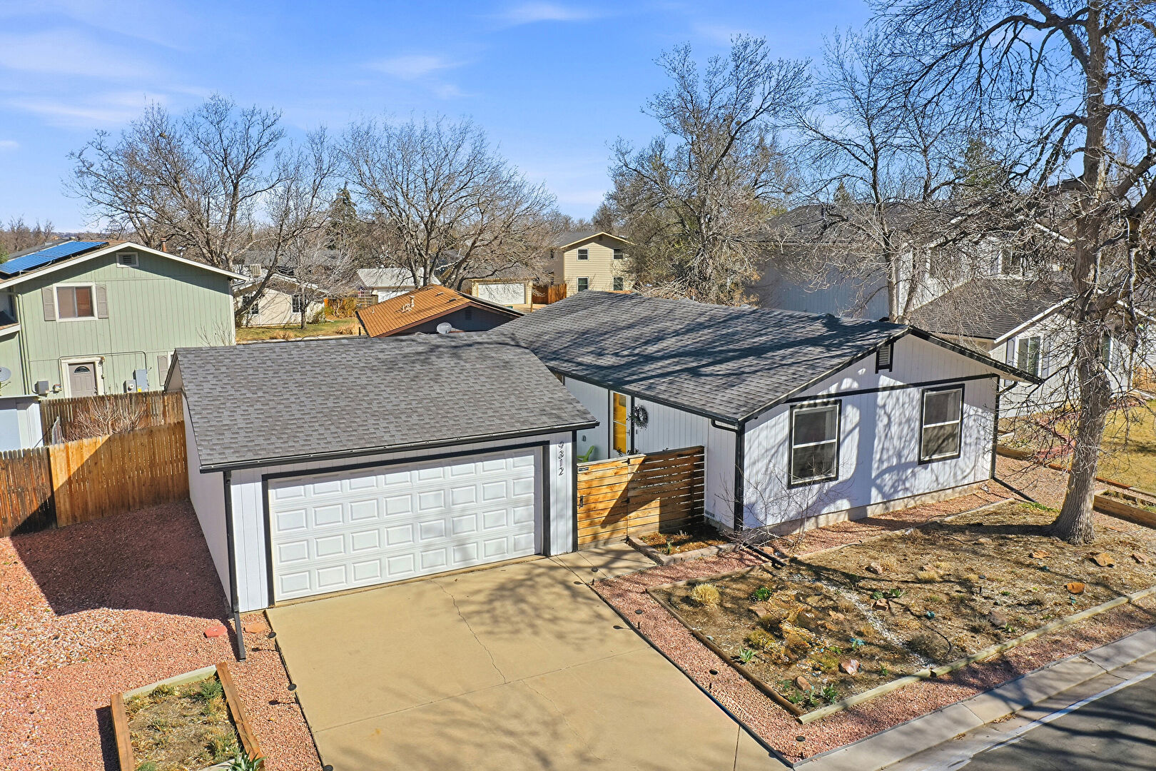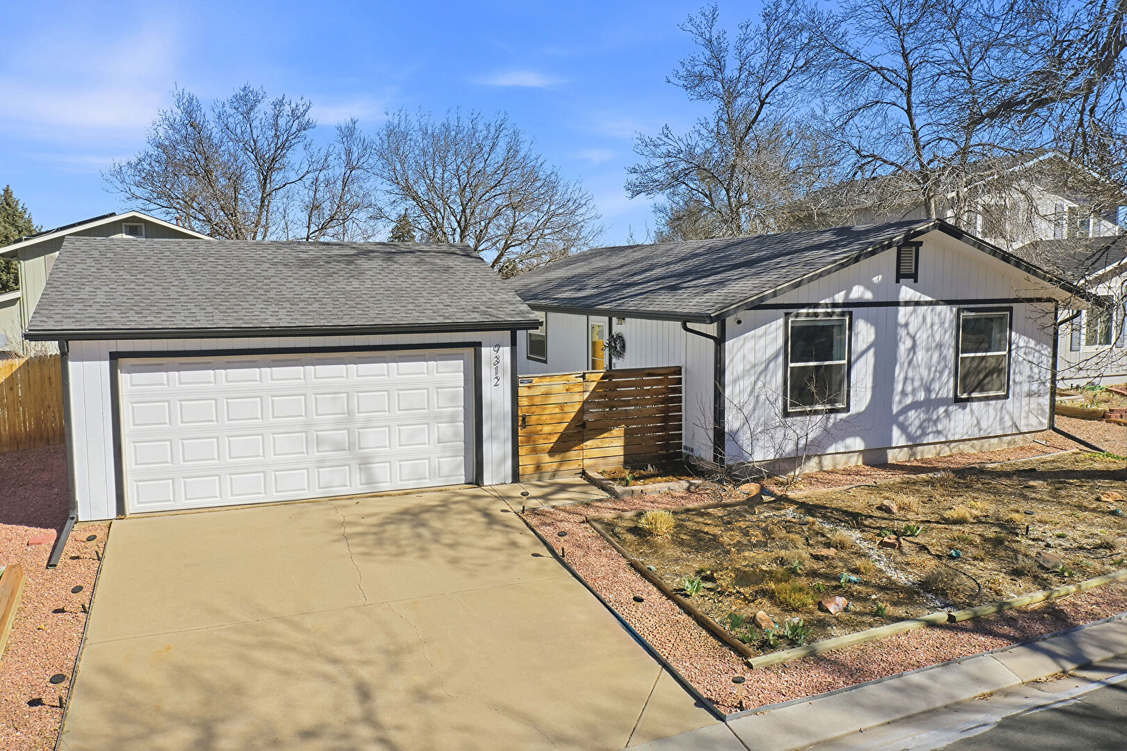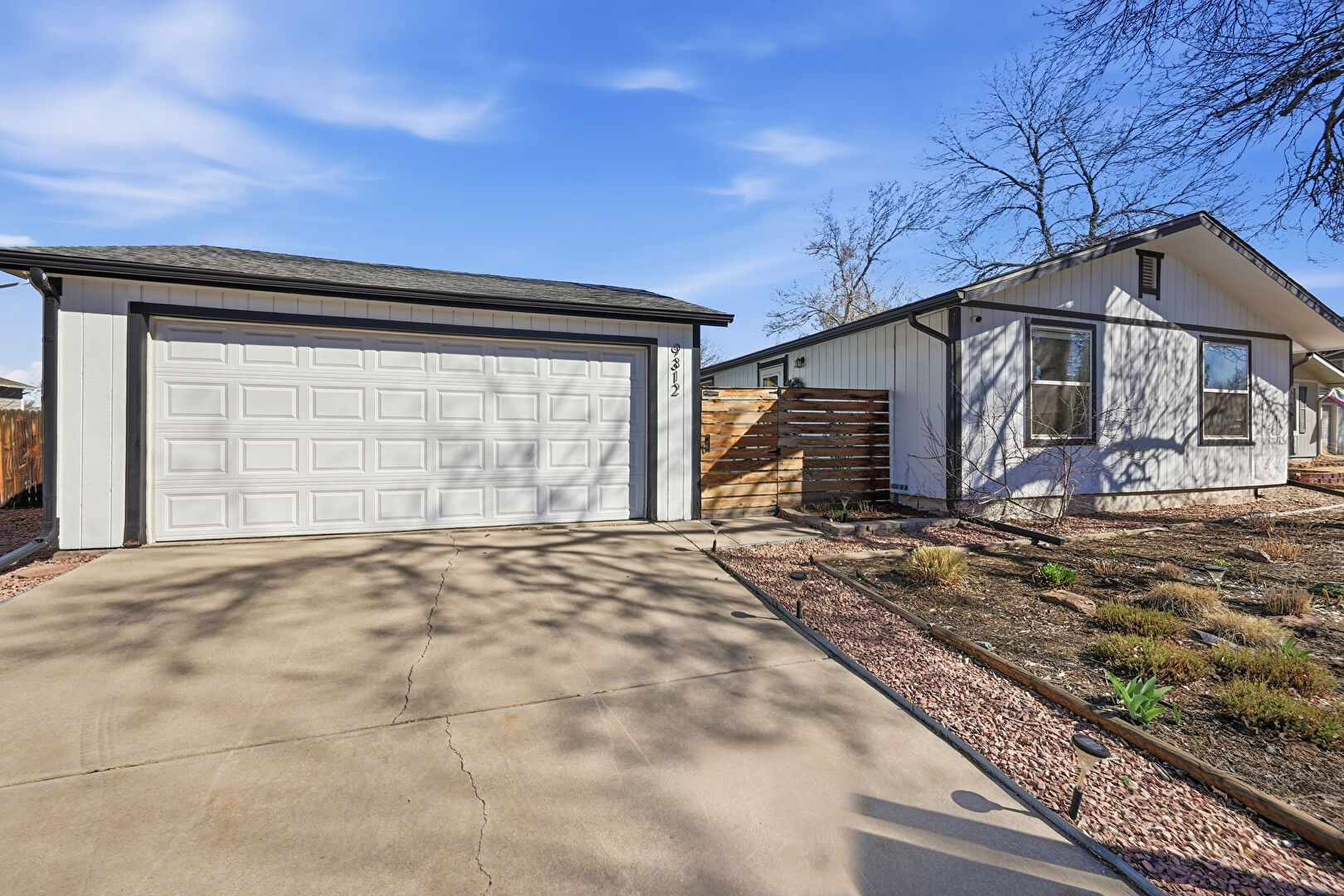 Concrete Foundation, Detached Garage, Downspout, Driveway, Fence, Garage, Gutters, Outdoor Structure, Residential View, Shingle Roof, Vertical Siding, Concrete Foundation, Detached Garage, Fence, Gutters, Vertical Siding