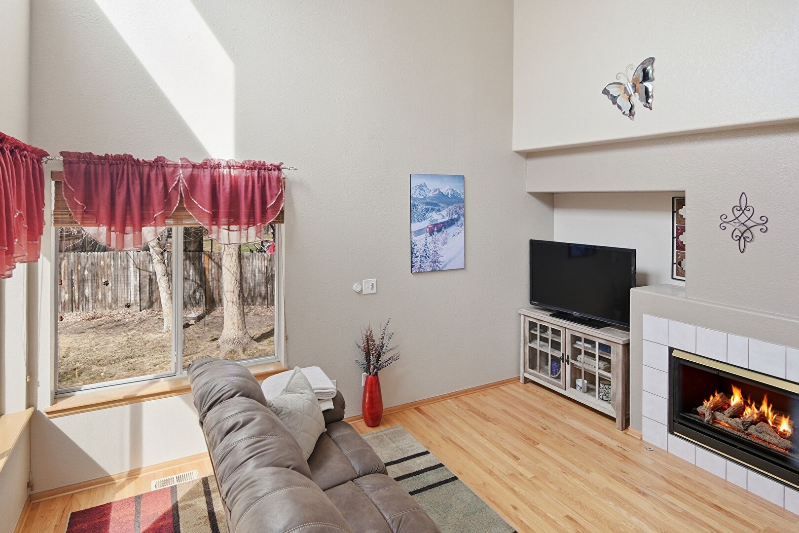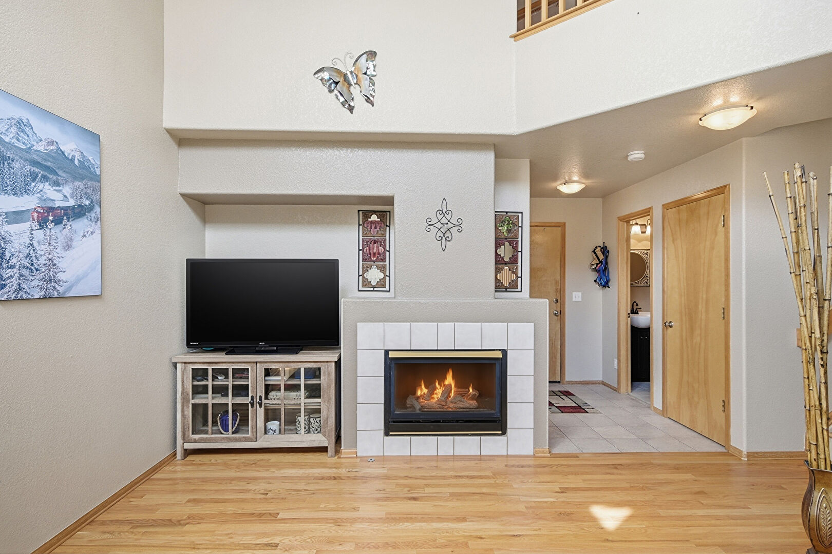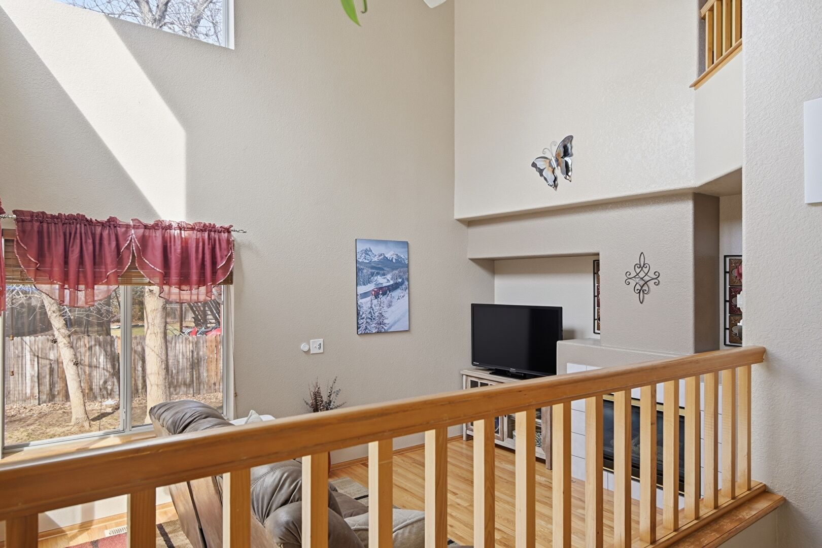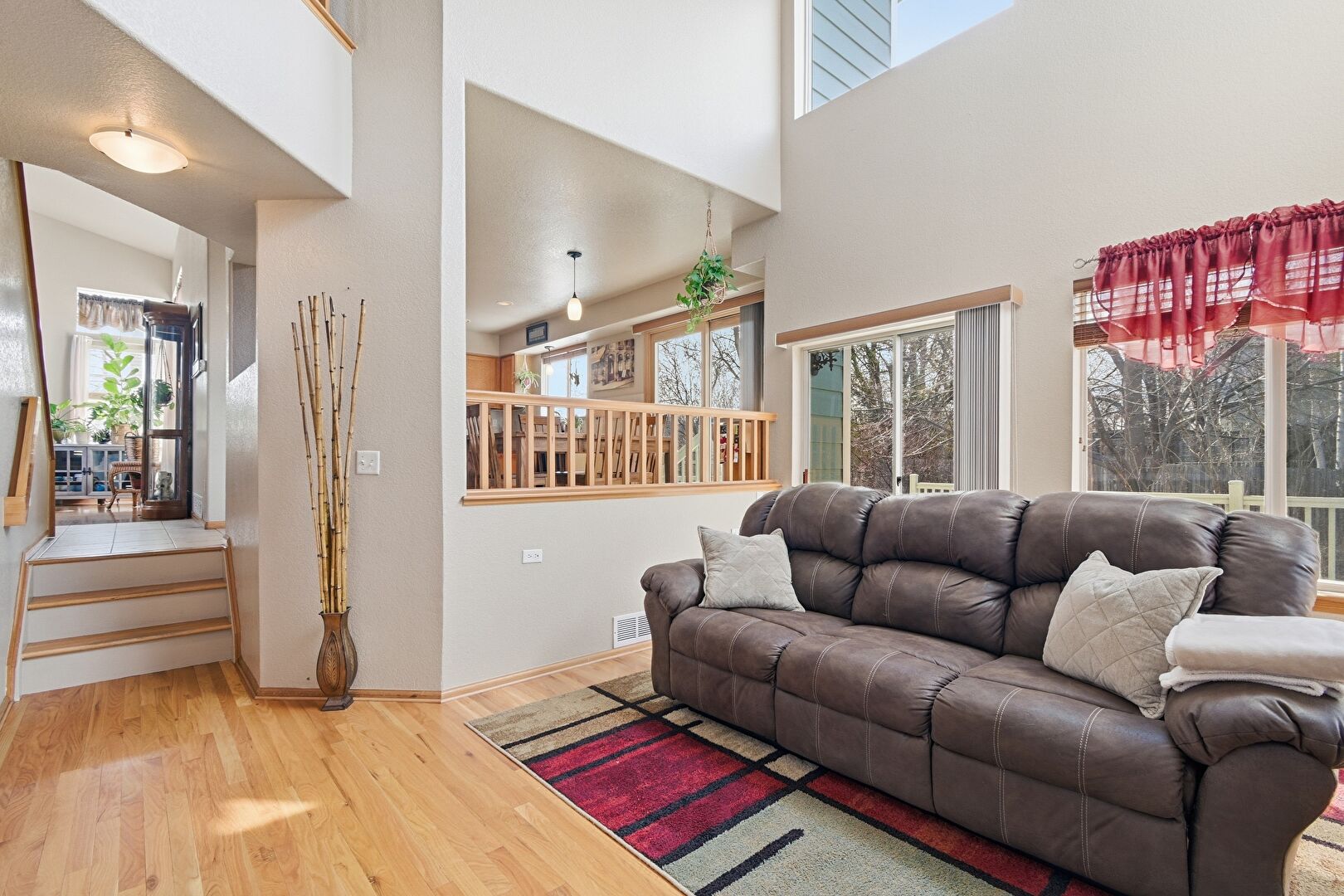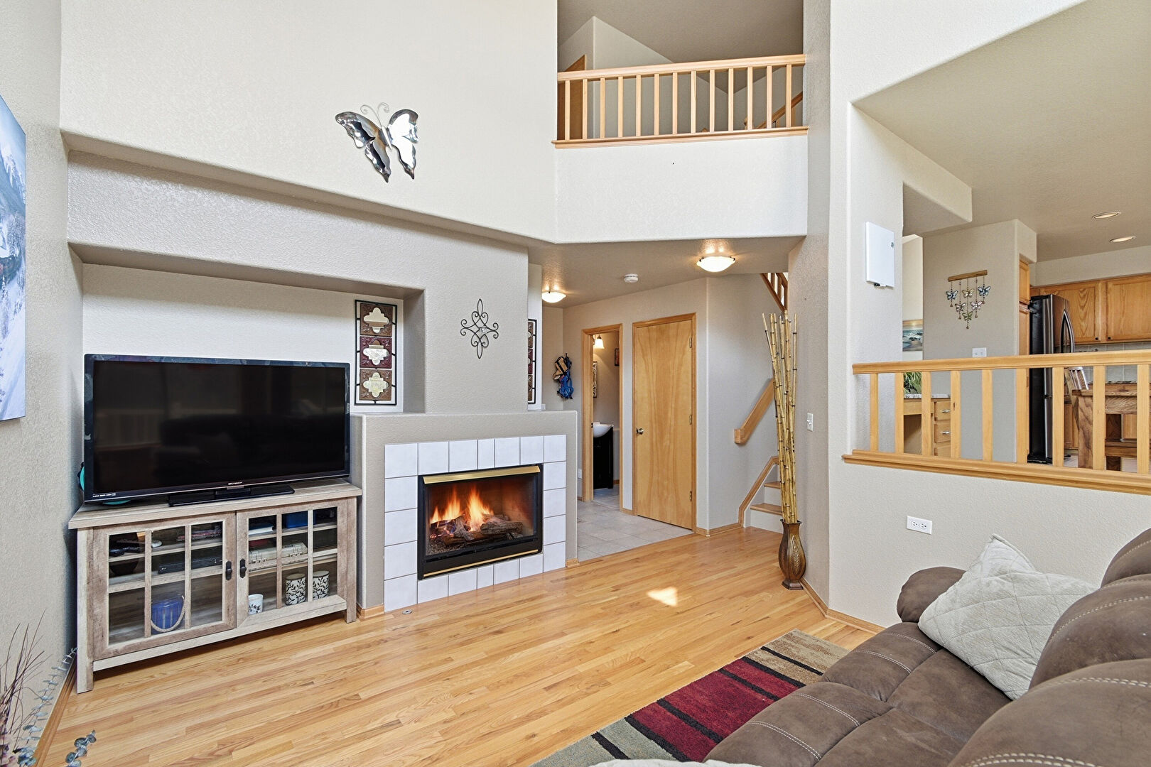 Baseboards Wall, Cathedral Ceiling, Drywall, Fireplace, High Ceiling, Natural Light, Recessed Lighting, Stairs, Tile Floor, Vaulted Ceiling, Vent, Wood Finish Floor, Baseboards Wall, Drywall, High Ceiling, Natural Light, Stairs, Vaulted Ceiling