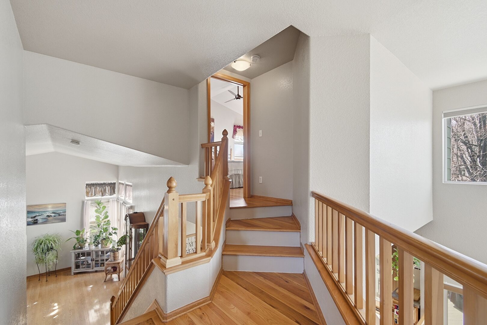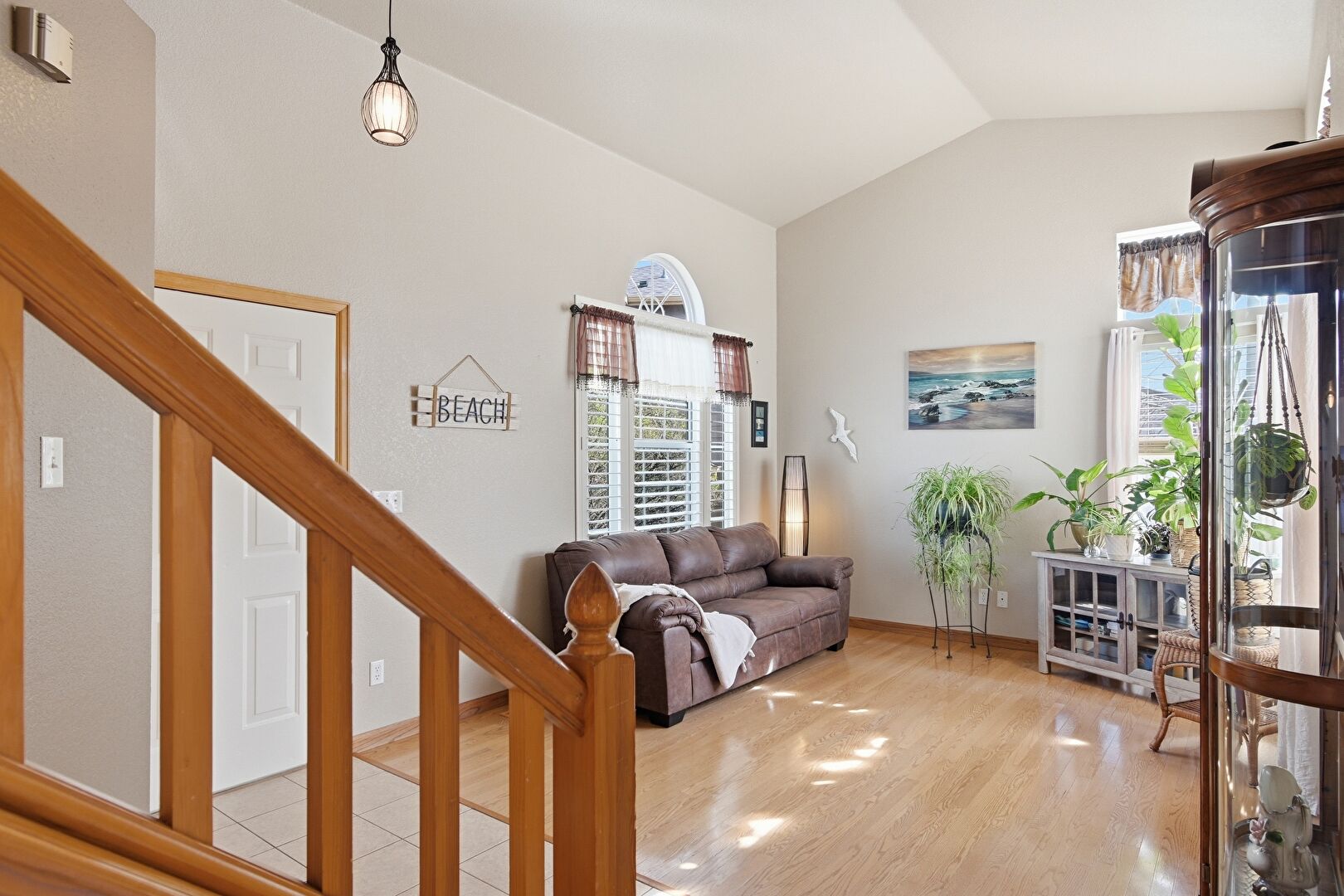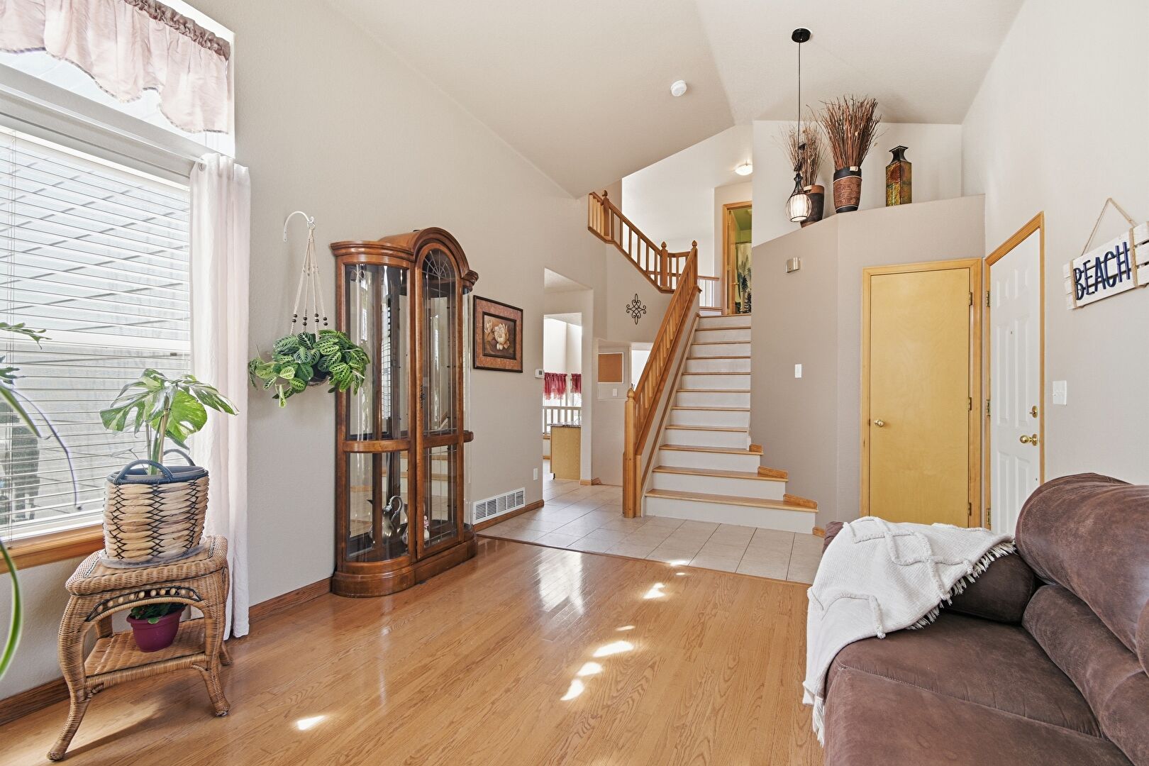 Drywall, High Ceiling, Natural Light, Stairs, Vaulted Ceiling, Vent, Wood Finish Floor, Baseboards Wall