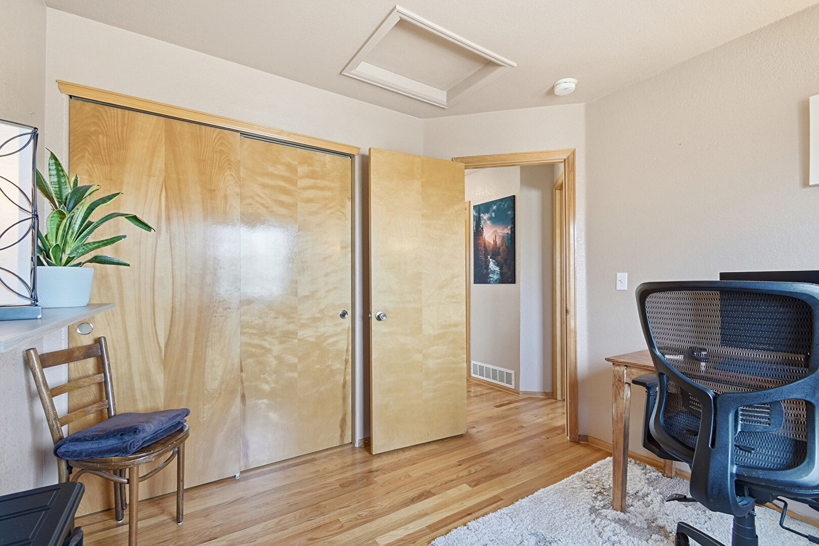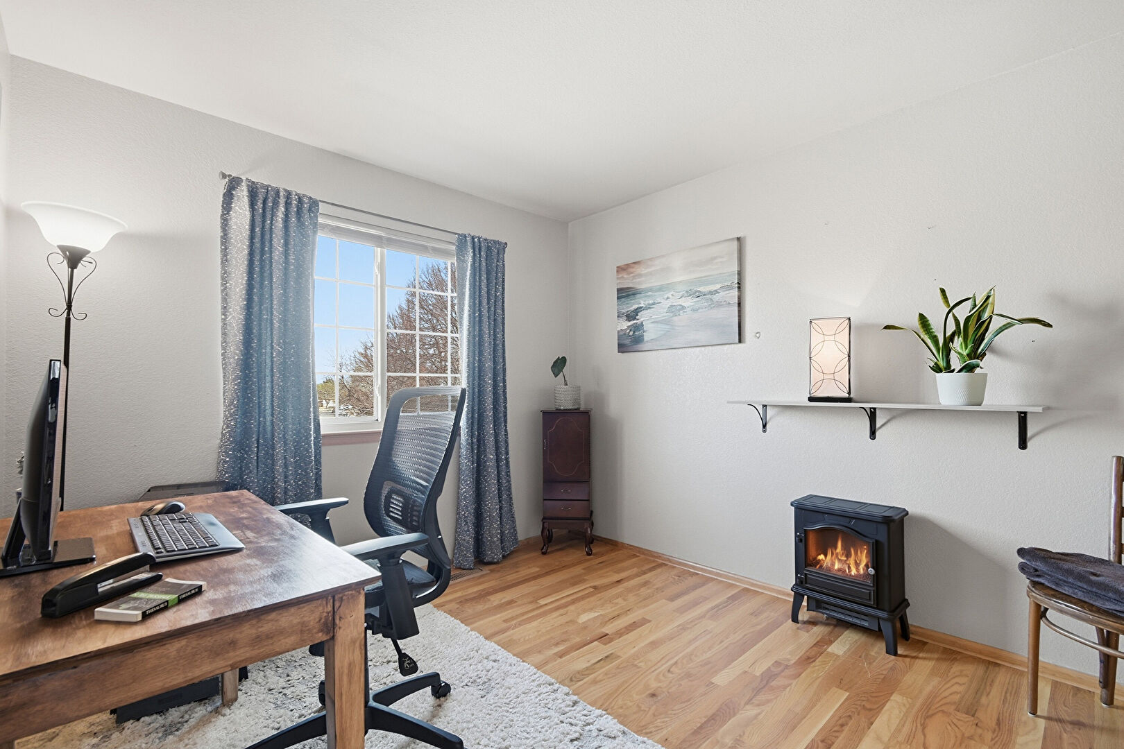 Baseboards Wall, Drywall, Natural Light, Office Area, Smoke Carbon Monoxide Detector, Vent, Wood Finish Floor, Wood Stove, Scuttle, Wood Finish Floor
