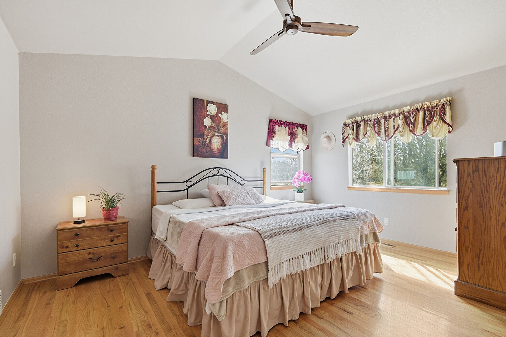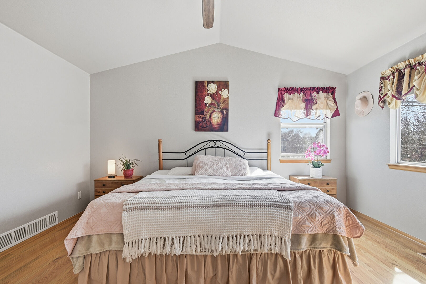 Baseboards Wall, Cathedral Ceiling, Ceiling Fan, Closet, Drywall, Ensuite Bathroom, Natural Light, Office Area, Textured Wall, Vaulted Ceiling, Vent, Wood Finish Floor, Baseboards Wall, Cathedral Ceiling, Ceiling Fan, Drywall, Smoke Carbon Monoxide Detector