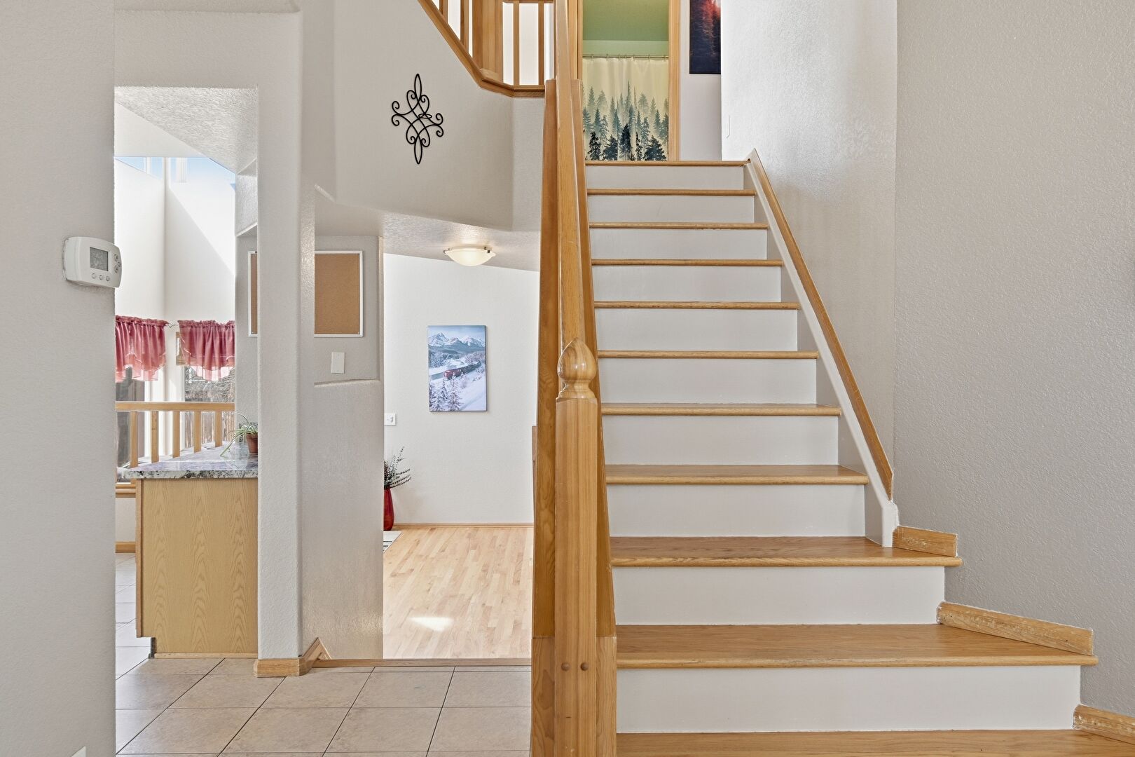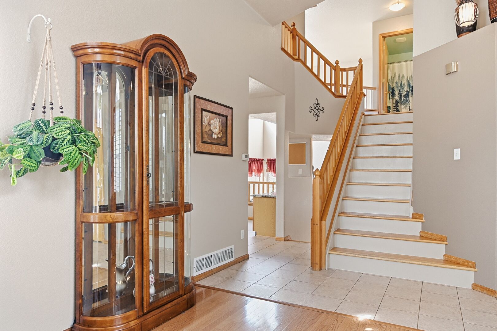 Baseboards Wall, Drywall, High Ceiling, Stairs, Tile Floor, Vent, Wood Finish Floor
