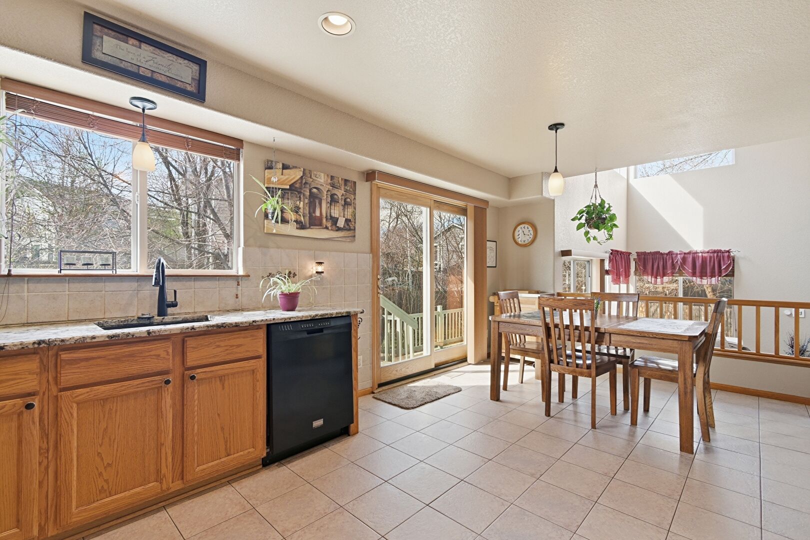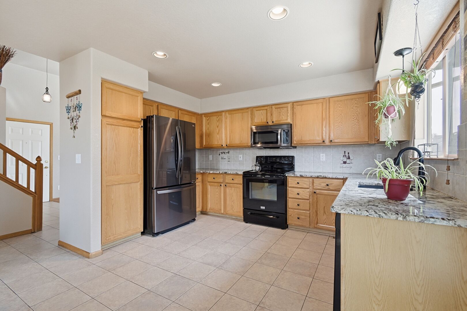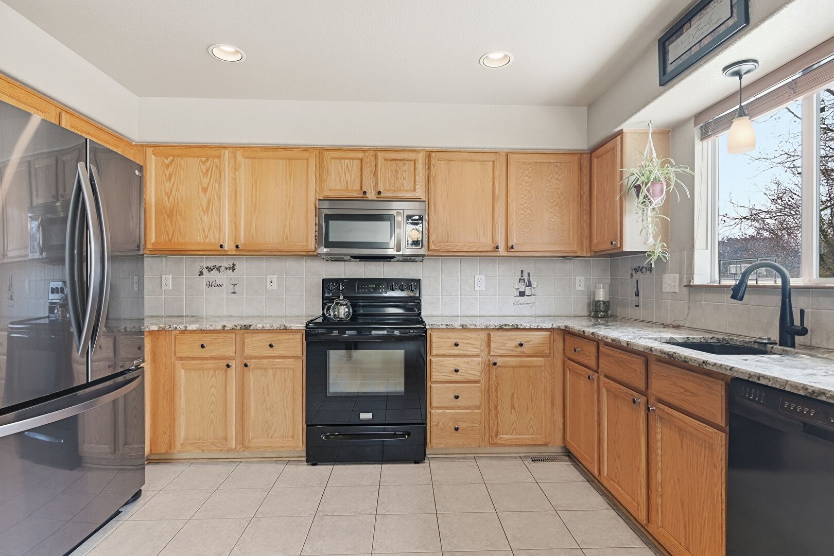 Baseboards Wall, Drywall, Medium Brown Cabinets, Natural Light, Pendant Lighting, Recessed Lighting, Shaker Cabinets, Stone Countertops, Textured Ceiling, Tile Floor, U Shaped Kitchen, Drywall, Medium Brown Cabinets, Natural Light, Pendant Lighting, Recessed Lighting
