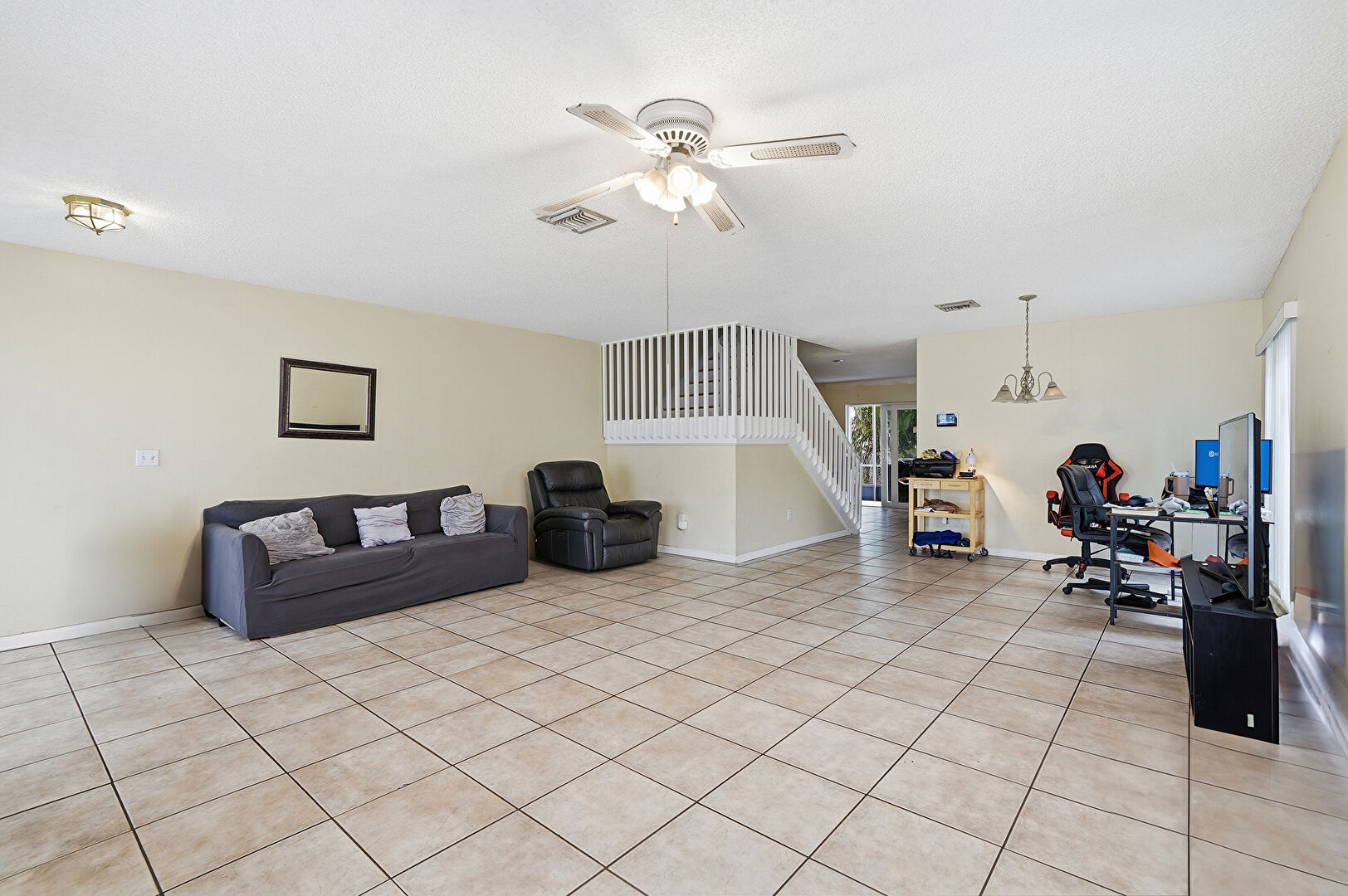 Baseboards Wall, Ceiling Fan, Drywall, Natural Light, Notable Chandelier, Stairs, Textured Ceiling, Tile Floor, Vent, Drywall, Natural Light