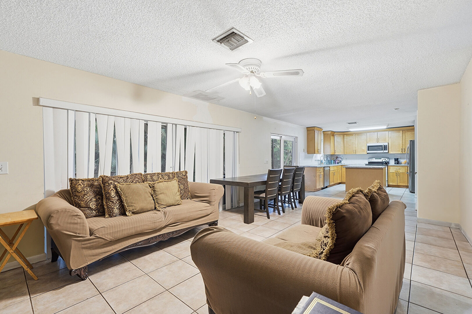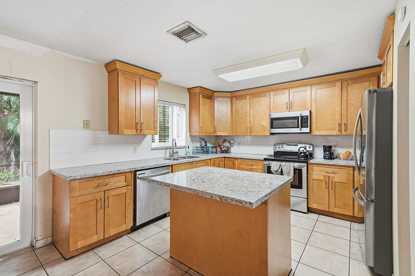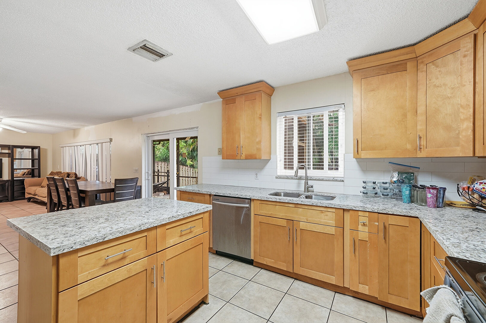 Baseboards Wall, Ceiling Fan, Crown Molding Cabinets, Drywall, Kitchen Island, Medium Brown Cabinets, Natural Light, Opens To Living Area, Shaker Cabinets, Stone Countertops, Textured Ceiling, Tile Floor, U Shaped Kitchen, Vent, Crown Molding Cabinets, Medium Brown Cabinets, Natural Light, Stone Countertops, Tile Floor