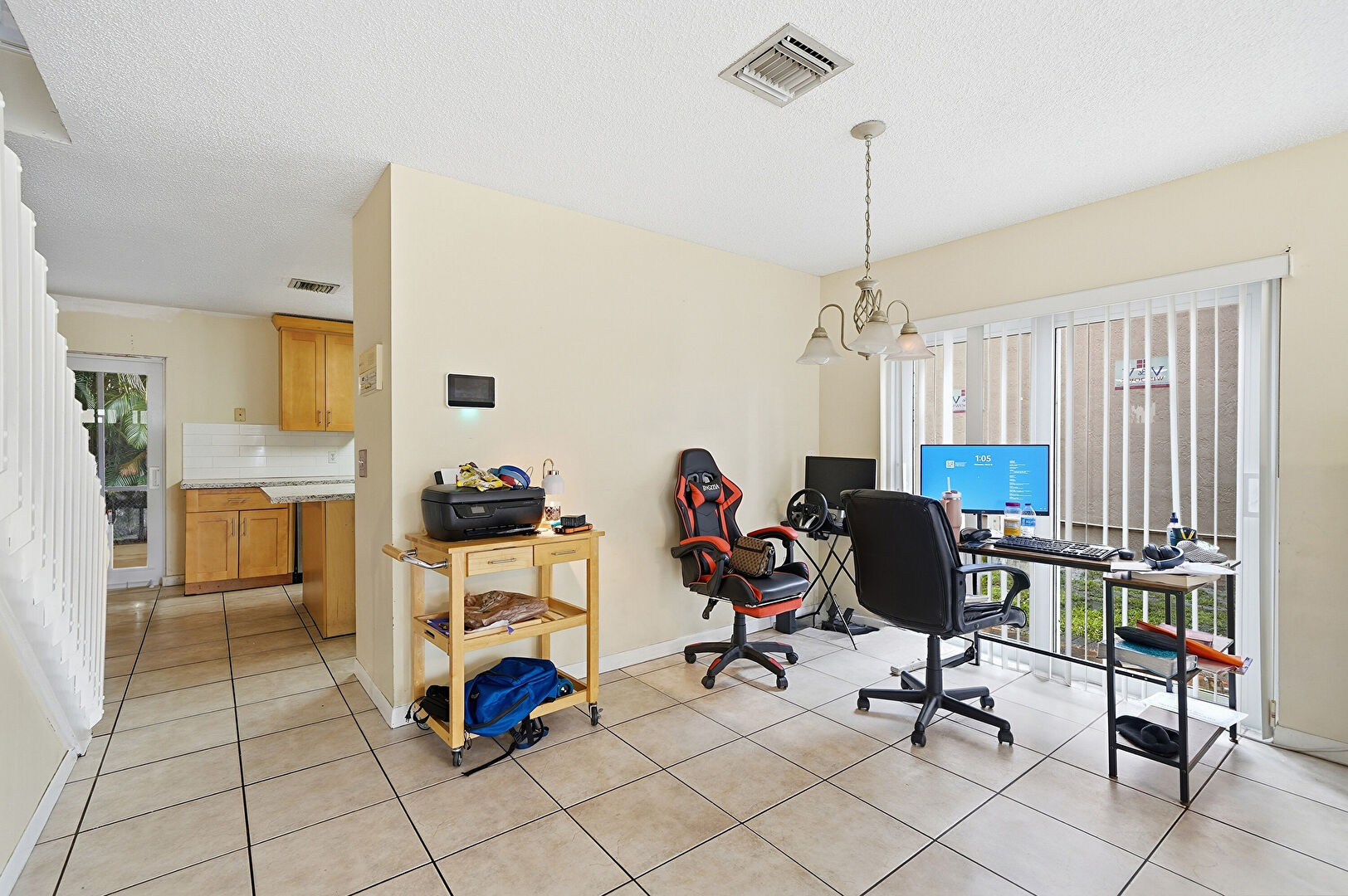 Baseboards Wall, Ceiling Fan, Drywall, Natural Light, Office Area, Textured Ceiling, Tile Floor, Vent, Notable Chandelier