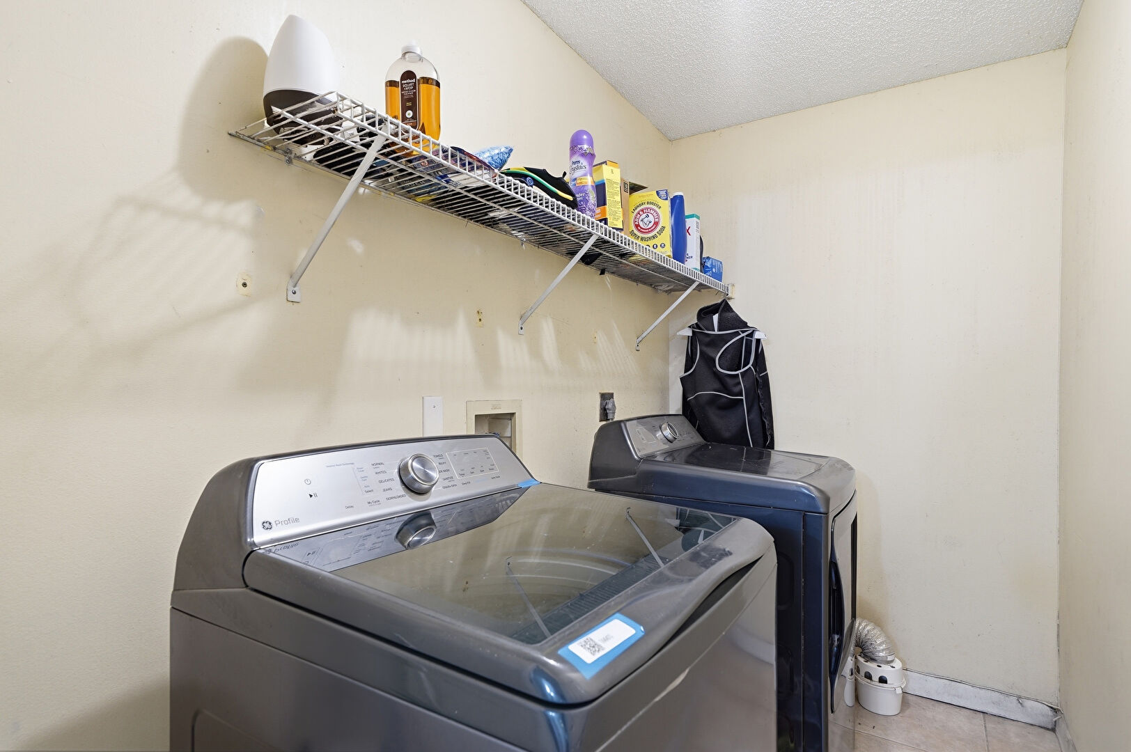 Drywall, Laundry, Textured Ceiling, Tile Floor, Washer Hookup, Baseboards Wall