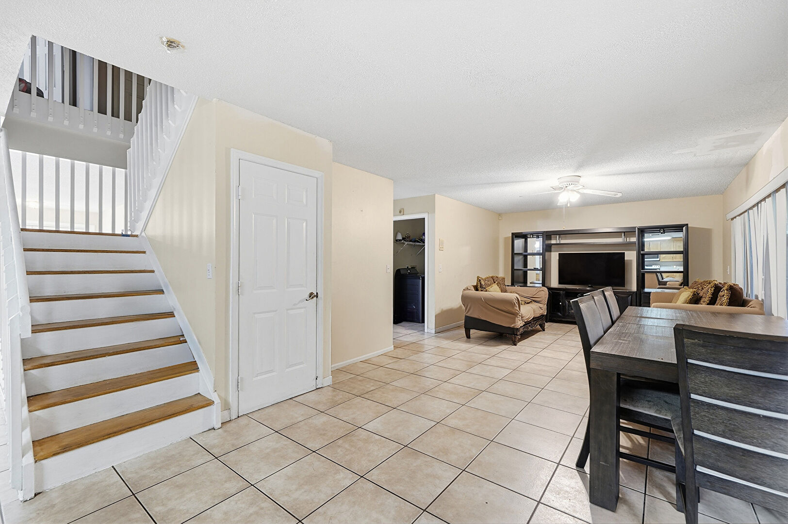 Baseboards Wall, Ceiling Fan, Drywall, Natural Light, Stairs, Textured Ceiling, Tile Floor, Drywall, Textured Ceiling, Vent