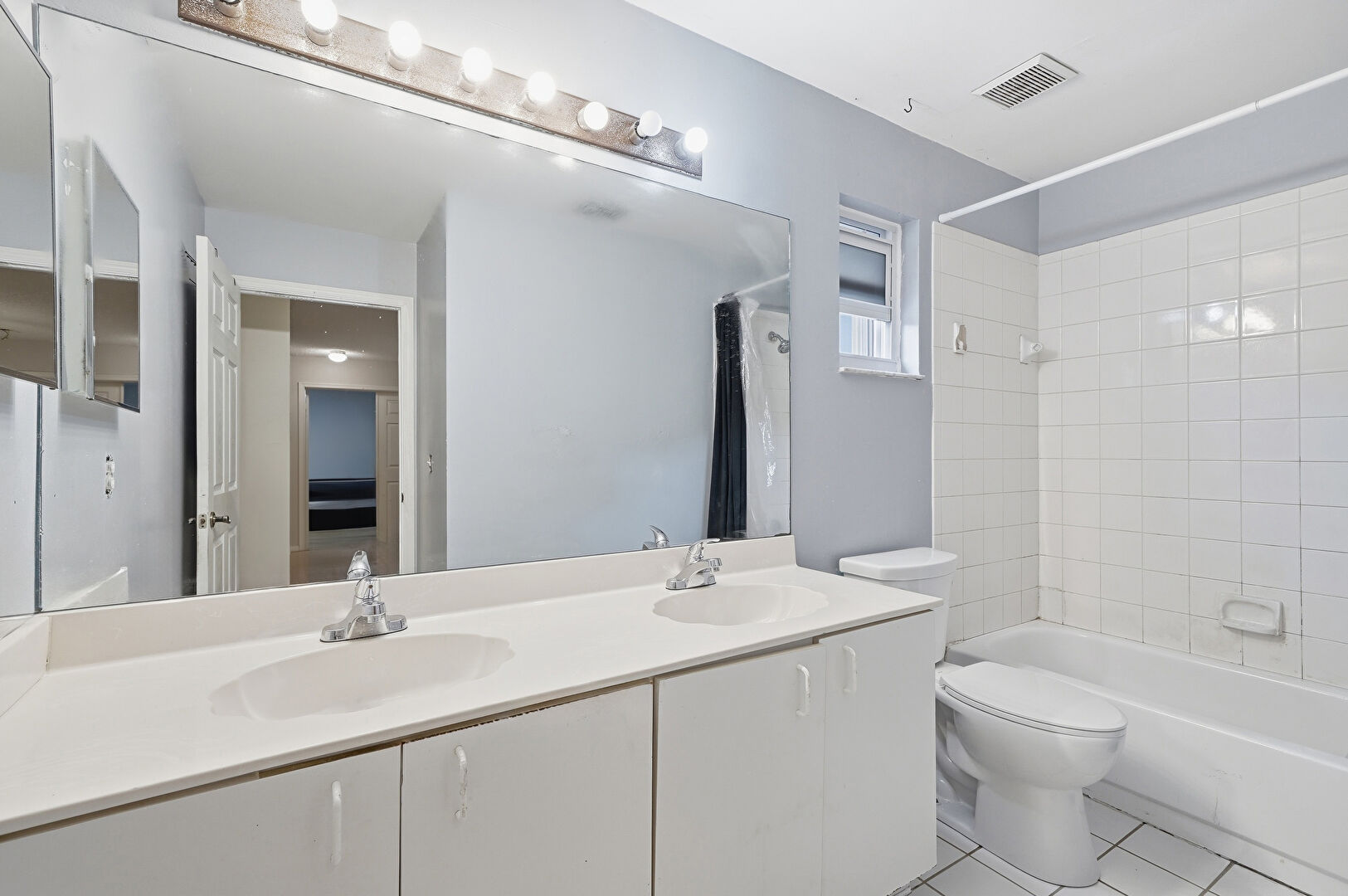 Combined Bath Shower, Double Vanity, Drywall, Full Bathroom, Natural Light, Tile Floor, Vanity, Vent, Drywall, Half Bathroom