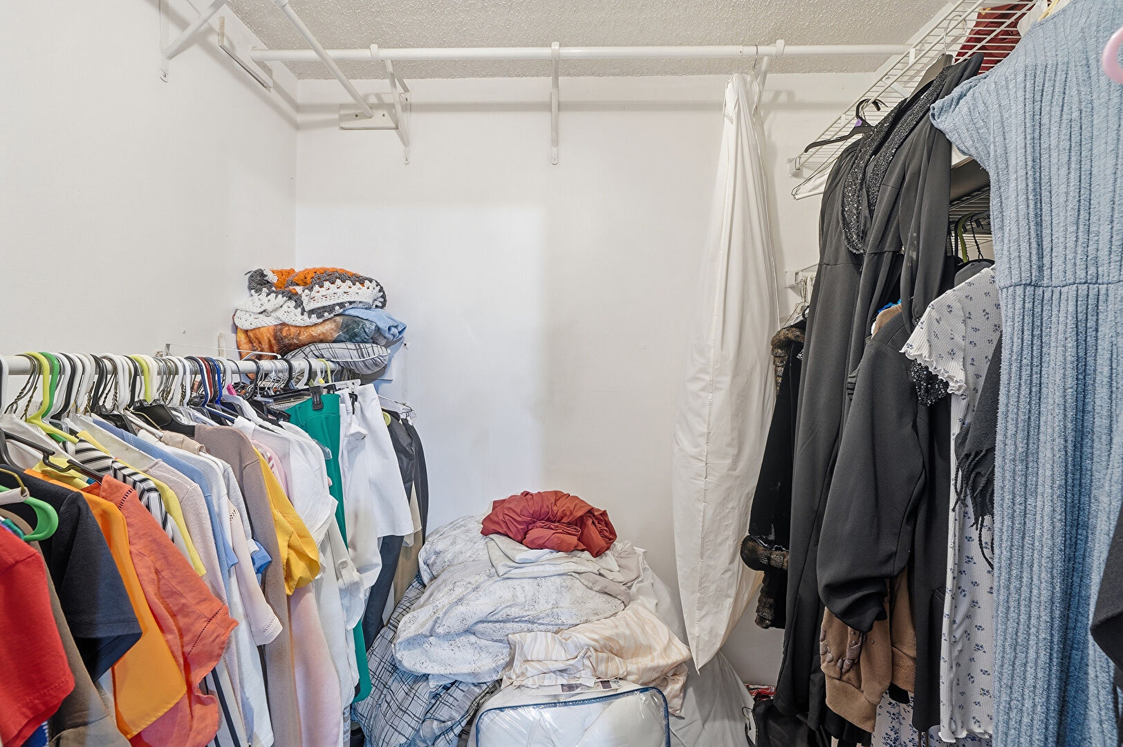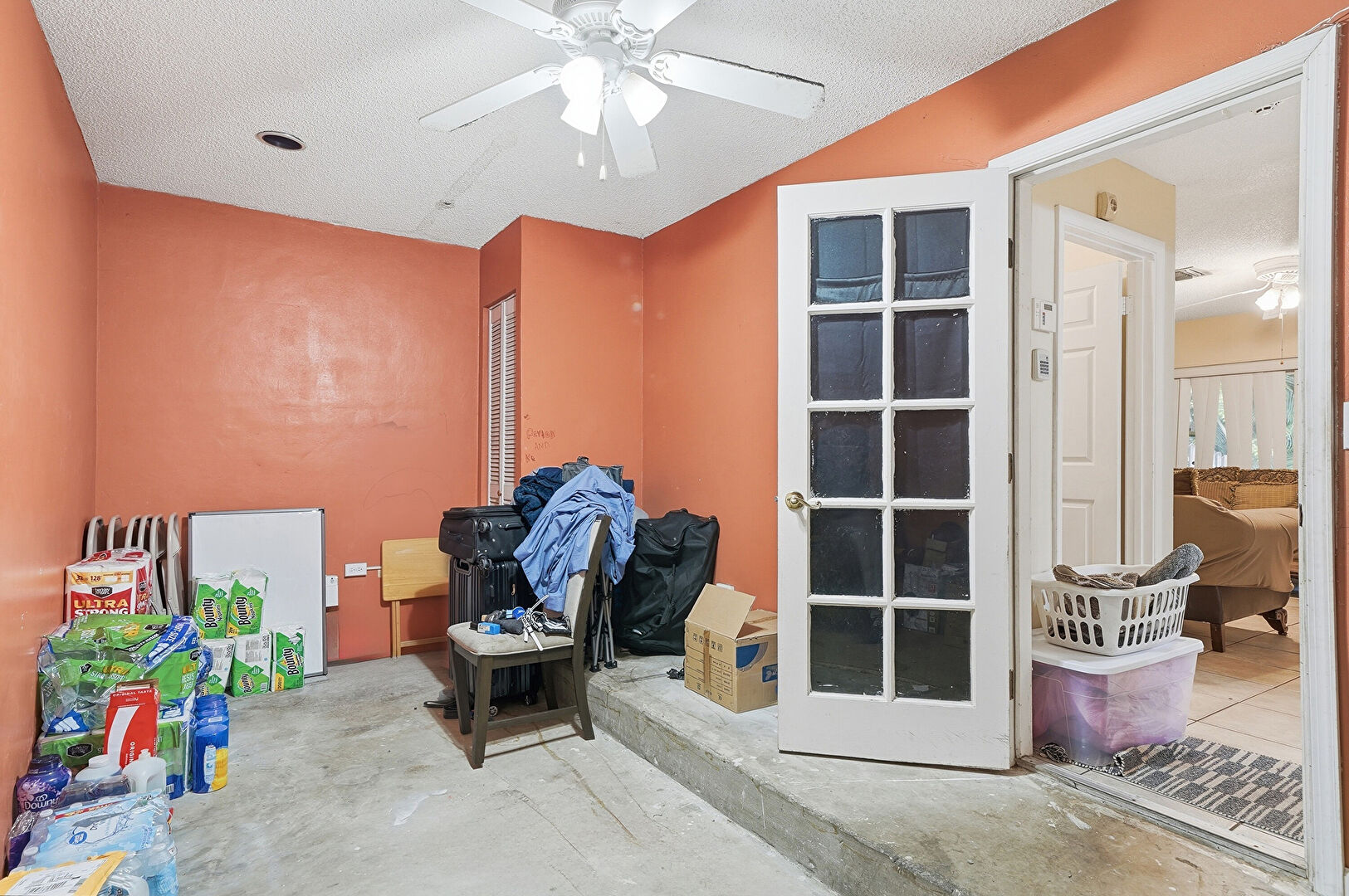 Concrete Floor, Drywall, Textured Ceiling, Ceiling Fan