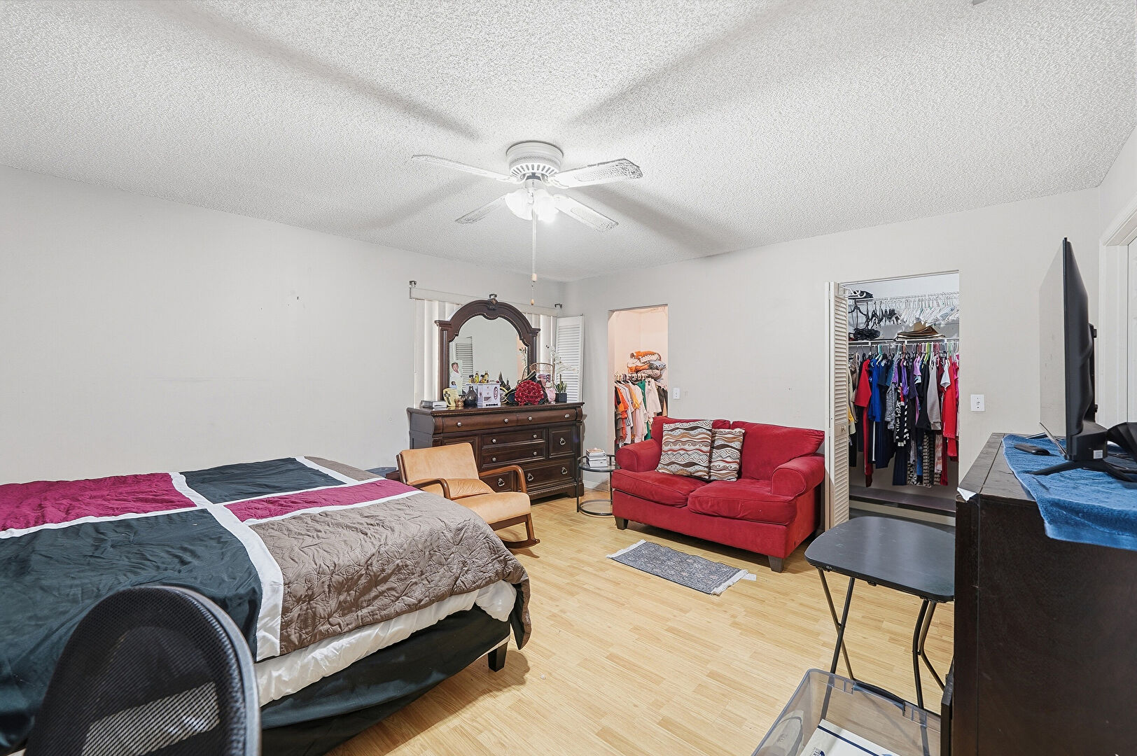 Ceiling Fan, Drywall, Ensuite Bathroom, Textured Ceiling, Vent, Walk In Closet, Wood Finish Floor, Ceiling Fan, Wood Finish Floor