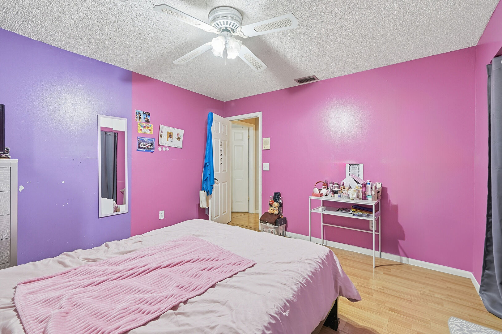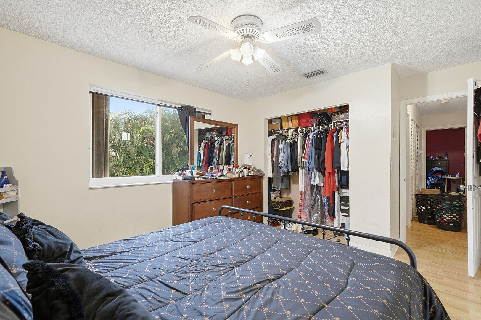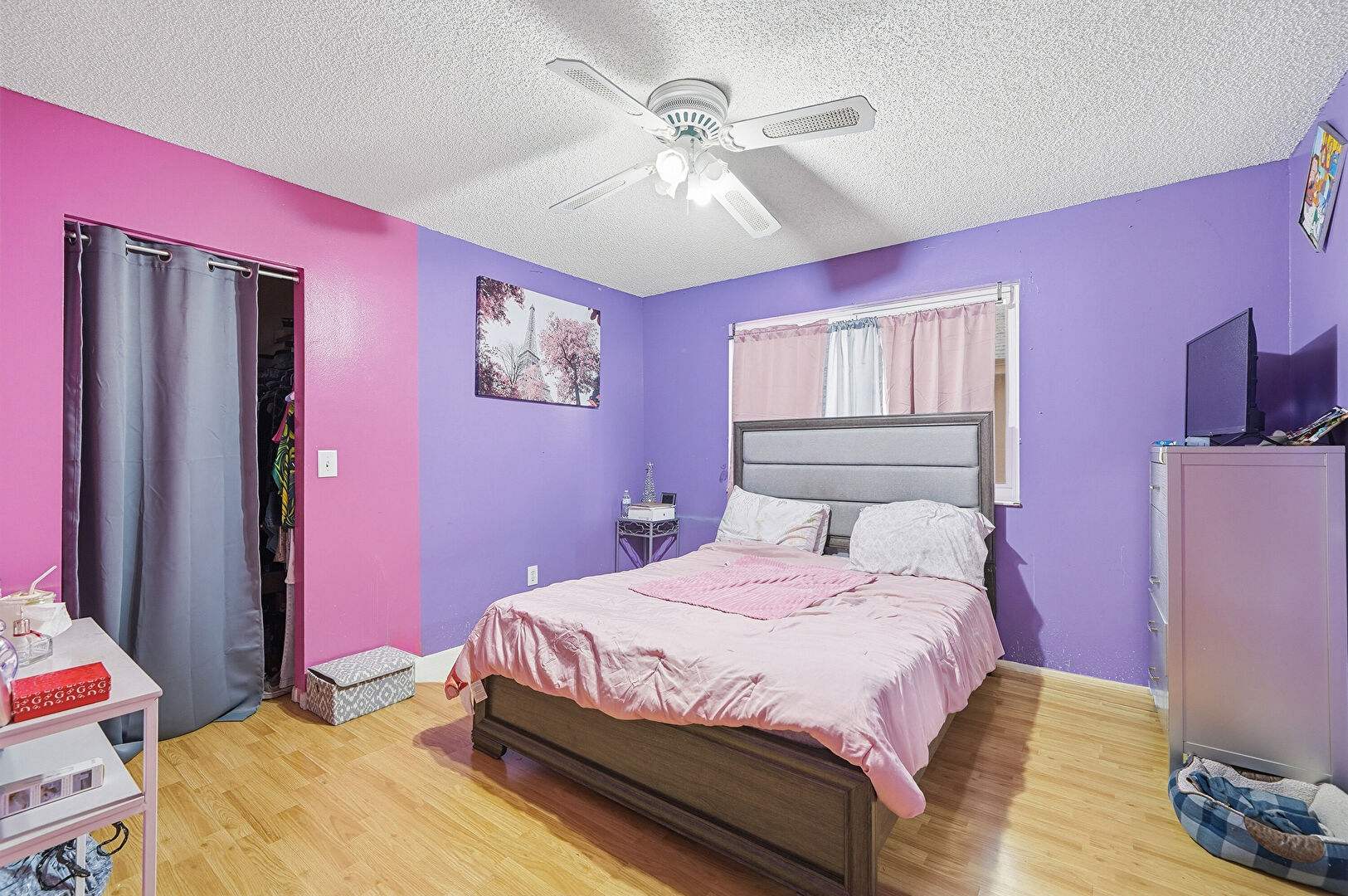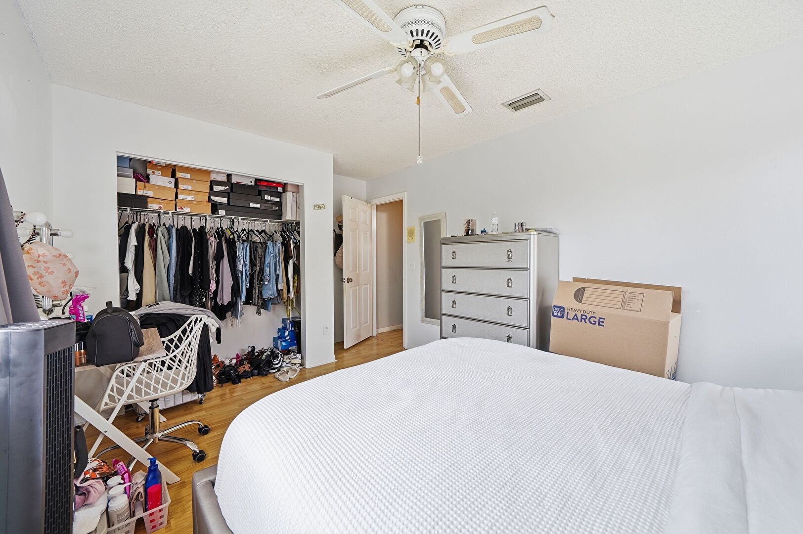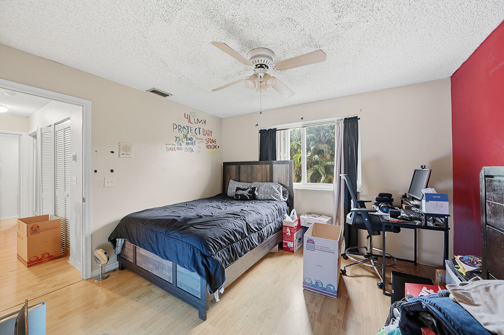 Accent Wall, Baseboards Wall, Ceiling Fan, Closet, Drywall, Natural Light, Office Area, Textured Ceiling, Vent, Wood Finish Floor, Ceiling Fan, Closet, Natural Light, Textured Ceiling, Wood Finish Floor