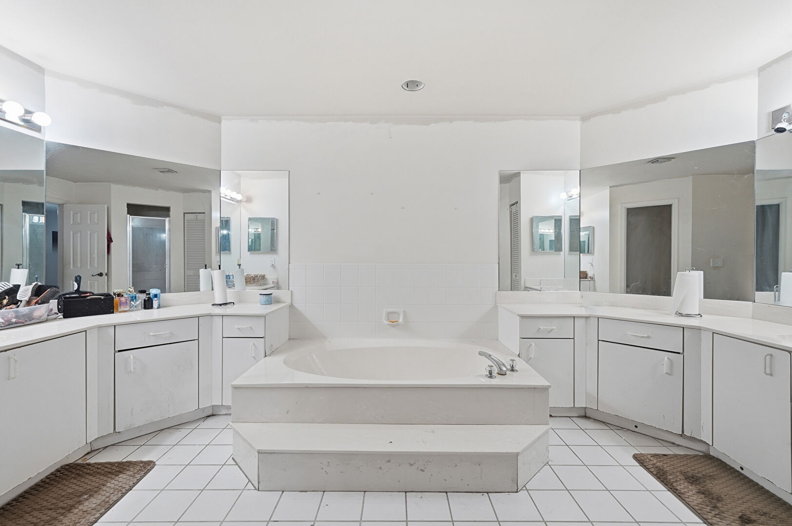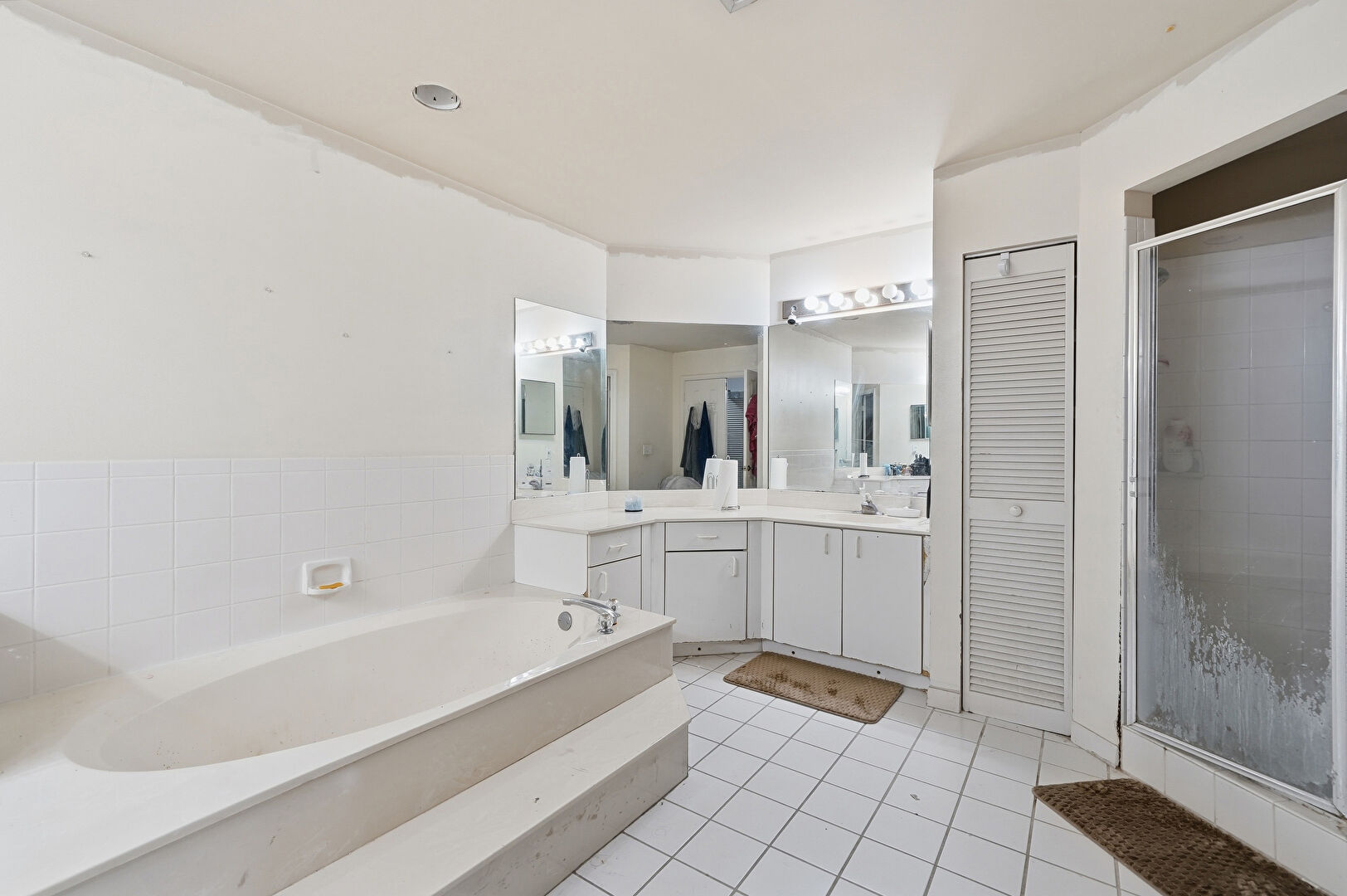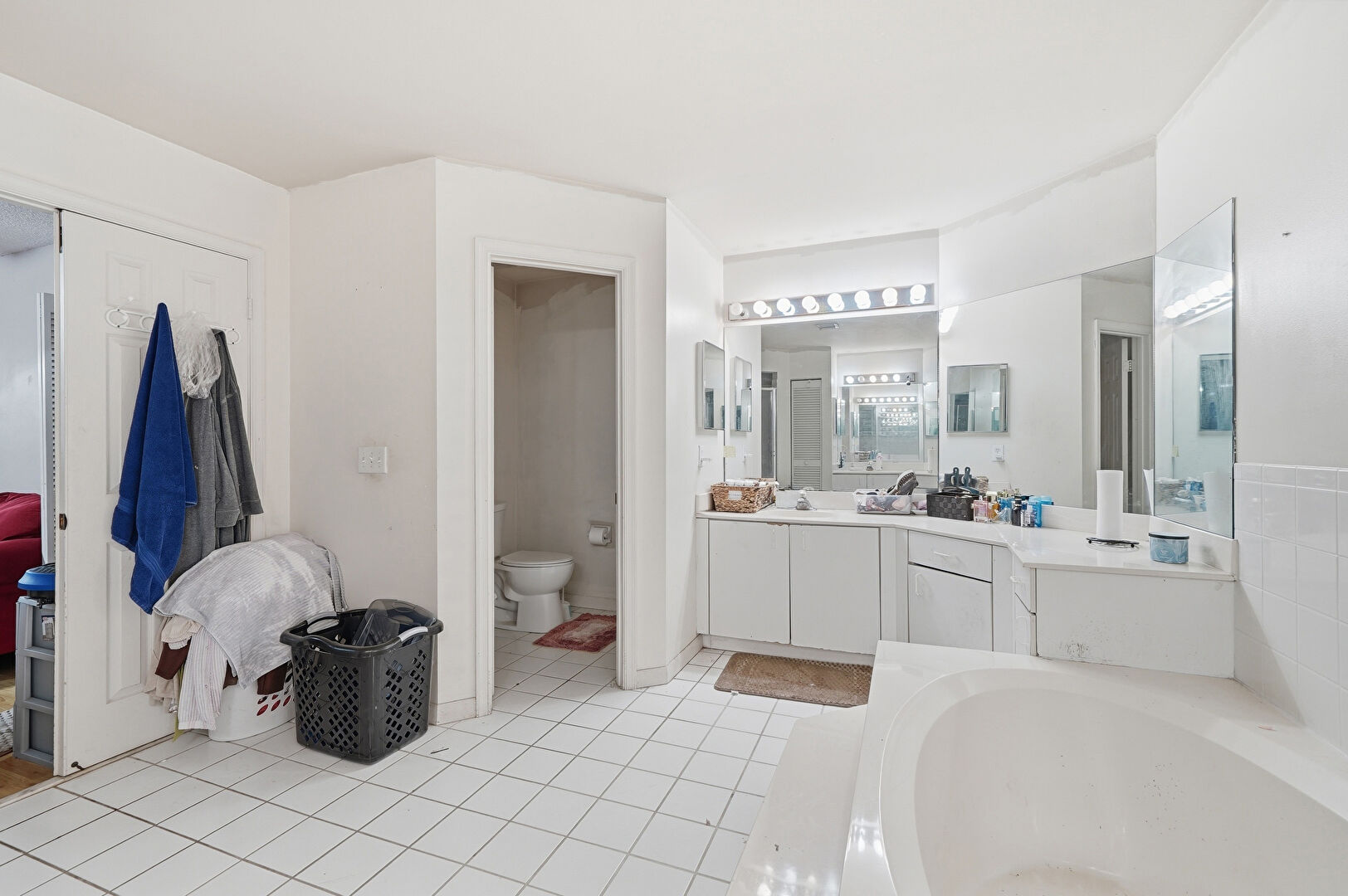 Baseboards Wall, Drywall, Full Bathroom, Tile Floor, Two Single Vanities, Vanity, Water Closet, Drywall, Natural Light, Walk In Closet