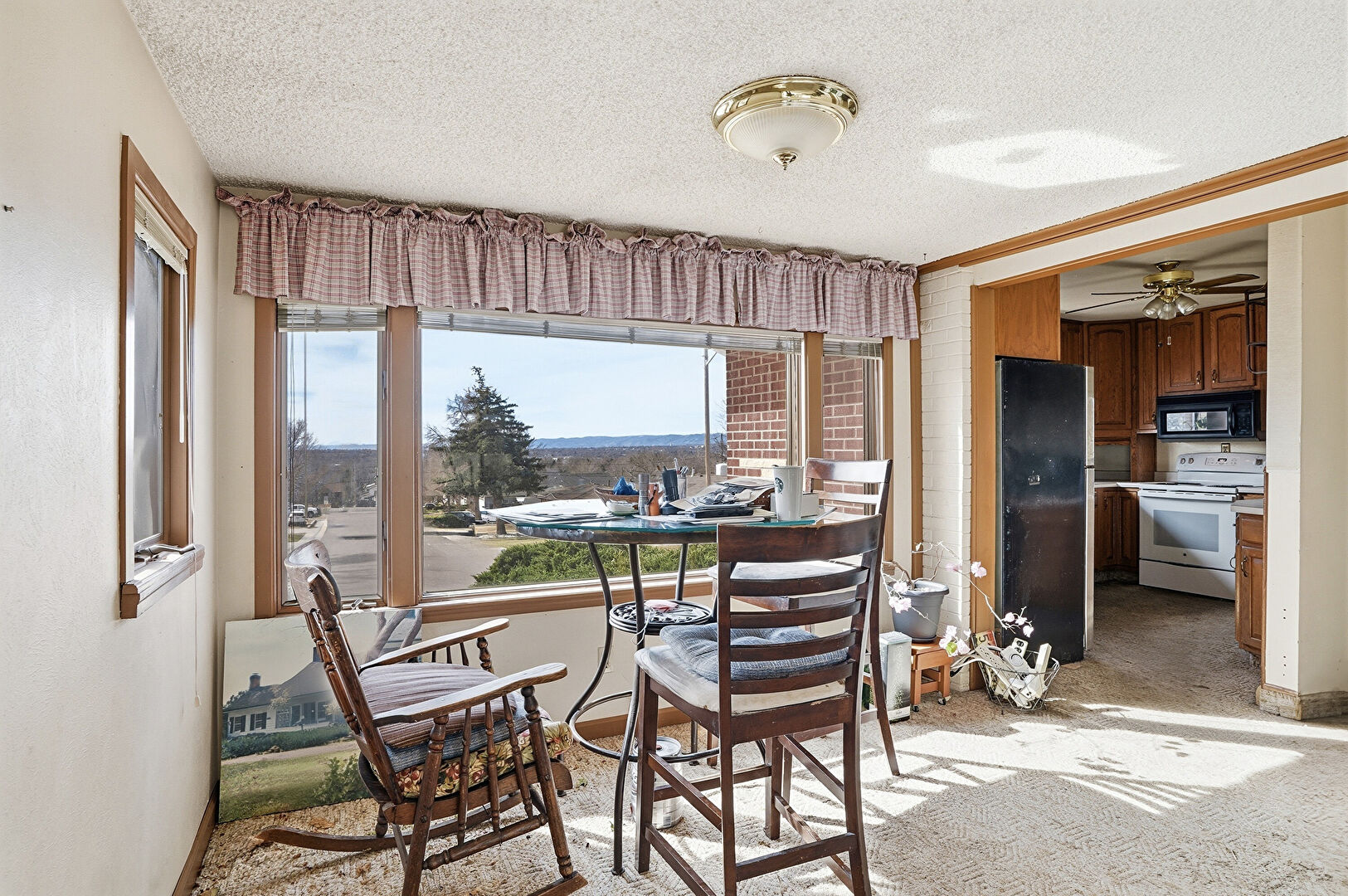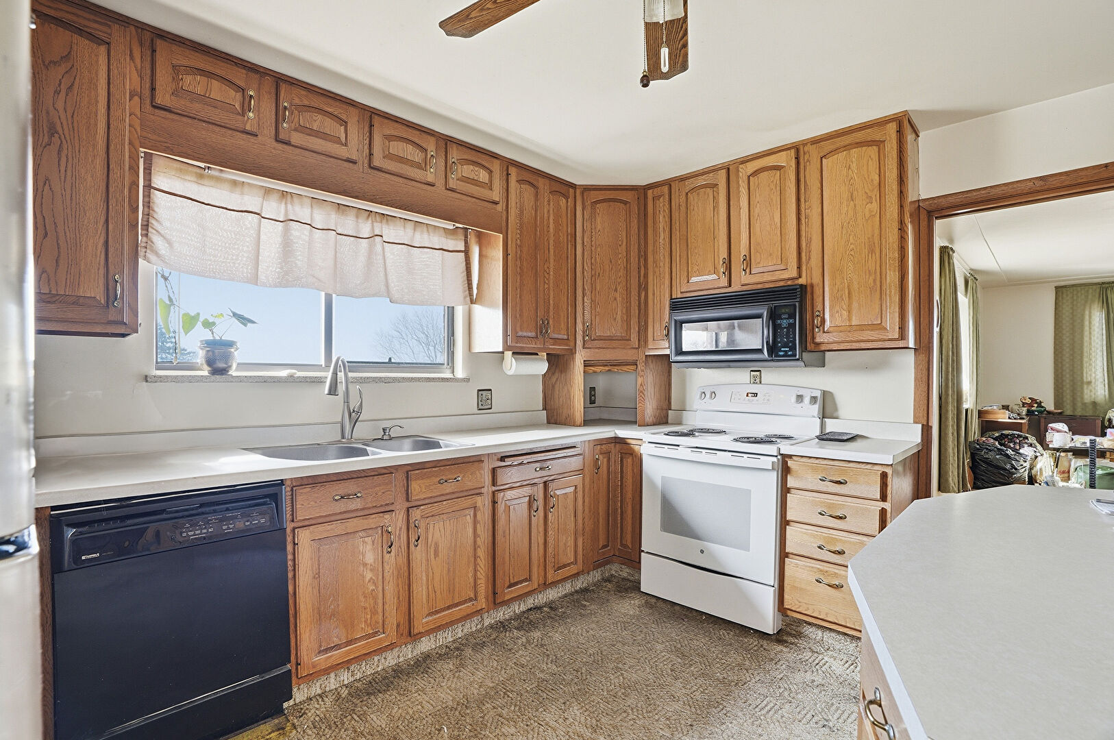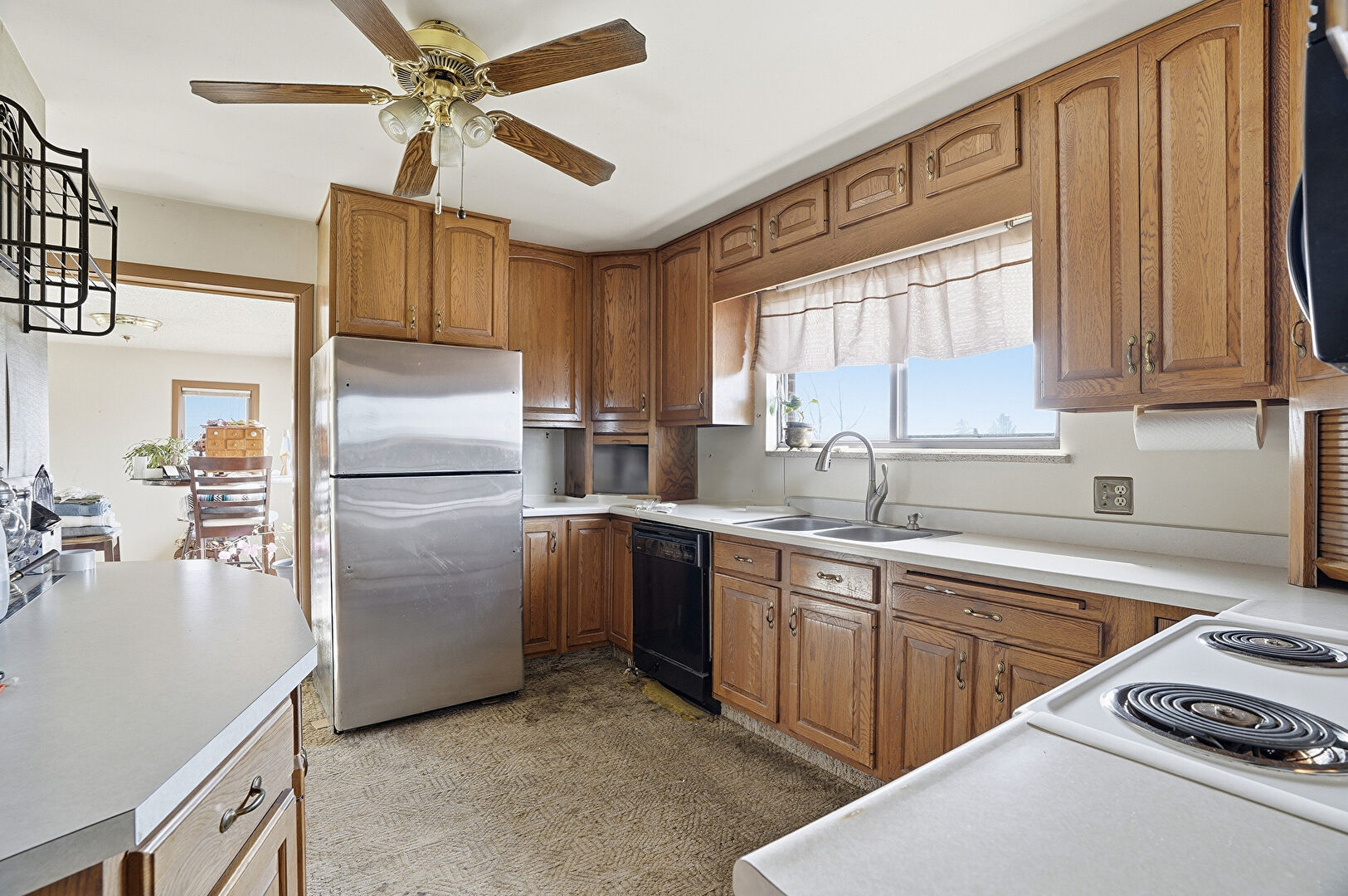 Arched Cabinets, Carpet, Ceiling Fan, Drywall, Medium Brown Cabinets, Natural Light, Pendant Lighting, Raised Cabinets, Medium Brown Cabinets, Raised Cabinets