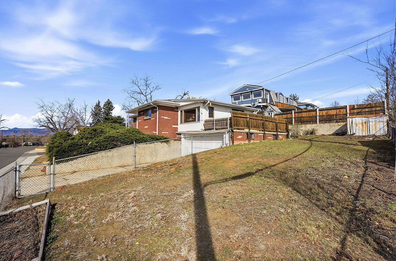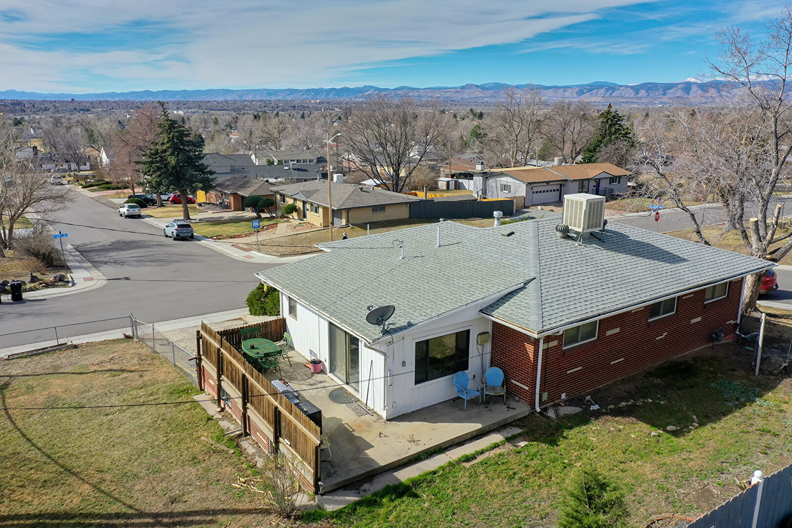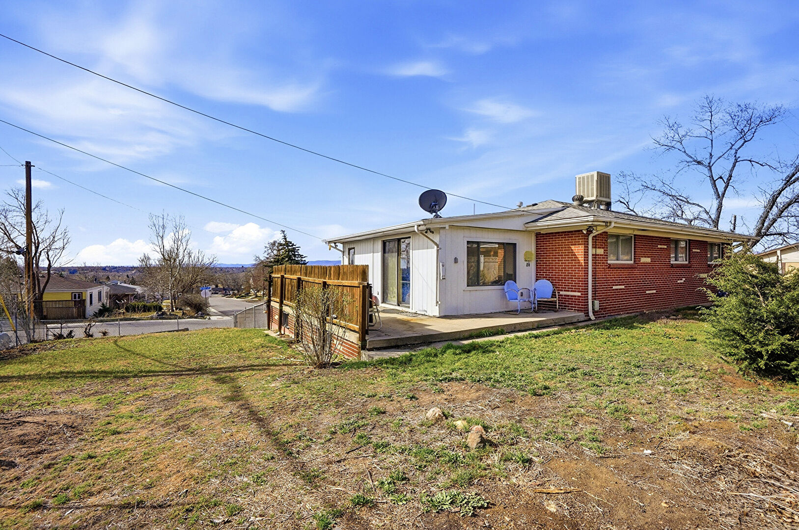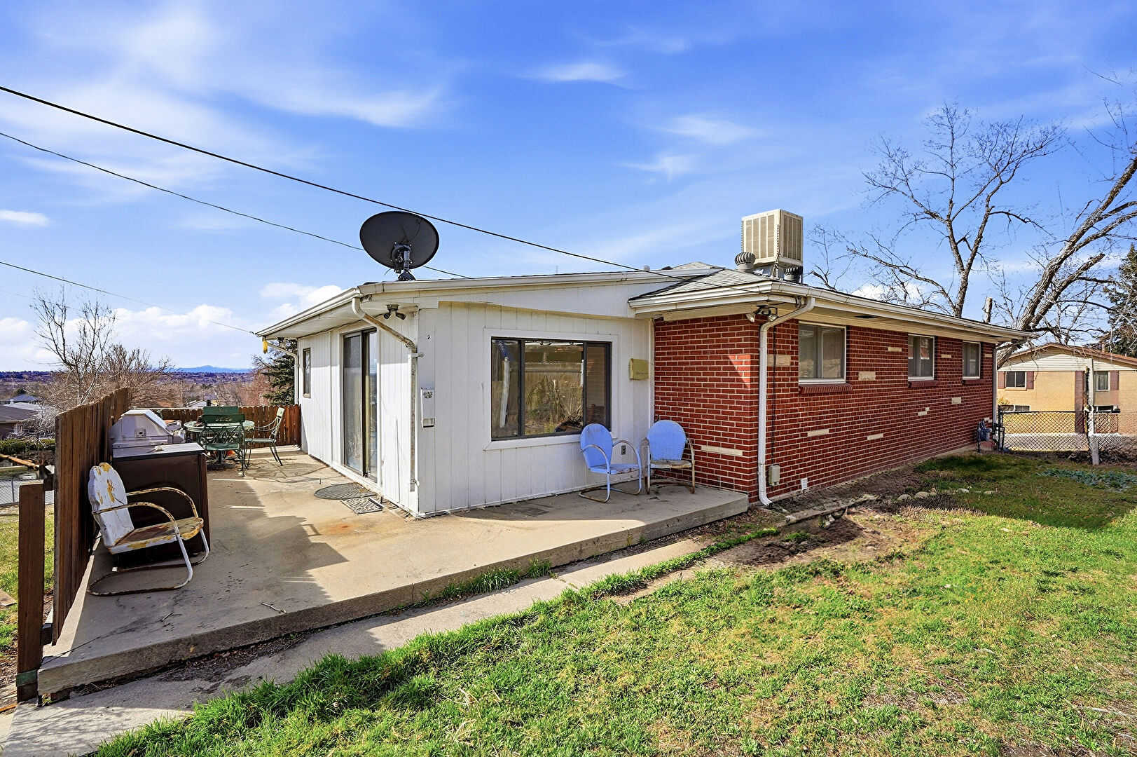 Brick Siding, Central Ac, Deck, Downspout, Fence, Gutters, Lawn, Patio, Satellite Dish, Vertical Siding, Downspout, Fence