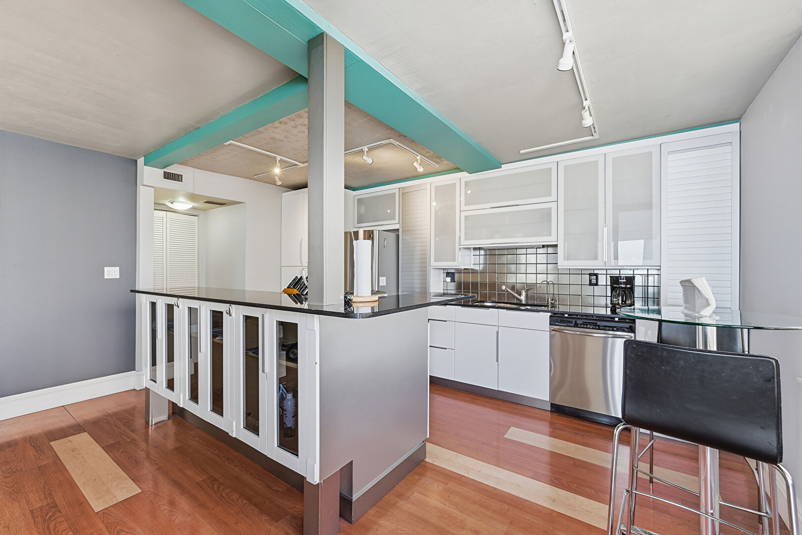 Baseboards Wall, City View, Concrete Ceiling, Drywall, Flat Panel Cabinets, Glass Insert Cabinets, Kitchen Bar, Kitchen Island, Natural Light, Notable Chandelier, One Wall Kitchen, Opens To Living Area, Pendant Lighting, Shaker Cabinets, Stone Countertops, Track Lighting, Trash Compactor, Vent, Wine Cooler, Wood Finish Floor, Flat Panel Cabinets, Glass Insert Cabinets, Natural Light, Track Lighting, Vent