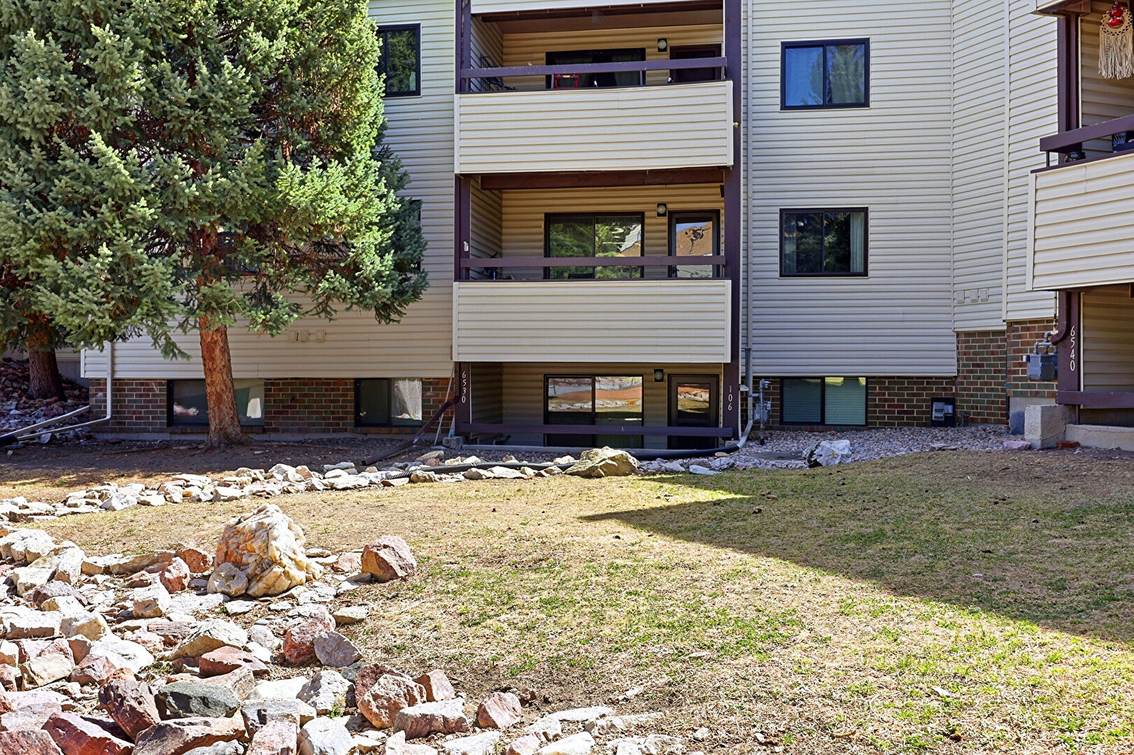Apartment Complex View, Downspout, Horizontal Siding, Lawn, Balcony