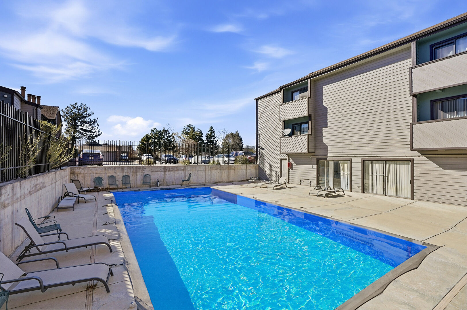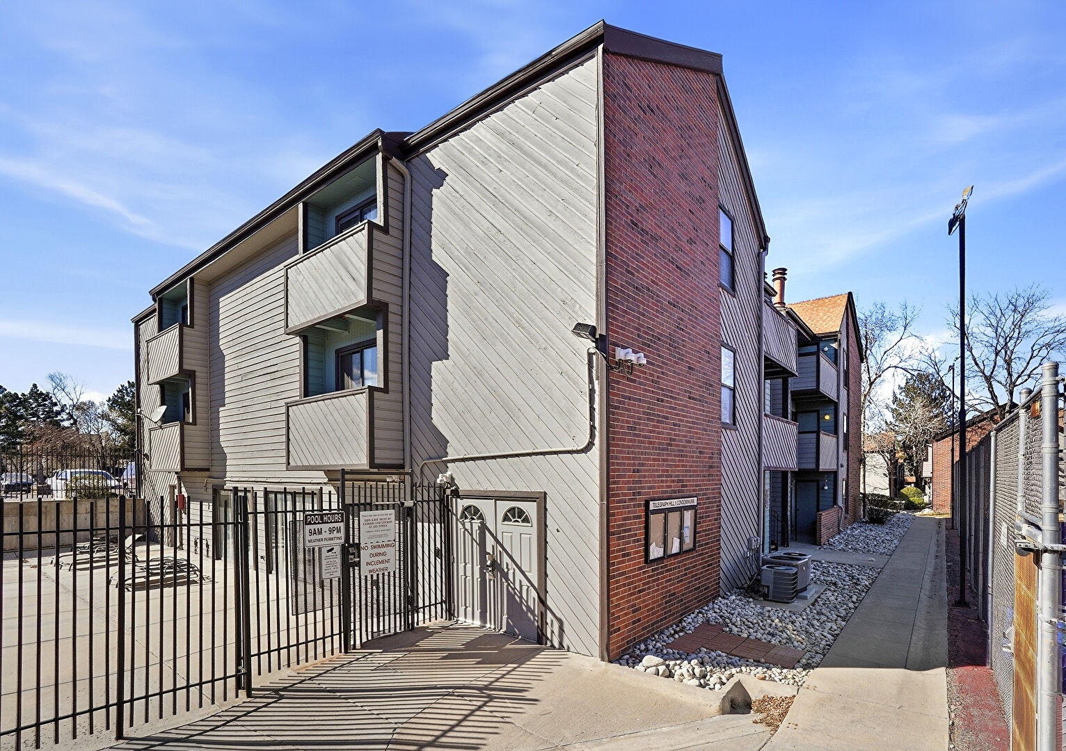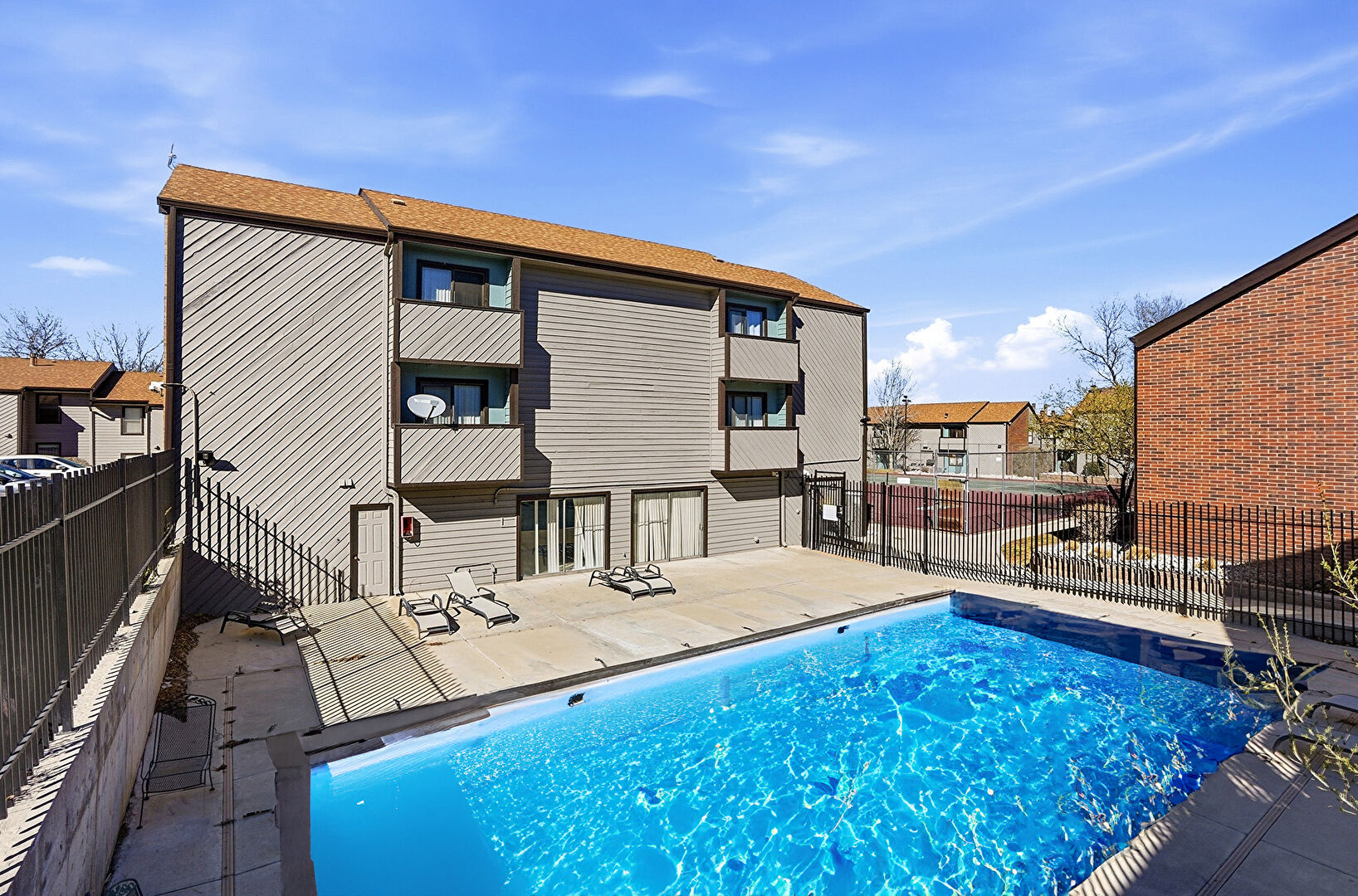 Apartment Complex View, Central Ac, Downspout, Fence, Gutters, Patio, Pool, Shingle Roof, Apartment Complex View, Fence, Horizontal Siding