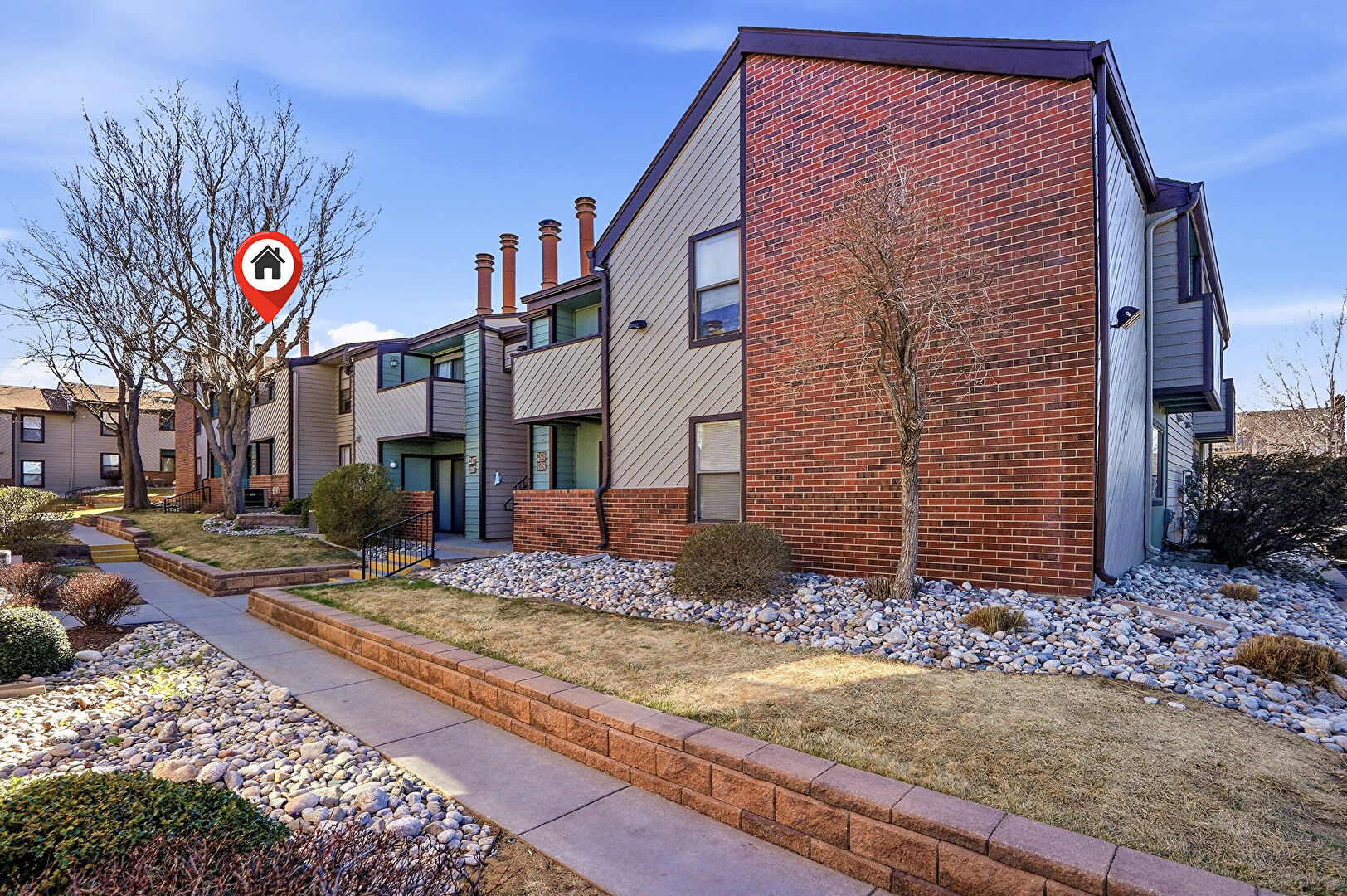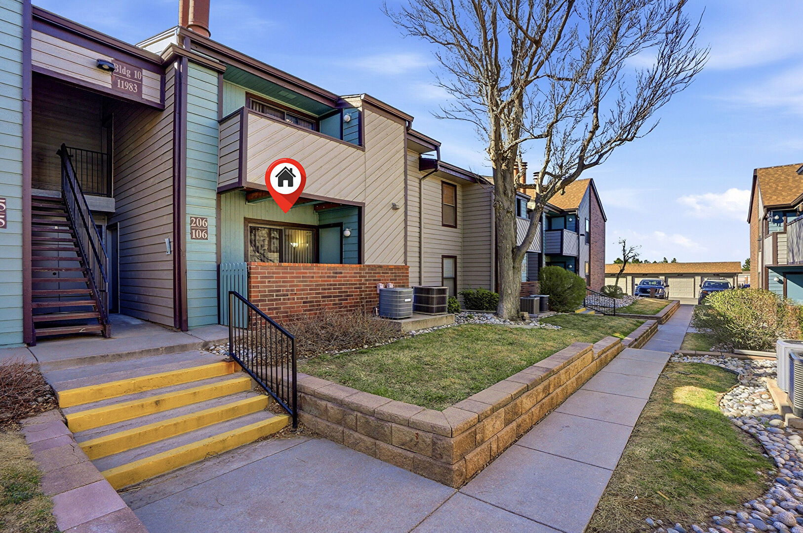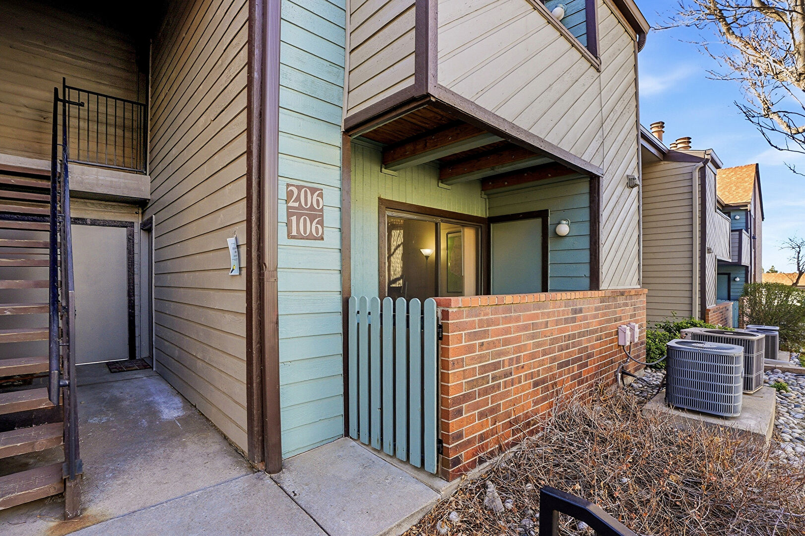 Apartment Complex View, Brick Siding, Central Ac, Fence, Gutters, Horizontal Siding, Stairs, Central Ac, Downspout, Residential View, Stairs