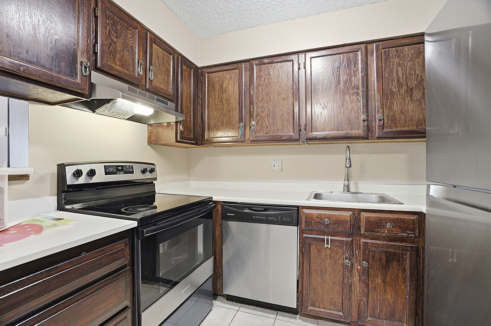 Baseboards Wall, Basement, Dark Brown Cabinets, Drywall, Kitchen Peninsula, Laundry, Shaker Cabinets, Textured Ceiling, Tile Floor, U Shaped Kitchen, Vent, Visible Hinge Cabinets, Wood Finish Floor, Dark Brown Cabinets, Shaker Cabinets, Visible Hinge Cabinets, Wood Finish Floor