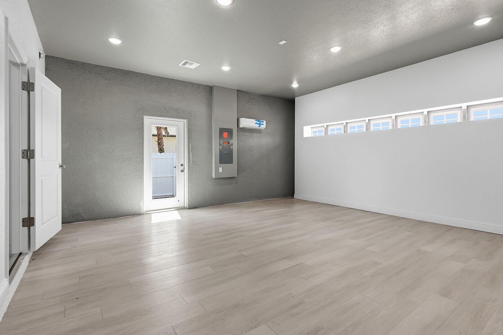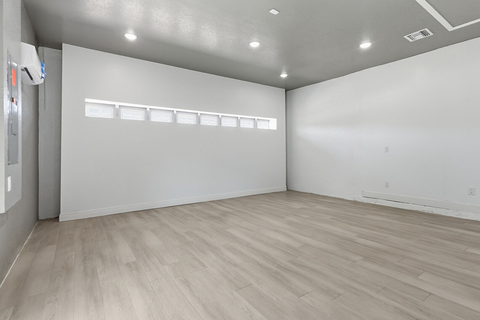 Baseboards Wall, Electric Panel, Natural Light, Recessed Lighting, Textured Wall, Vent, Wall Mounted Ac, Wood Finish Floor, Drywall, Natural Light