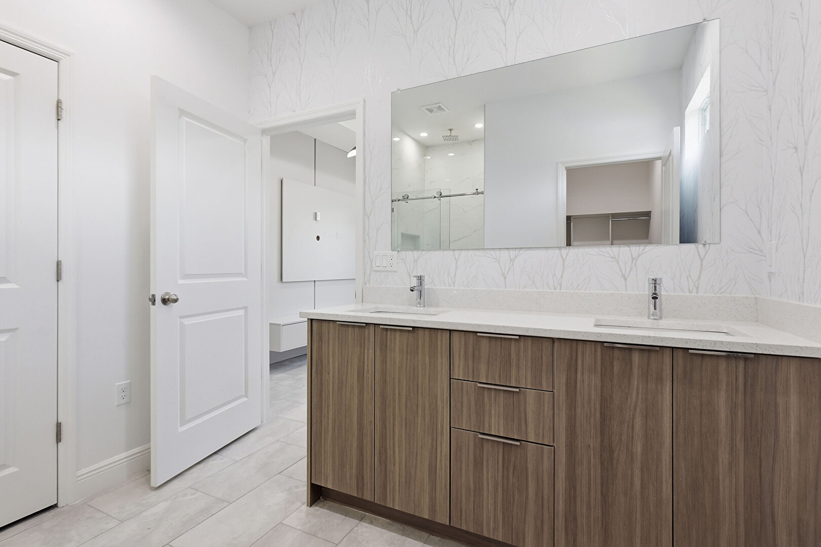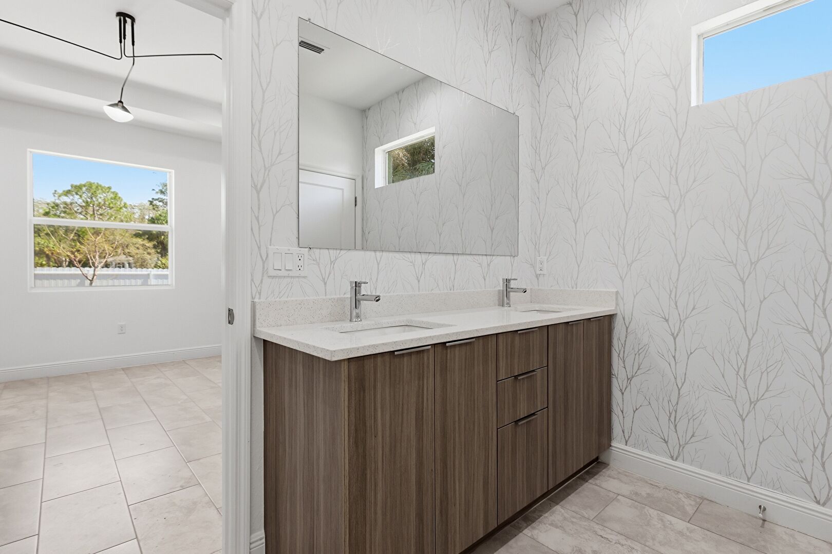 Baseboards Wall, Double Vanity, Drywall, Full Bathroom, Natural Light, Tile Floor, Vent, Walk In Closet, Wallpaper Wall, Baseboards Wall, Full Bathroom