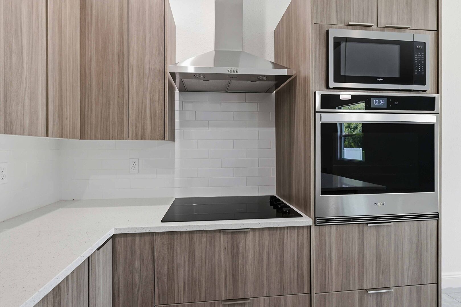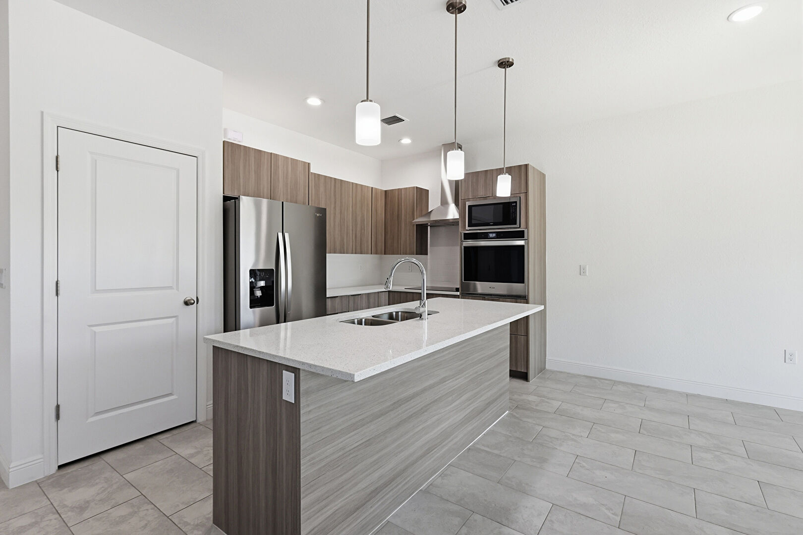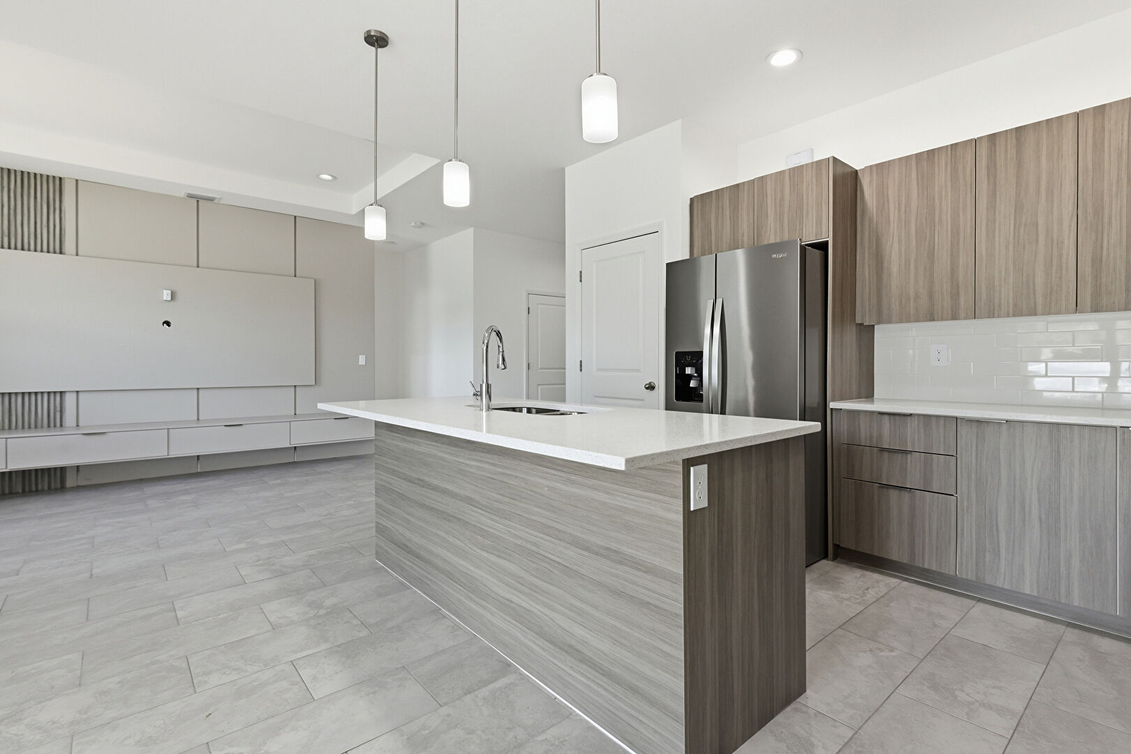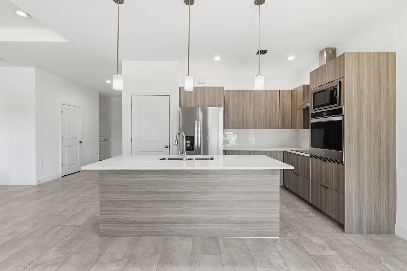 Baseboards Wall, Drywall, Flat Panel Cabinets, Kitchen Bar, Kitchen Island, L Shaped Kitchen, Medium Brown Cabinets, Opens To Living Area, Pendant Lighting, Recessed Lighting, Stone Countertops, Tile Floor, Vent, Wood Finish Floor, Drywall, Flat Panel Cabinets, Medium Brown Cabinets