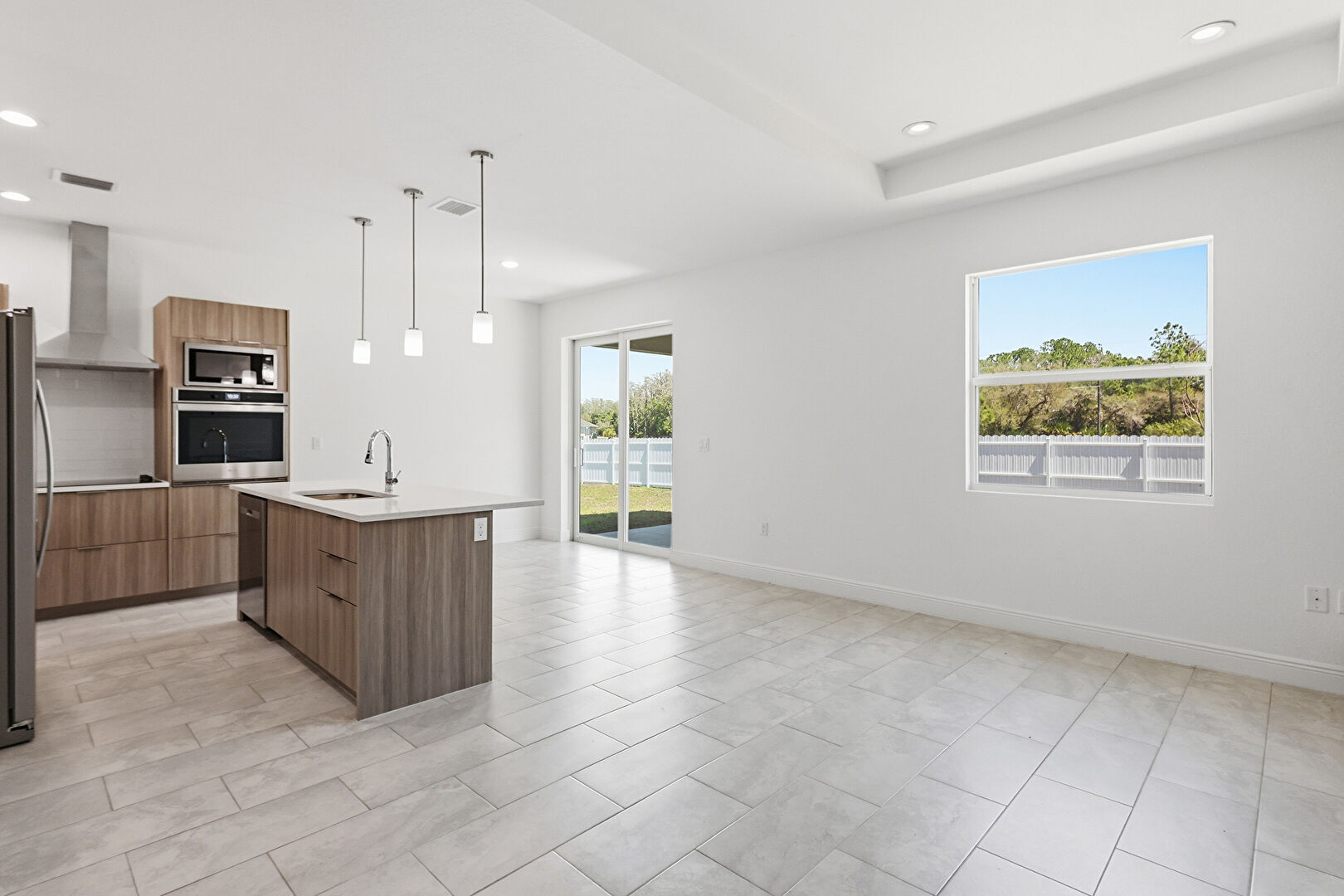 Baseboards Wall, Drywall, Flat Panel Cabinets, Kitchen Bar, Kitchen Island, Medium Brown Cabinets, Natural Light, Opens To Living Area, Pendant Lighting, Recessed Lighting, Stone Countertops, Tile Floor, Tray Ceiling, Vent, Natural Light, Stone Countertops, Vent