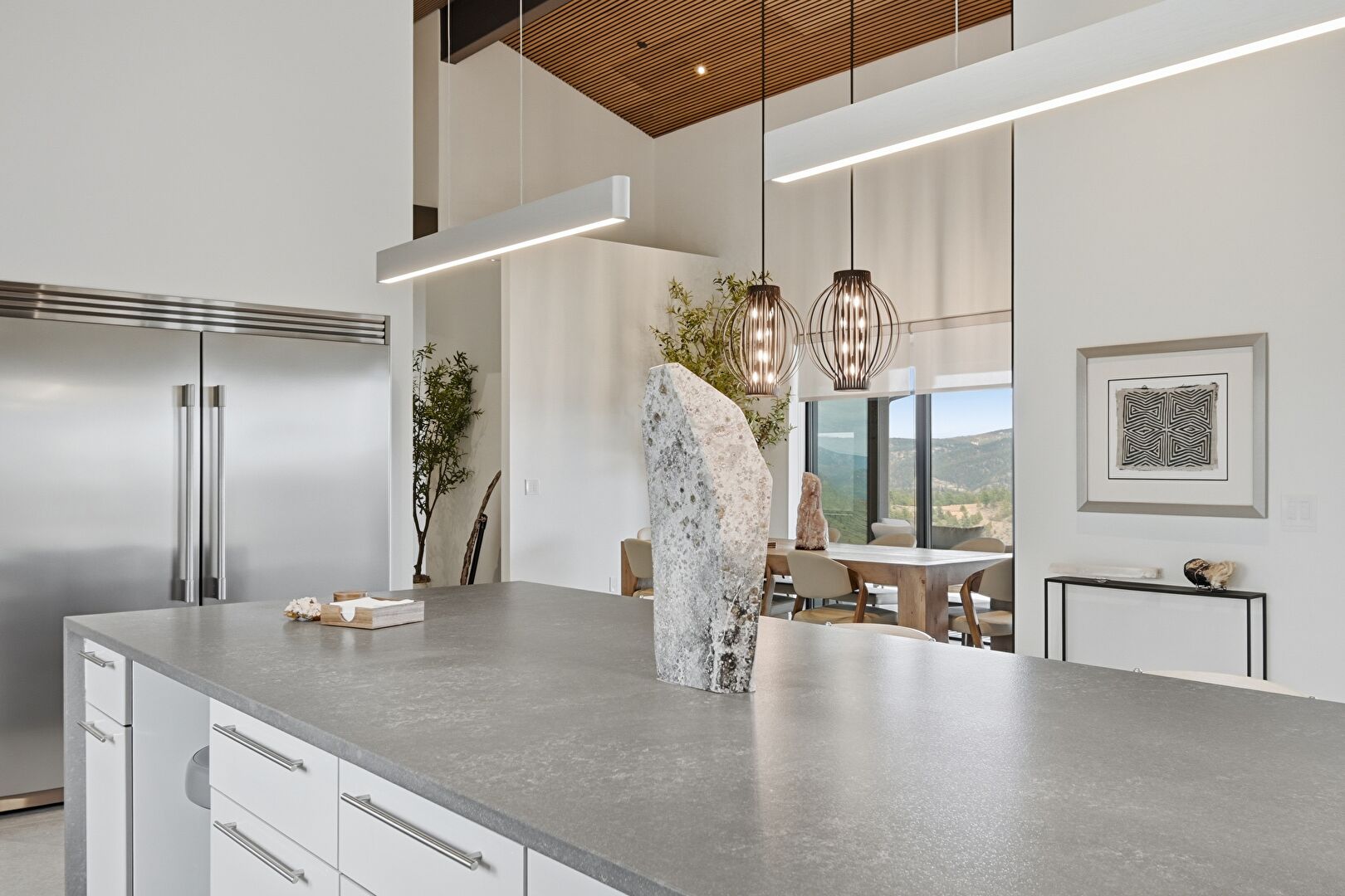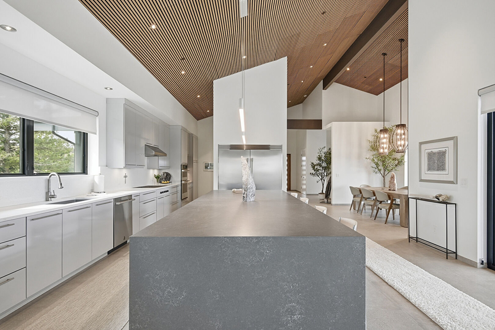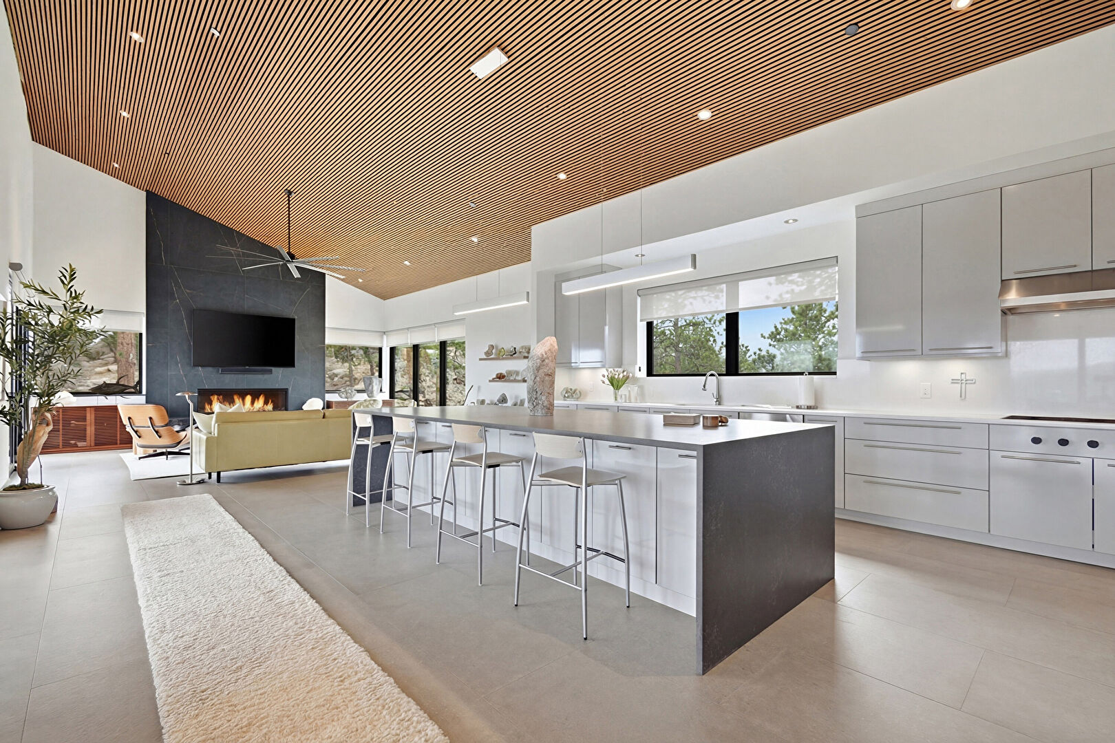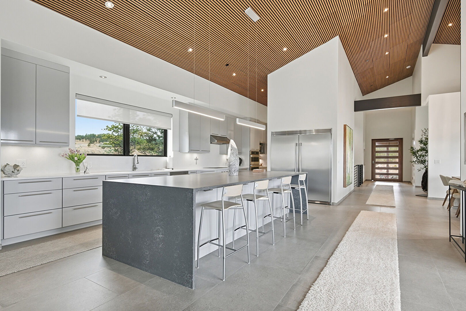 Baseboards Wall, Beamed Ceiling, Ceiling Fan, Concrete Floor, Double Oven, Drywall, Fireplace, Flat Panel Cabinets, Gray Cabinets, High Ceiling, Kitchen Bar, Kitchen Island, L Shaped Kitchen, Natural Light, Notable Chandelier, Open Shelves, Opens To Living Area, Pendant Lighting, Recessed Lighting, Shaker Cabinets, Stone Countertops, Tile Floor, Vaulted Ceiling, Vinyl Floor, Wood Ceiling, Drywall, Flat Panel Cabinets, High Ceiling, Kitchen Island, Natural Light, Recessed Lighting, Stone Countertops, Warming Drawer