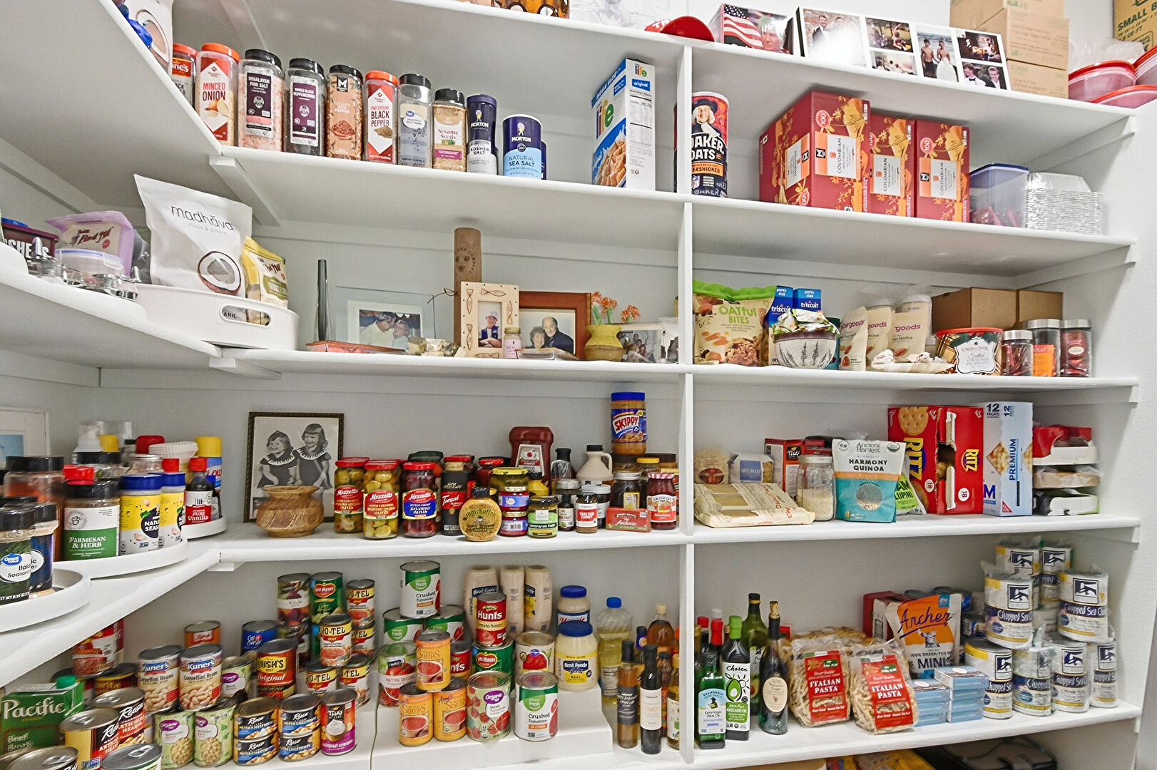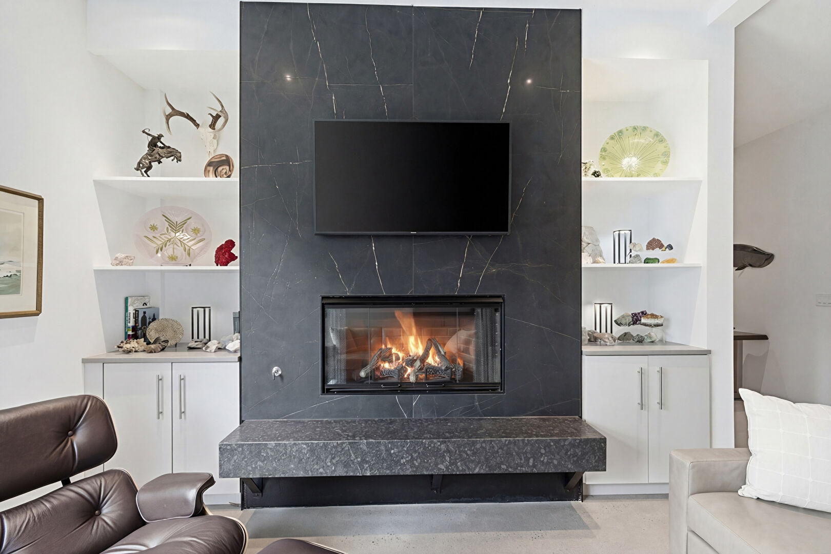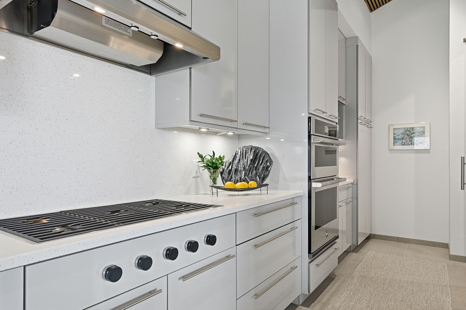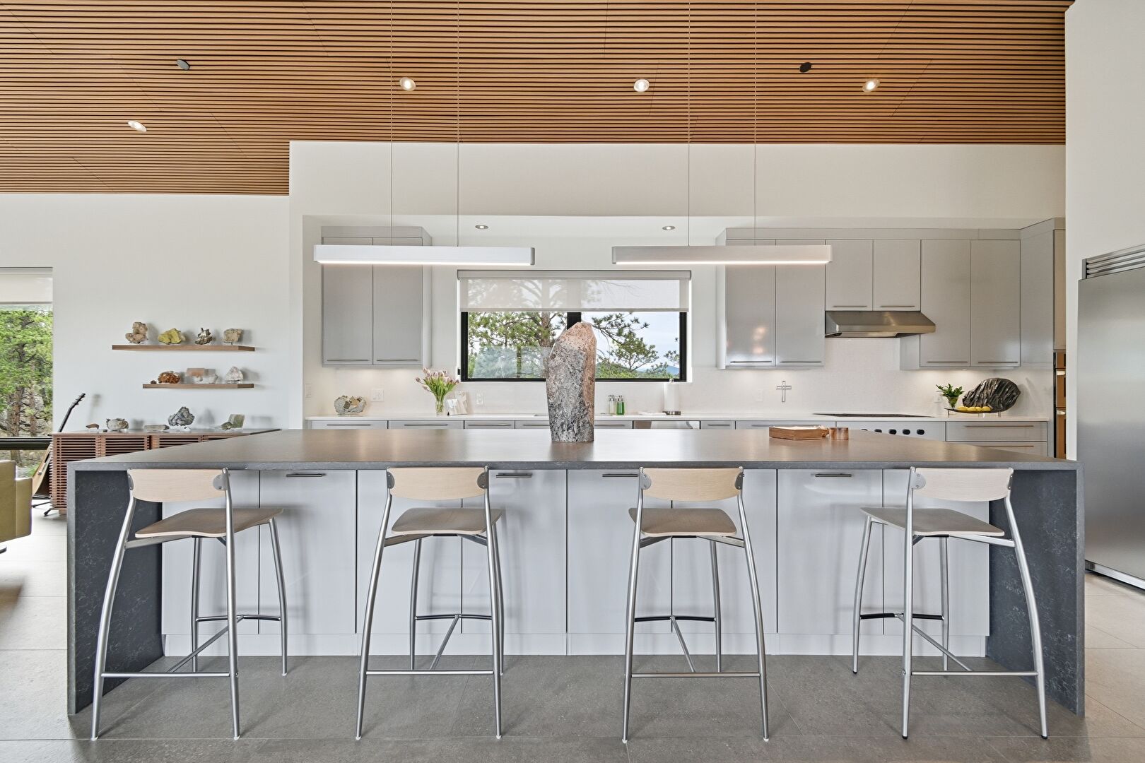 Baseboards Wall, Beamed Ceiling, Ceiling Fan, Concrete Floor, Double Oven, Drywall, Fireplace, Flat Panel Cabinets, Gray Cabinets, High Ceiling, Kitchen Bar, Kitchen Island, L Shaped Kitchen, Natural Light, Notable Chandelier, Open Shelves, Opens To Living Area, Pendant Lighting, Recessed Lighting, Shaker Cabinets, Stone Countertops, Tile Floor, Vaulted Ceiling, Vinyl Floor, Wood Ceiling, Drywall, Flat Panel Cabinets, High Ceiling, Kitchen Island, Natural Light, Recessed Lighting, Stone Countertops, Warming Drawer