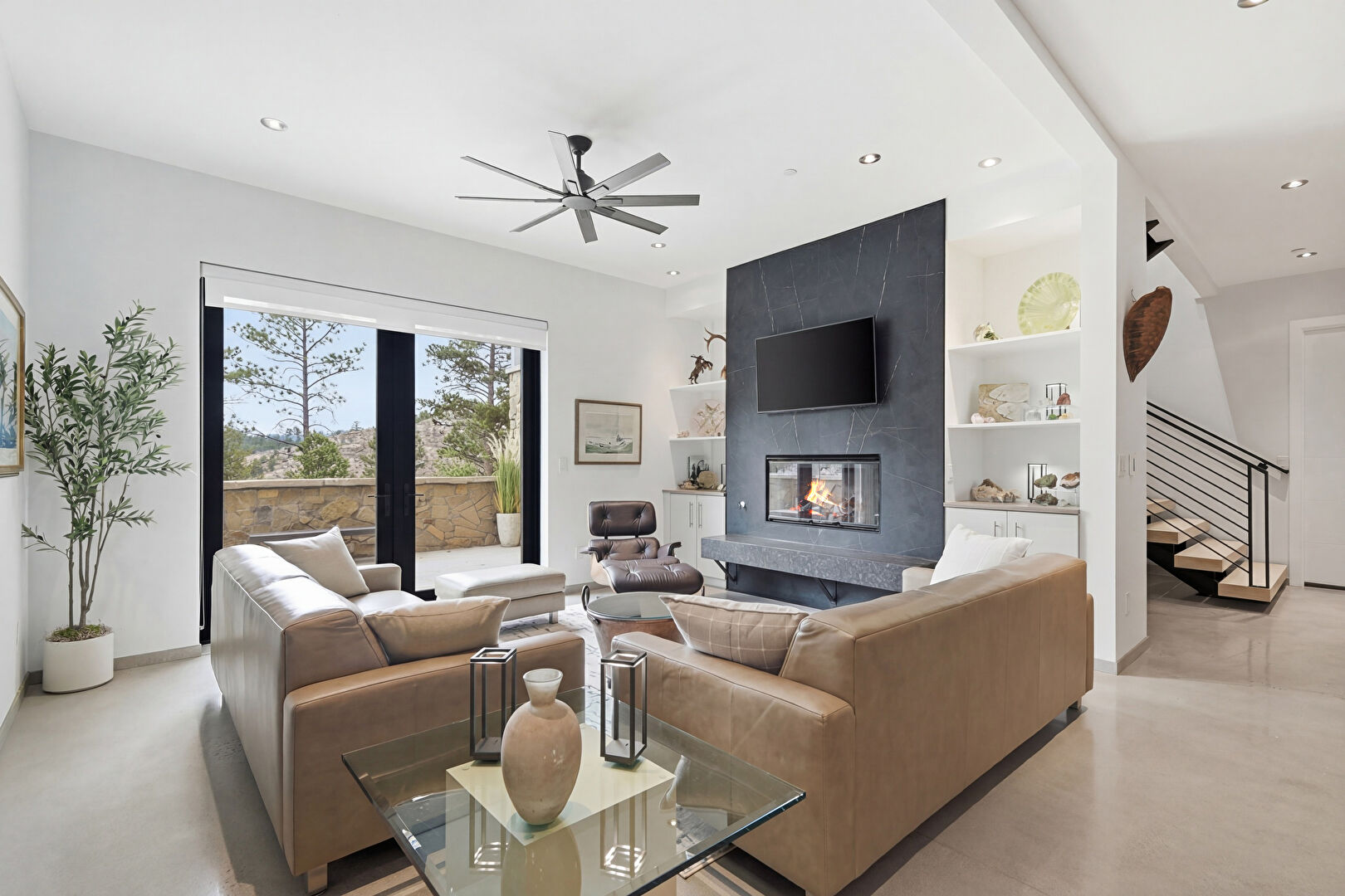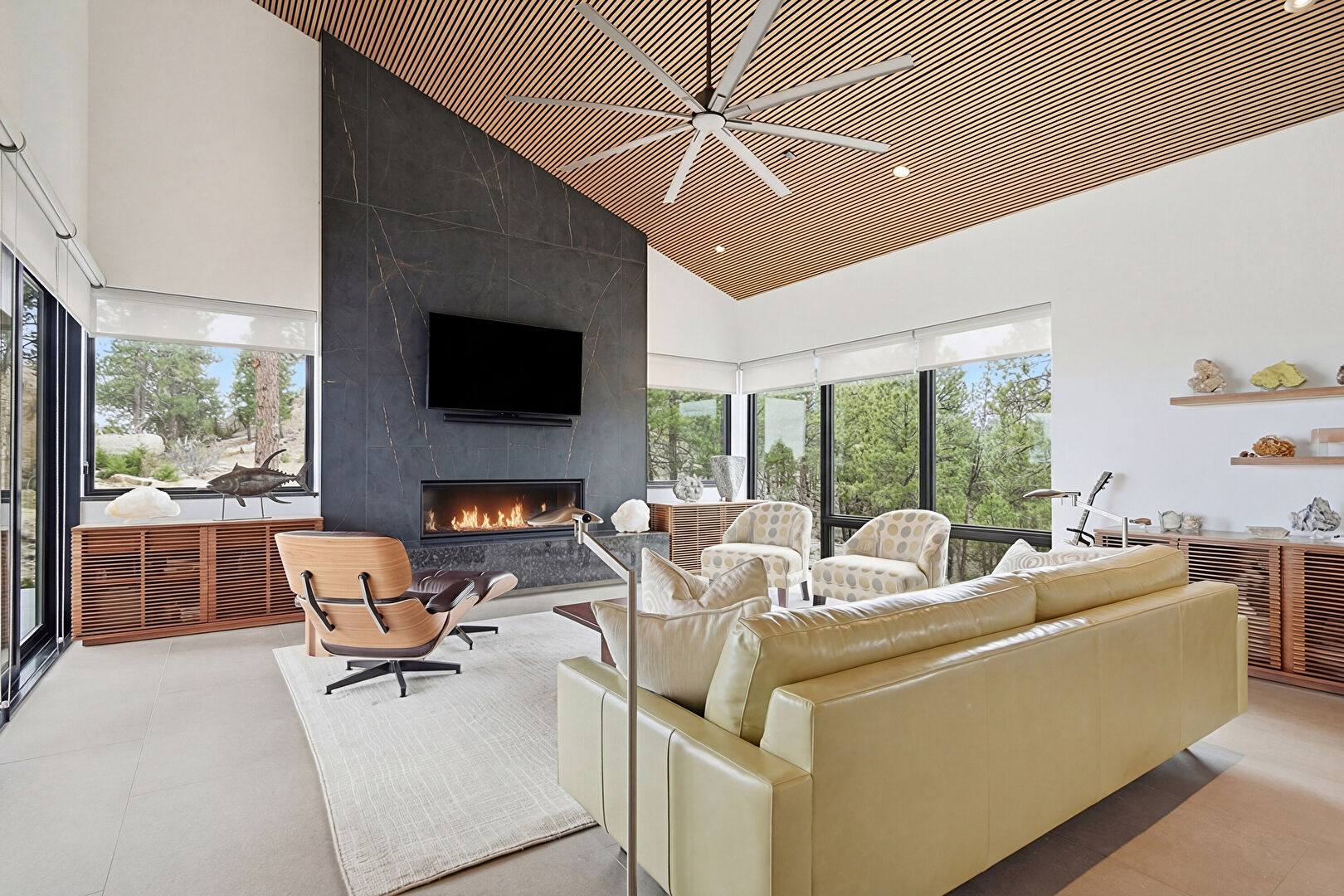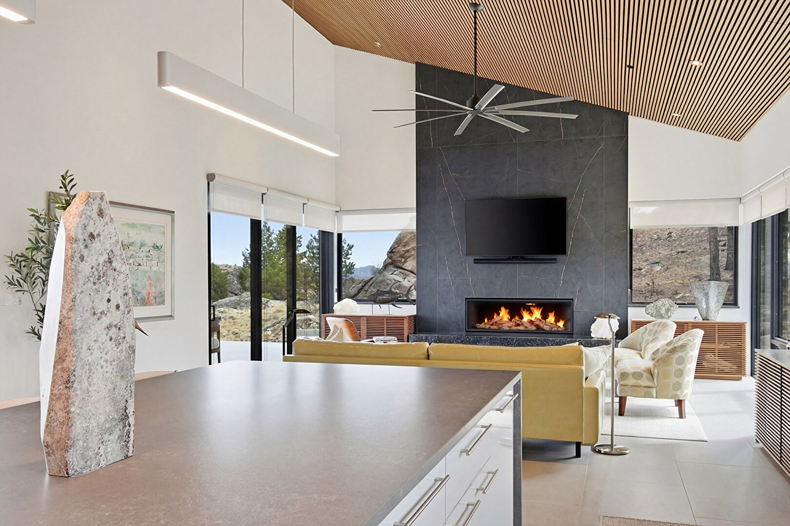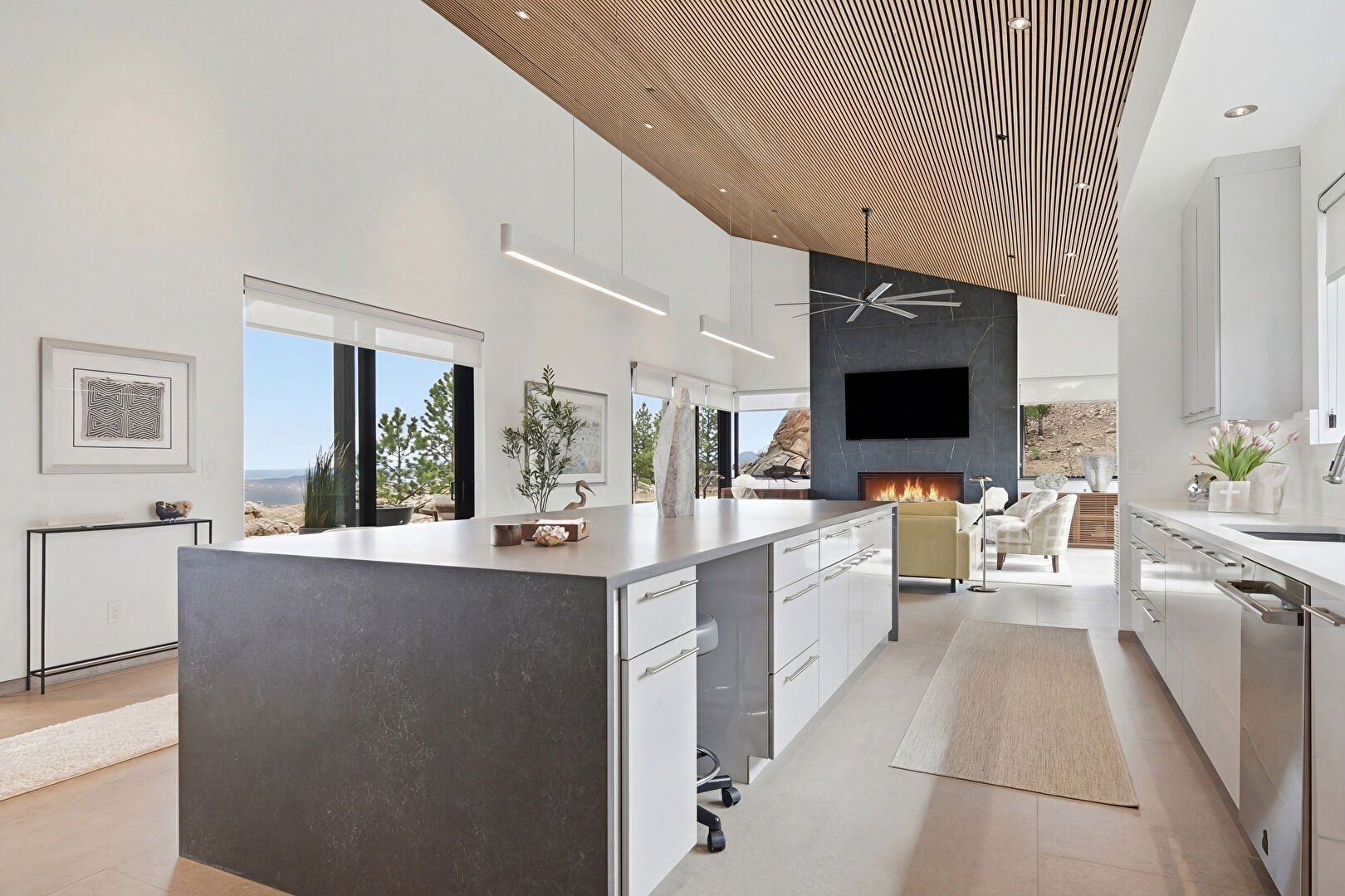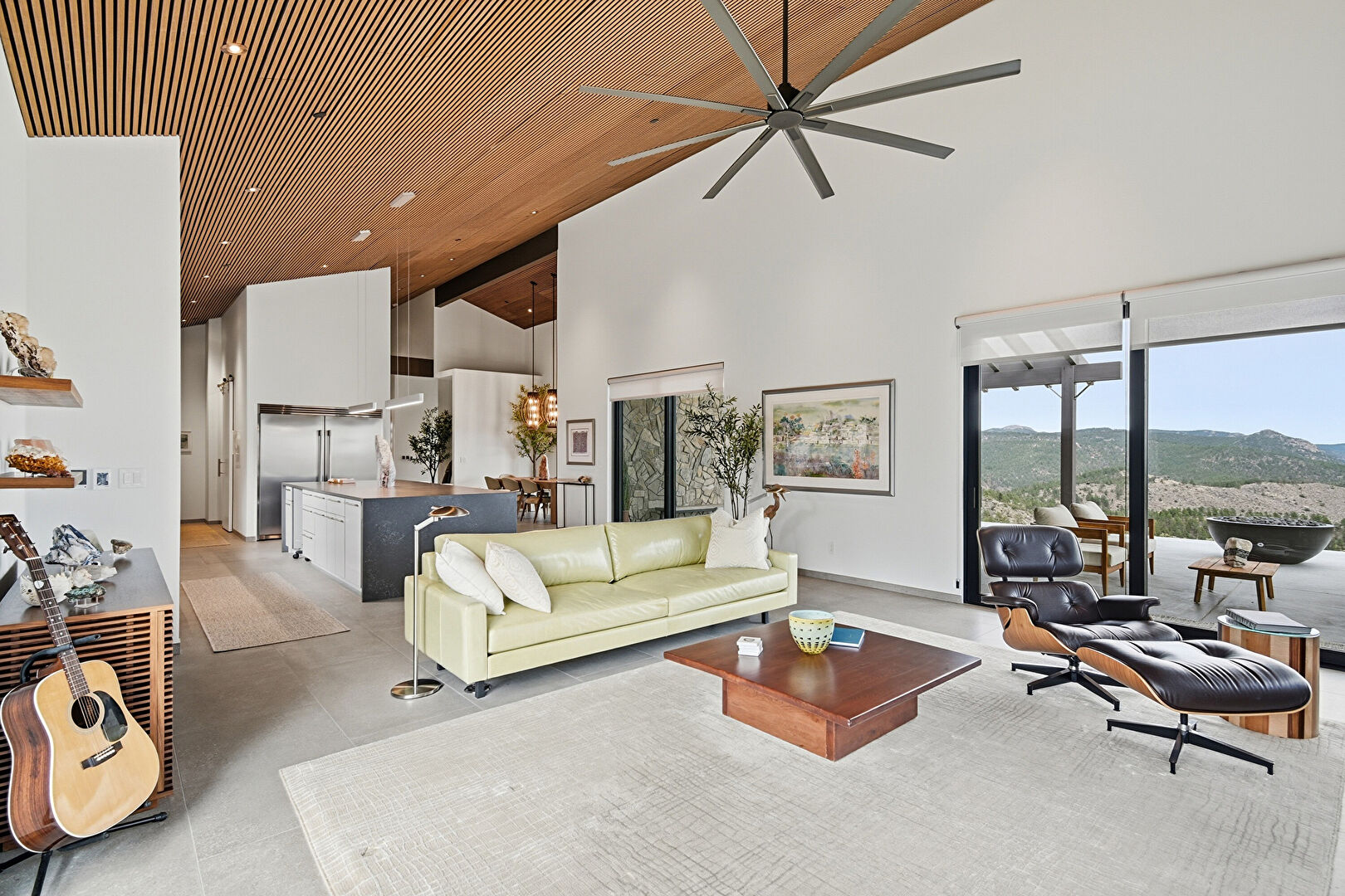 Baseboards Wall, Beamed Ceiling, Ceiling Fan, Concrete Floor, Drywall, Fireplace, High Ceiling, L Shaped Kitchen, Mountain View, Natural Light, Recessed Lighting, Vaulted Ceiling, Wood Ceiling, Baseboards Wall, Drywall, Fireplace, Natural Light, Vaulted Ceiling, Wood Ceiling