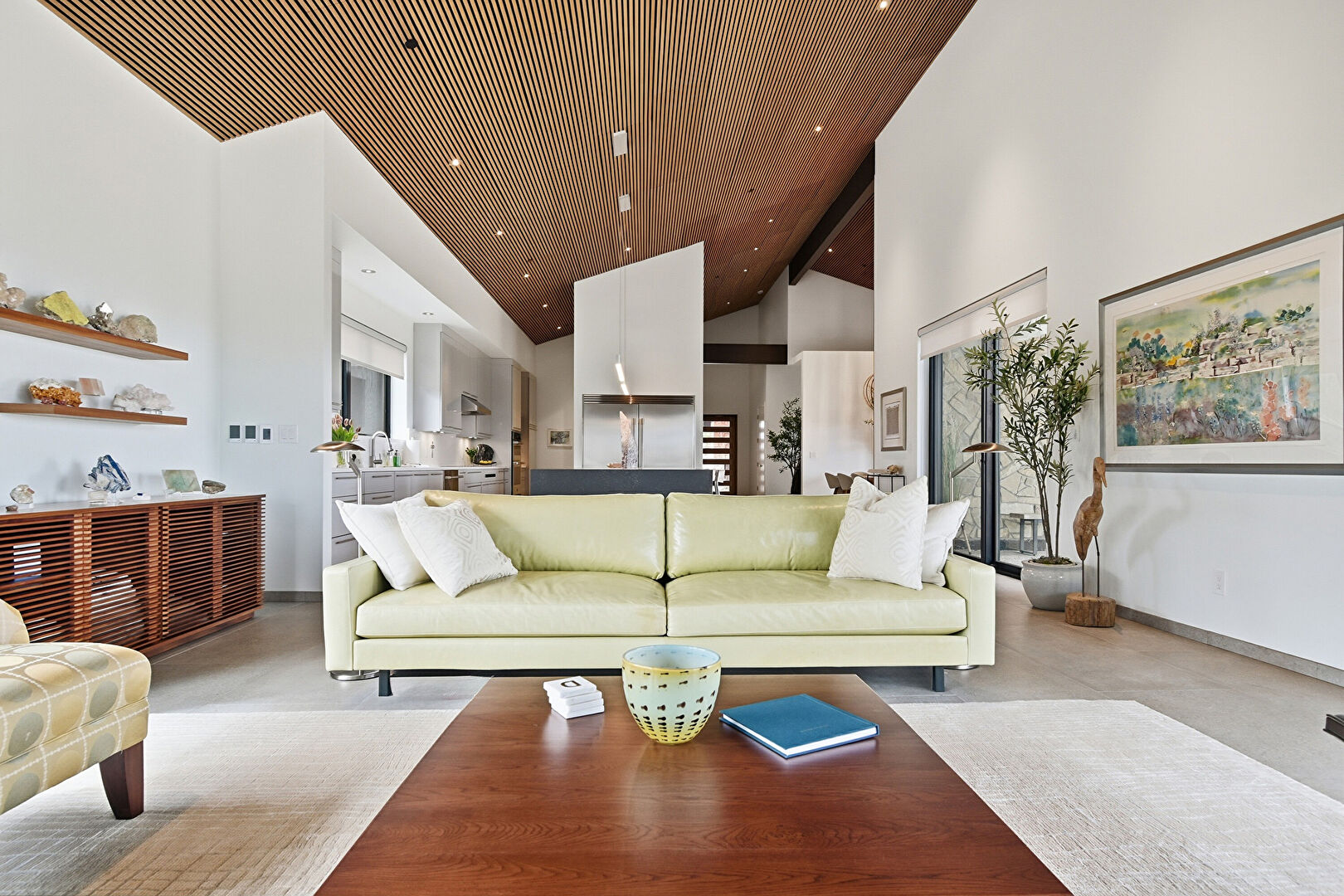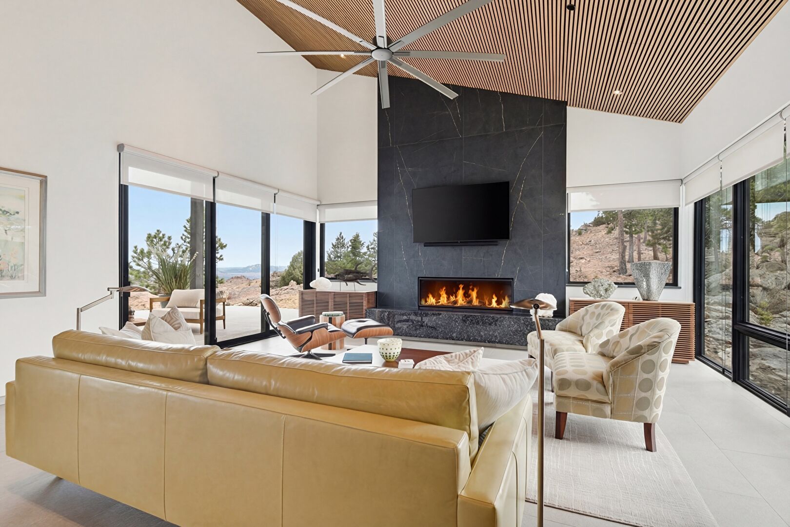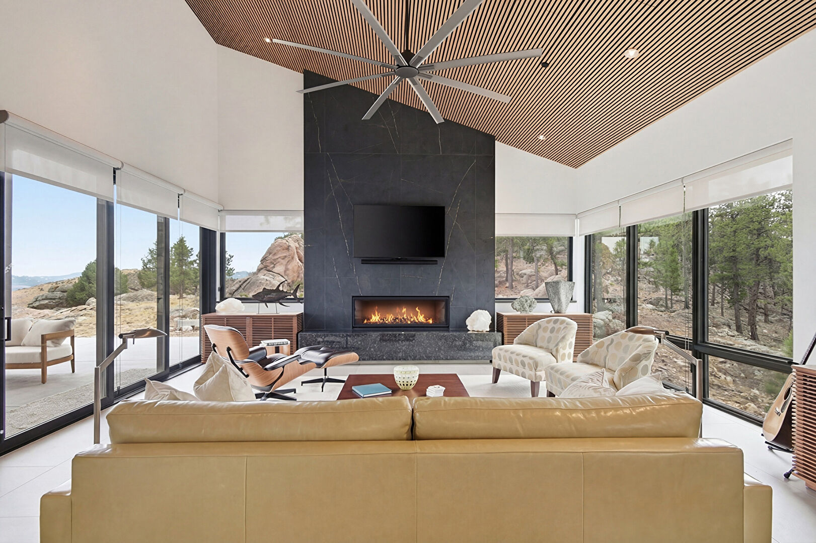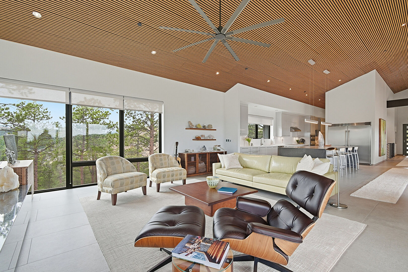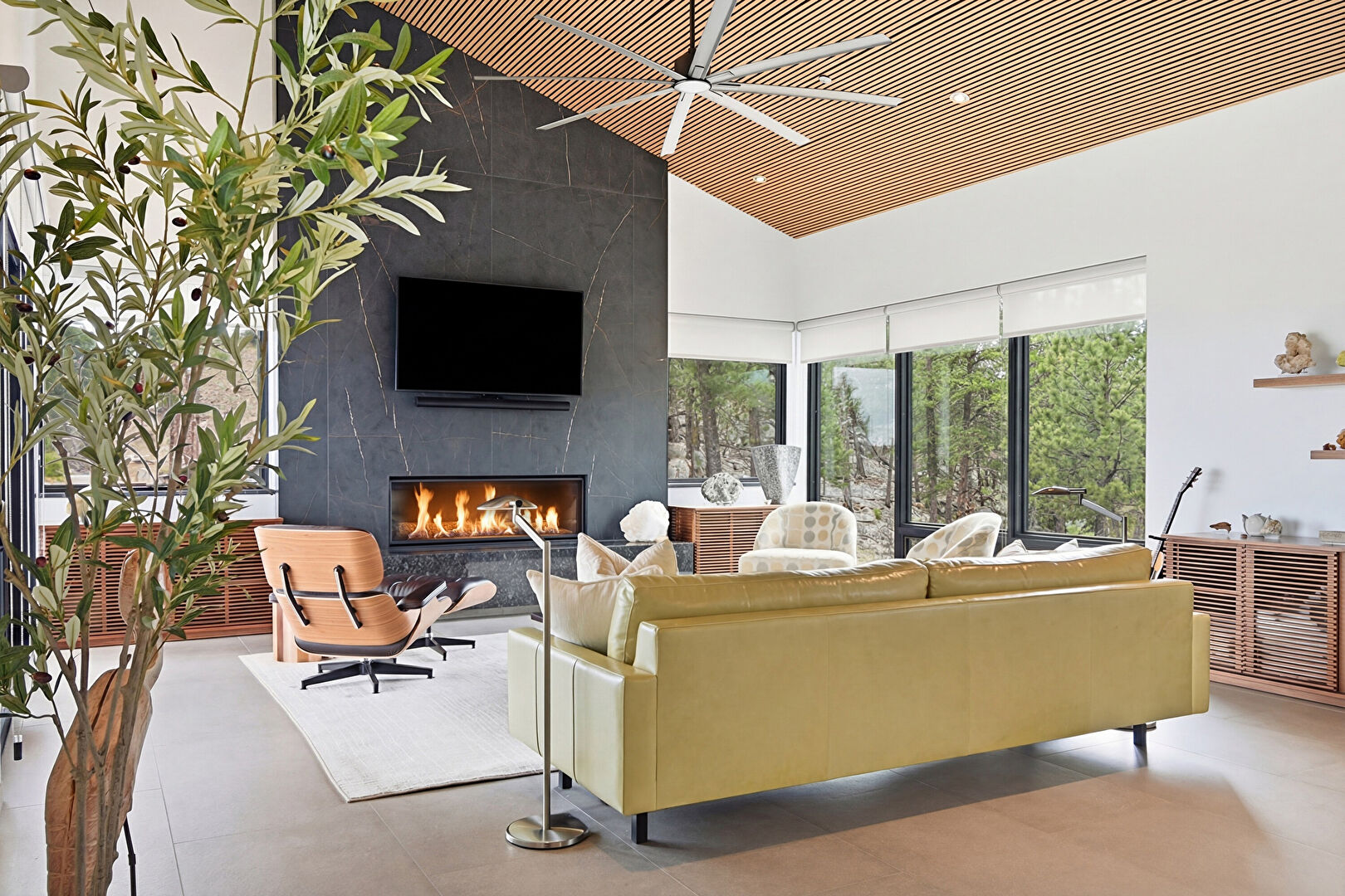 Baseboards Wall, Beamed Ceiling, Ceiling Fan, Concrete Floor, Drywall, Fireplace, High Ceiling, L Shaped Kitchen, Mountain View, Natural Light, Recessed Lighting, Vaulted Ceiling, Wood Ceiling, Baseboards Wall, Drywall, Fireplace, Natural Light, Vaulted Ceiling, Wood Ceiling