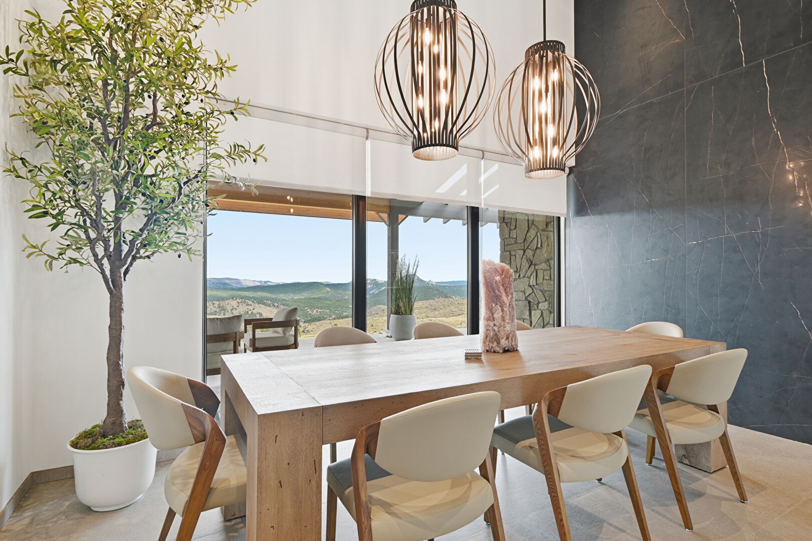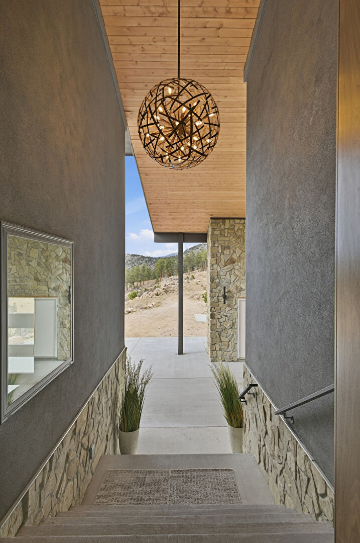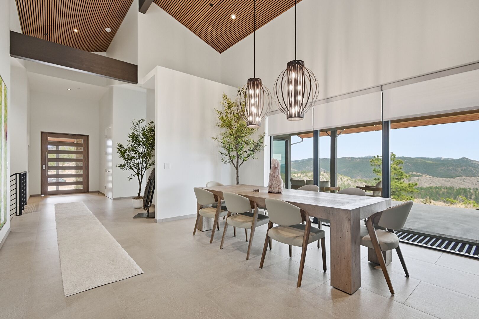 Baseboards Wall, Concrete Floor, Drywall, High Ceiling, Mountain View, Natural Light, Notable Chandelier, Recessed Lighting, Tile Wall, Vaulted Ceiling, Baseboards Wall, High Ceiling, Mountain View, Natural Light