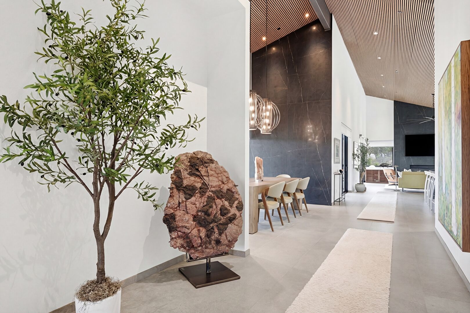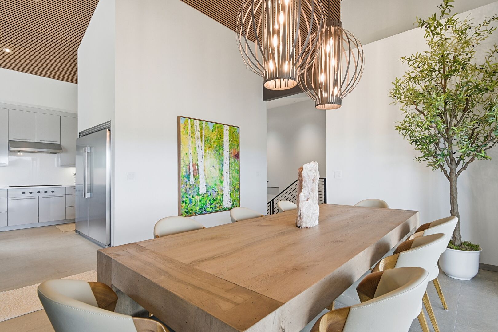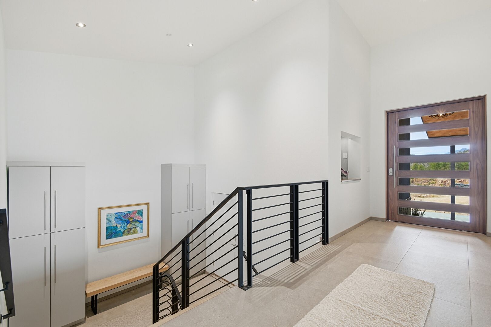 Baseboards Wall, Concrete Floor, Drywall, High Ceiling, Mountain View, Natural Light, Notable Chandelier, Recessed Lighting, Tile Wall, Vaulted Ceiling, Baseboards Wall, High Ceiling, Mountain View, Natural Light