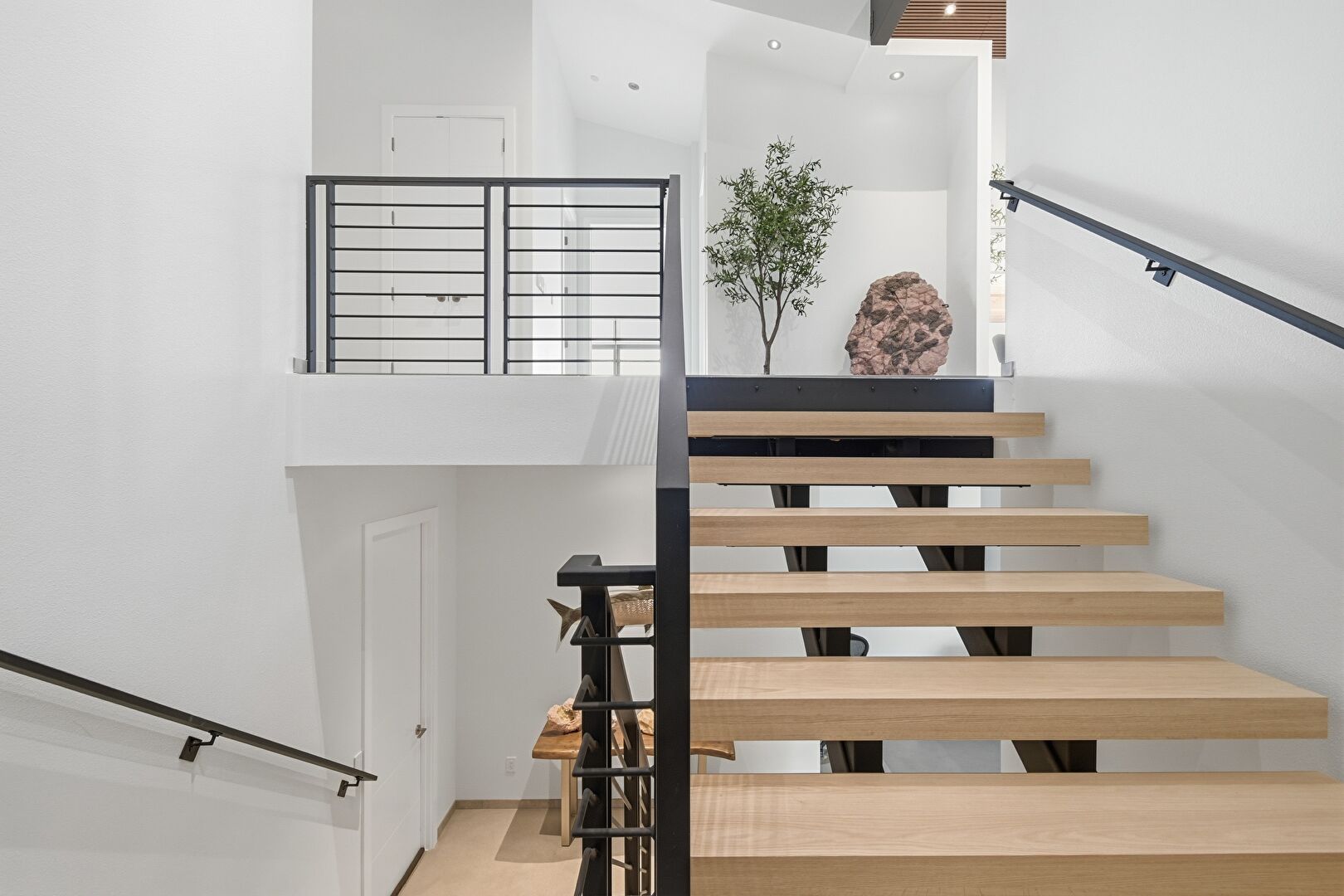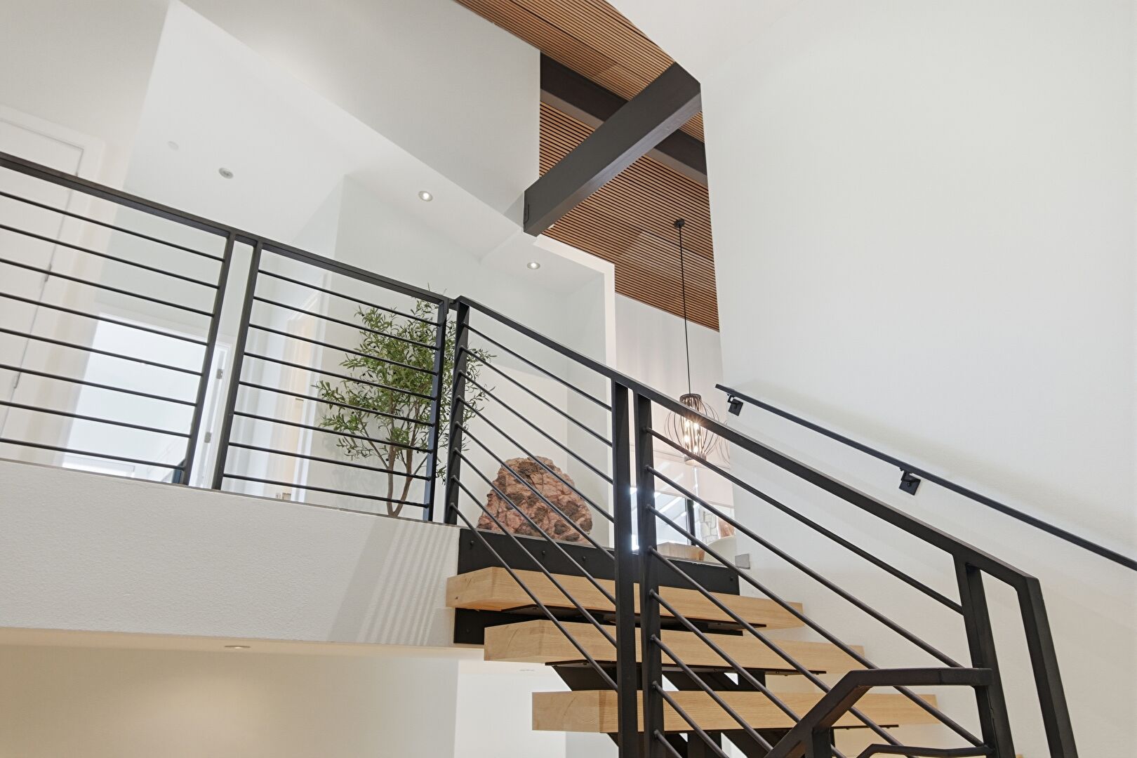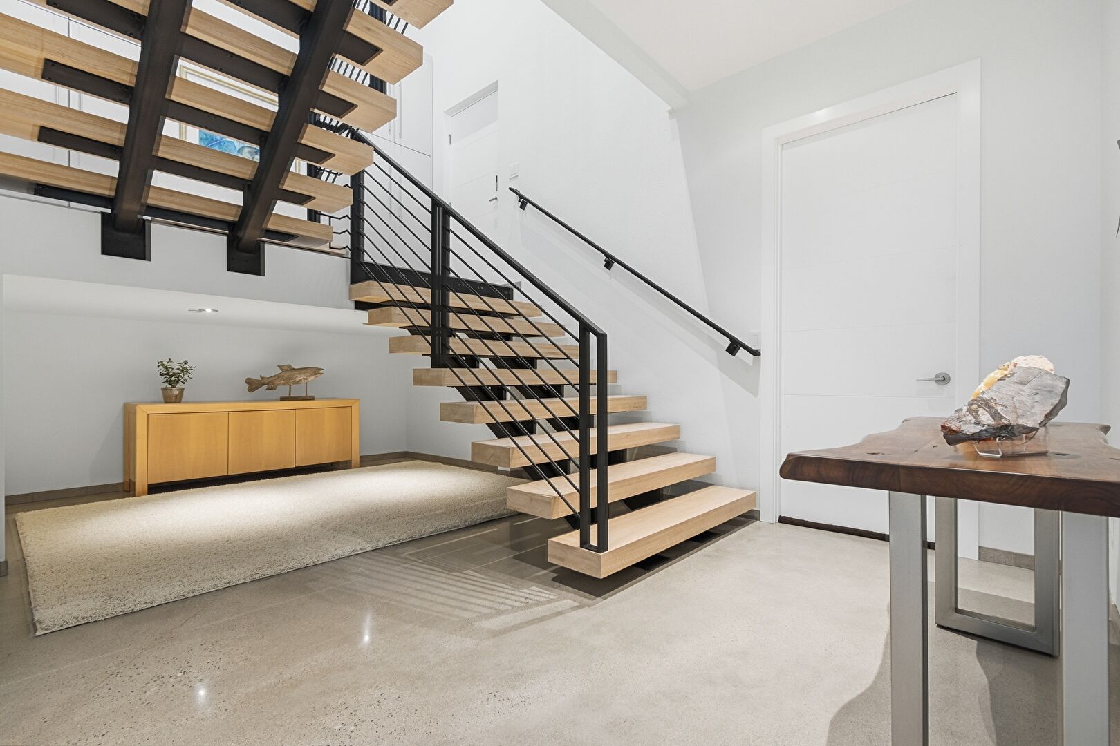 Baseboards Wall, Beamed Ceiling, Concrete Floor, Drywall, High Ceiling, Recessed Lighting, Stairs, Baseboards Wall, Drywall, Natural Light, Stairs