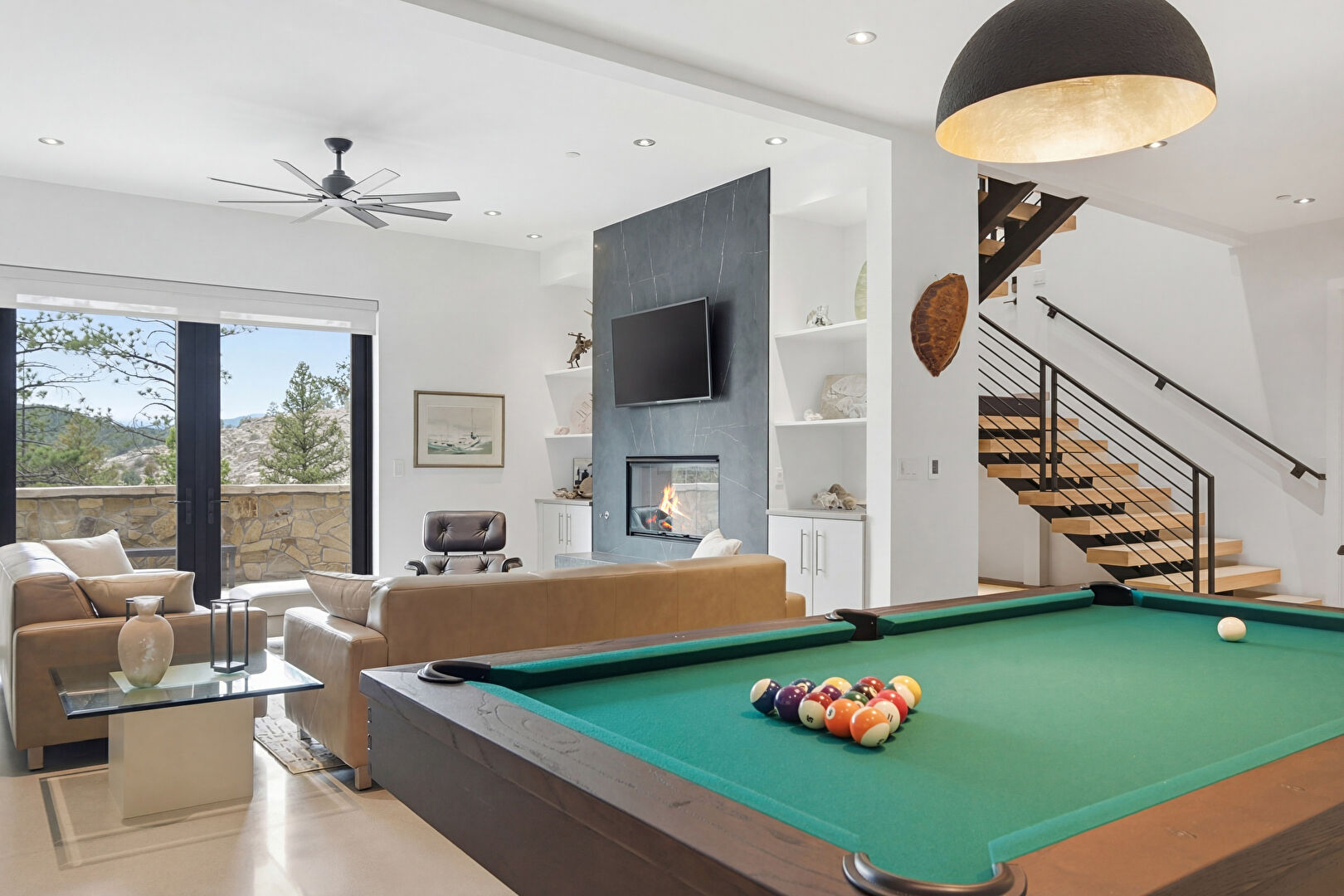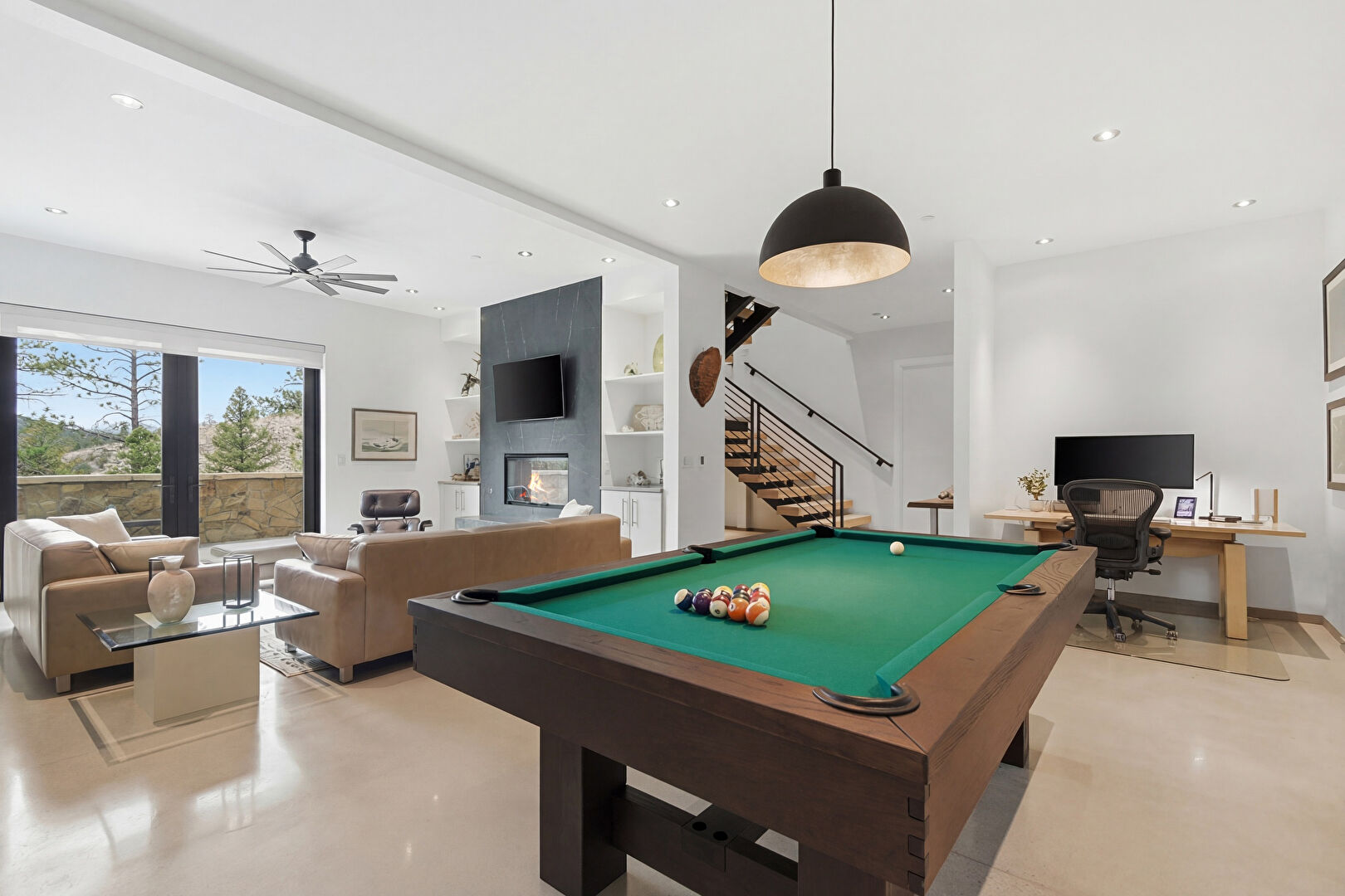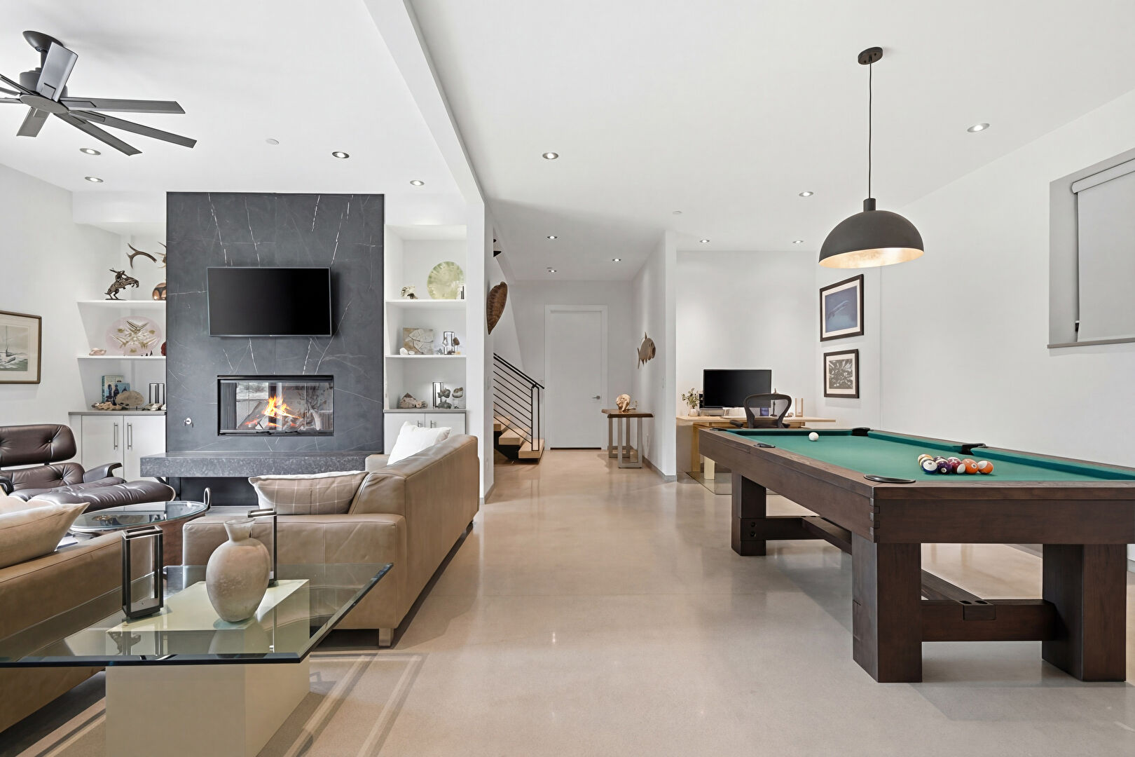 Baseboards Wall, Billiards, Built In Shelves, Ceiling Fan, Concrete Floor, Drywall, Fireplace, French Doors, Natural Light, Office Area, Recessed Lighting, Stairs, Wood Finish Floor, Billiards, Built In Shelves, Ceiling Fan, Drywall, Fireplace, Natural Light, Recessed Lighting