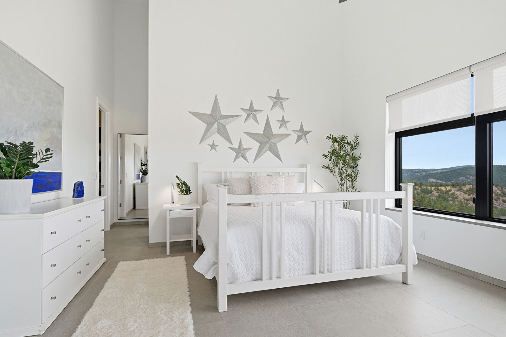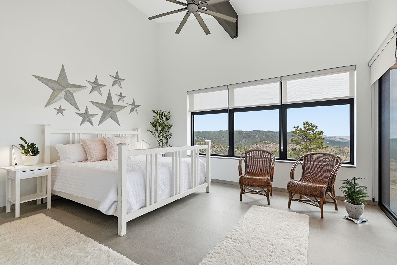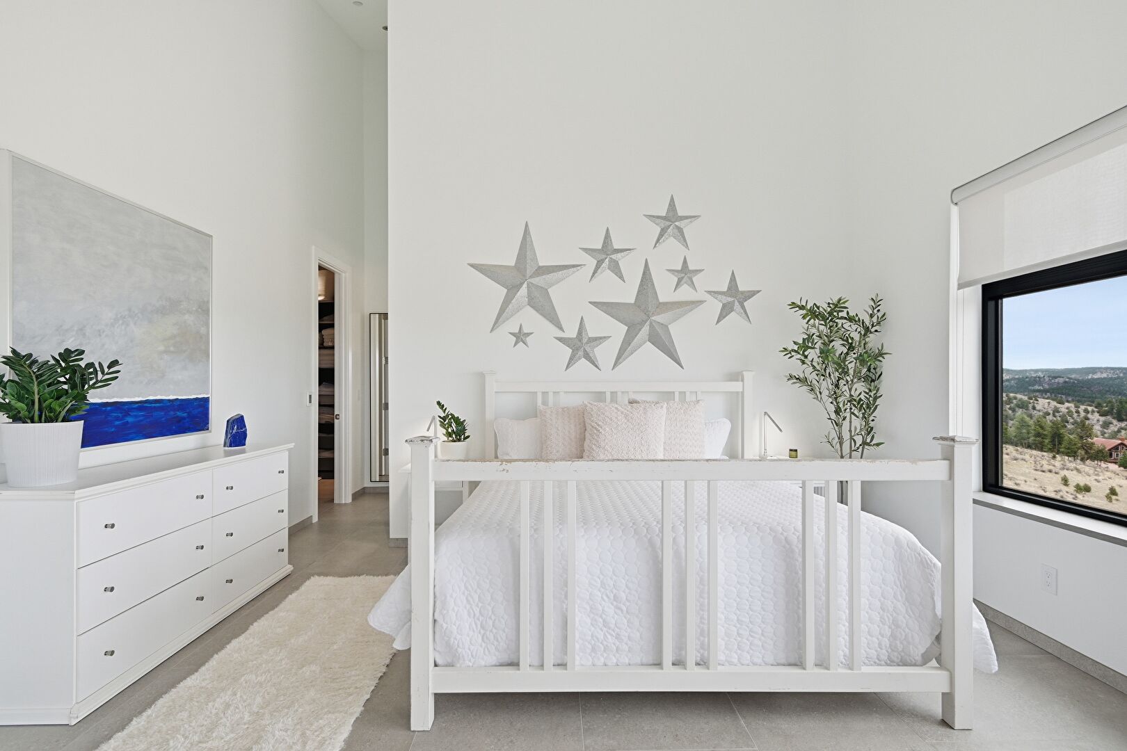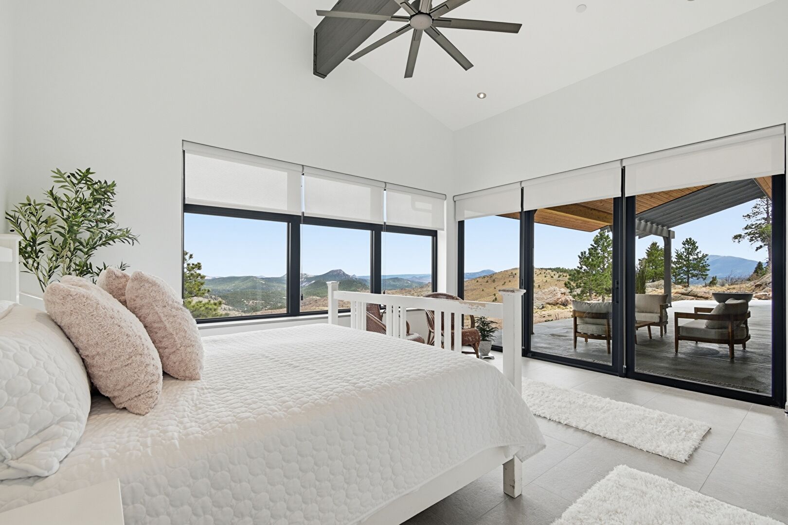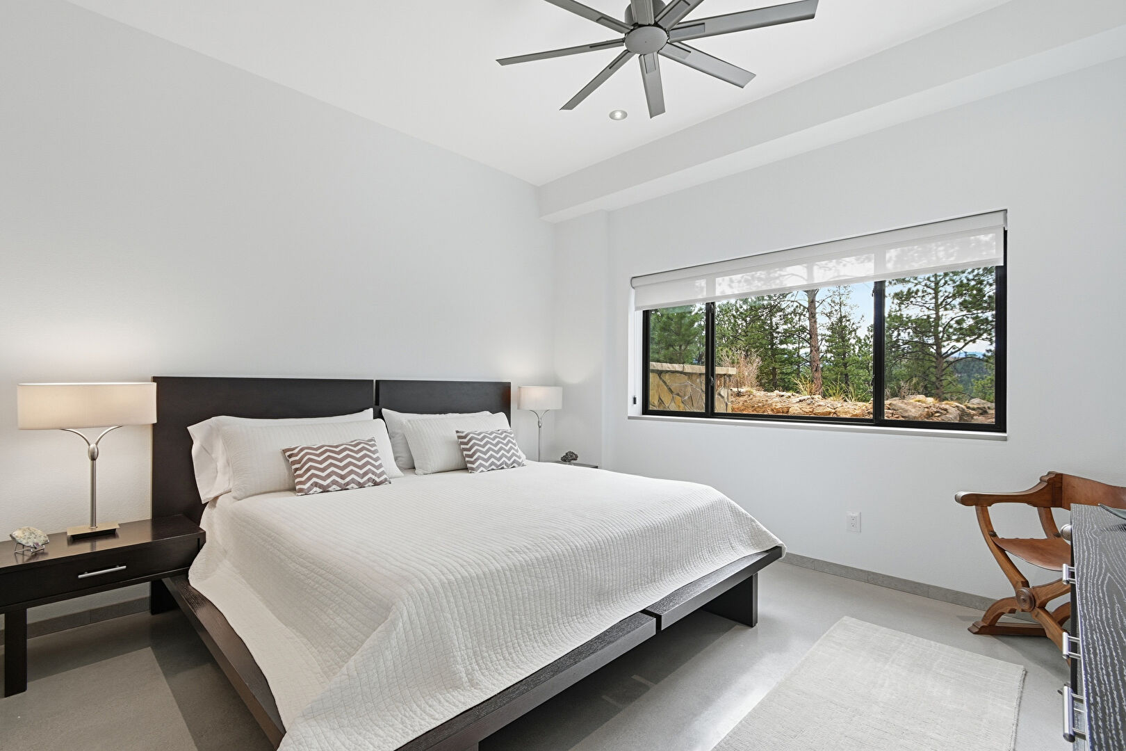 Access To Exterior, Barn Door, Baseboards Wall, Ceiling Fan, Concrete Floor, Drywall, High Ceiling, Mountain View, Natural Light, Recessed Lighting, Vaulted Ceiling, Vinyl Floor, Baseboards Wall, Drywall, Ensuite Bathroom, High Ceiling, Natural Light, Recessed Lighting