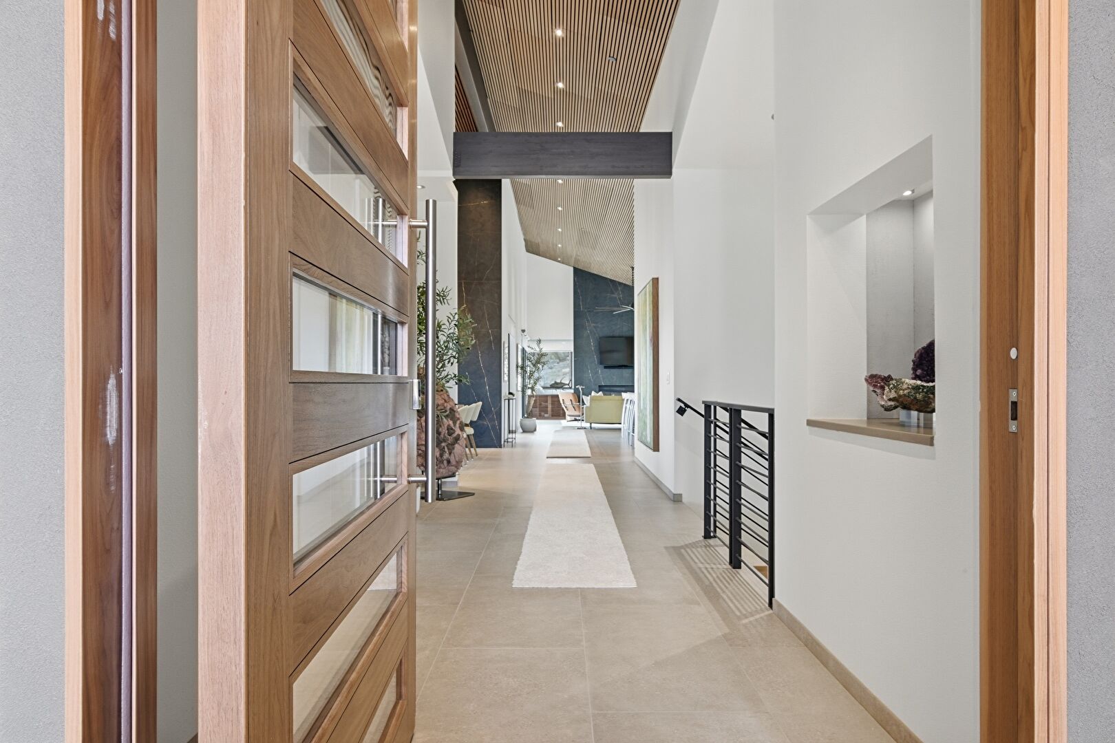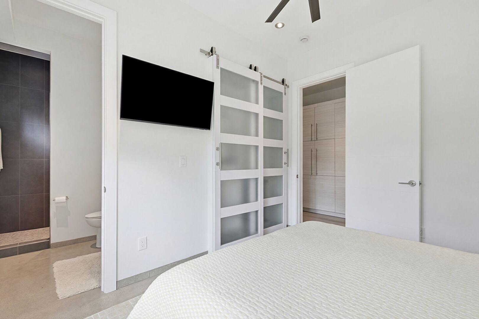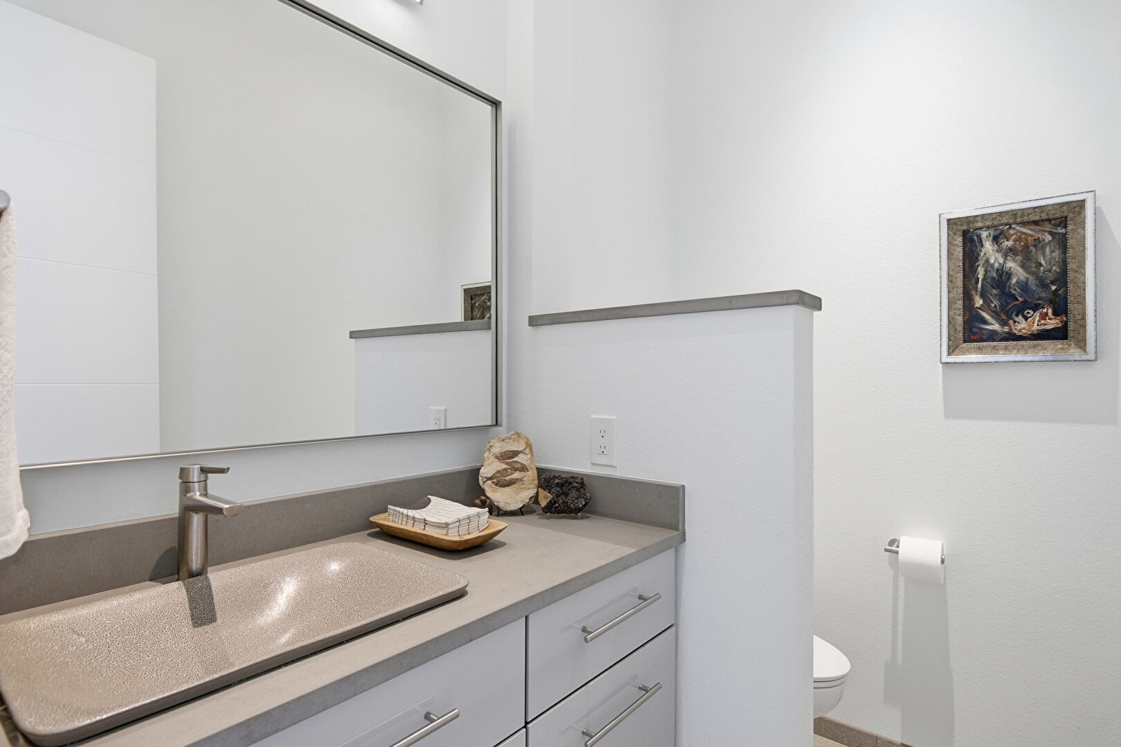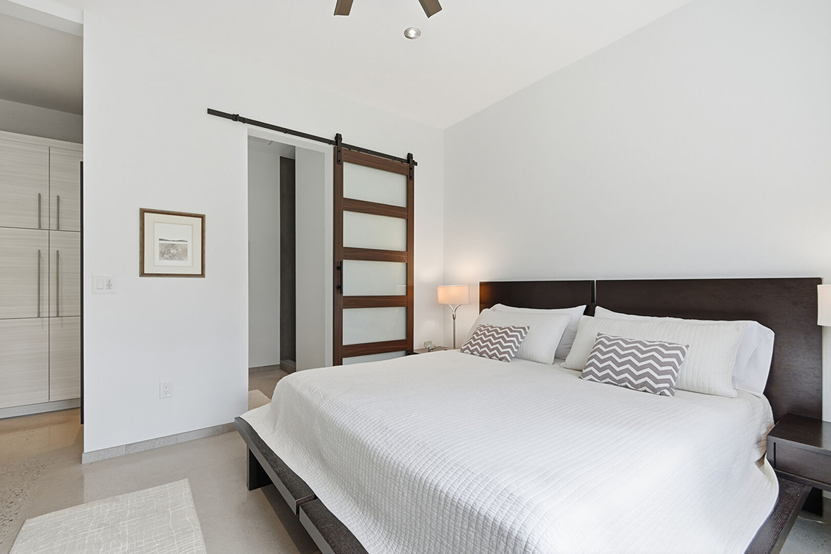 Access To Exterior, Barn Door, Baseboards Wall, Ceiling Fan, Concrete Floor, Drywall, High Ceiling, Mountain View, Natural Light, Recessed Lighting, Vaulted Ceiling, Vinyl Floor, Baseboards Wall, Drywall, Ensuite Bathroom, High Ceiling, Natural Light, Recessed Lighting